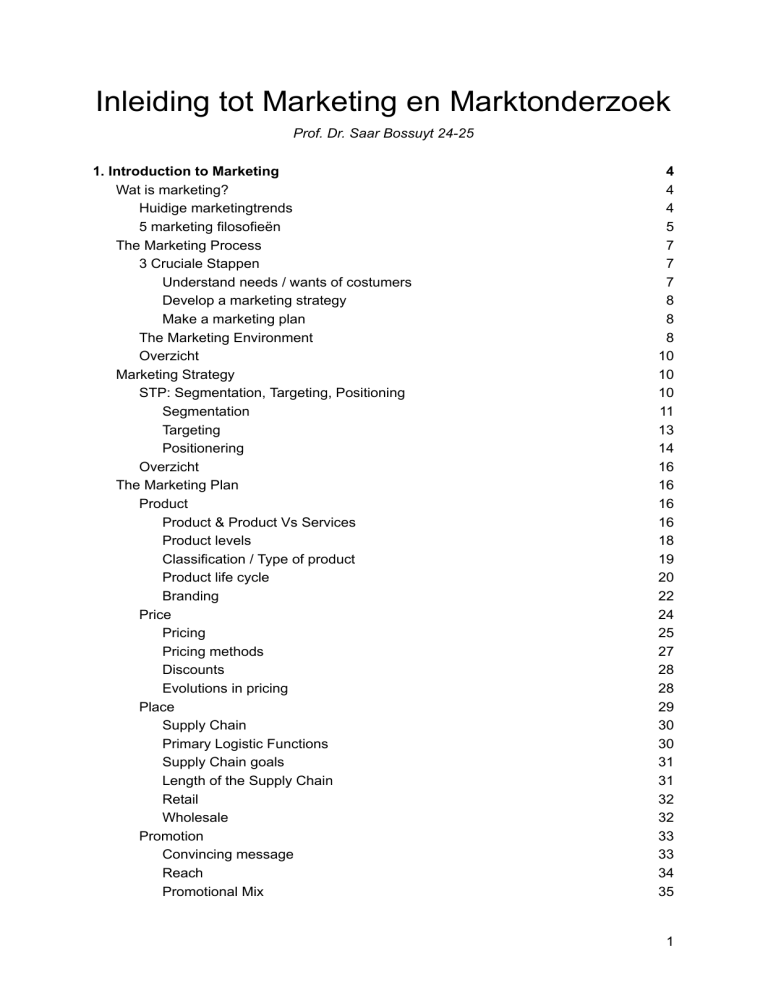 Inleiding tot Marketing en Marktonderzoek Prof. Dr. Saar Bossuyt 24-25 1. Introduction to Marketing Wat is marketing? Huidige marketingtrends 5 marketing filosofieën The Marketing Process 3 Cruciale Stappen Understand needs / wants of costumers Develop a marketing strategy Make a marketing plan The Marketing Environment Overzicht Marketing Strategy STP: Segmentation, Targeting, Positioning Segmentation Targeting Positionering Overzicht The Marketing Plan Product Product & Product Vs Services Product levels Classification / Type of product Product life cycle Branding Price Pricing Pricing methods Discounts Evolutions in pricing Place Supply Chain Primary Logistic Functions Supply Chain goals Length of the Supply Chain Retail Wholesale Promotion Convincing message Reach Promotional Mix 4 4 4 5 7 7 7 8 8 8 10 10 10 11 13 14 16 16 16 16 18 19 20 22 24 25 27 28 28 29 30 30 31 31 32 32 33 33 34 35 1 Advertising Sales promotion Public Relations Personal Sales Direct marketing Sponsoring Fairs, events, etc. Media Channels Overzicht 2. Introduction to Market Research Market research: what is it? Primary vs Secondary Data Secondary Data - Internal Secondary Data - External Primary Data Market Research Process Research Objectives Objectives of the Research Ex: Concept Test / New Product Development (NPD) test Ex: Pricing Research Ex: Shopper Research Quick Tangent: Costumer Journeys Ex: Advertisement Reach Ex: Brand Tracking Research General approach Goals Qualitative versus Quantitative Research methods Qualitative Research Methods Qualitative Research: Topic Guide Qualitative Research on Quantitative Scale Quantitative Research Methods: Surveys Other Types of Quantitative Research Methods Problems with Traditional Market Research Solutions Research method? Cases! Sample: Who? How many? How? Market Research Process Sample Sample: who? Sample: number? Number: Qualitative Research Number: Quantitative Research Margin of Error 36 37 37 38 38 38 39 39 39 41 41 41 42 42 43 43 43 44 44 44 45 45 45 46 46 46 47 47 47 47 48 48 49 49 50 52 53 53 53 54 54 54 55 55 2 Sample Number in Practice Sample: how? Sample: Who? Number? How? Cases! Reporting and presenting Information Processing Step 1: Planning Step 2: Construction Step 3: Presentation A summary A case 57 59 60 60 60 61 63 68 68 68 3 1. Introduction to Marketing Wat is marketing? = all activities that ensure that there is a profitable market for your product or service. a. attracting new customers: offer something they want b. keeping existing customers: keep them statistied marketing gaat dus om balans: - teveel beloven (overpromising): je zult klanten teleurstellen - te weinig beloven (underpromising): je zal geen klanten aantrekken Huidige marketingtrends ● Emotional experience bvb. Grappige commercials om product / service te linken aan positieve emoties. valkuil: Grappige aspect overwint en neemt aandacht weg van het product/.. bvb. ‘Sex sells’, ‘pikant’ reclames voor ongerelateerde goederen/producten zelfde valkuil Conclusie: Klanten binnenhalen aan de hand van emotionele content is vrij genuanceerd en niet zo gemakkelijk. In het ideale geval is de emotionele beleving direct gelinkt aan je product/service/… ● Neuromarketing = het gebruiken van inzichten in de werking van het menselijke brein in het maken van marketing beslissingen Deze evolutie is nog steeds aan de gang. Nieuw onderzoek wijst uit dat zelfs ‘negatieve’ emoties in advertenties ervoor kunnen zorgen dat de advertentie werkt. Een advertentie kan aanzien worden door de consument als irritant, maar dit zorgt voor brand awareness etc. waardoor sales toch groeien! bvb. ‘irritante’ reclames: Dovy Keukens met Donald Muylen. ● Big data = Het gebruik van datamining en AI om in te springen op trends, het bevorderen van een gebruikerservaring, etc bvb. Spotify/netflix aanbeveling algoritme op basis van ervoor bekeken titels 4 5 marketing filosofieën Marketing doorliep een grote evolutie doorheen de geschiedenis, element van alle types marketing bestaan vandaag nog steeds en worden gebruikt. Door conflict of interest tussen de bedrijven, klanten en de maatschappij moeten de ondernemingen kiezen waar ze op focussen. We identificeren 5 marketing filosofieën: 1. The production concept = De consument prefereert producten die available and affordable zijn, daarom moet de organisatie focussen op het improven van productie en efficiënte distributie. Deze filosofie is handig in 2 situaties: a. Wanneer vraag veel hoger is dan het aanbod. De organisatie vind dan manieren om de productie op te krikken. bvb. Tesla’s grootste uitdaging is de vraag volgen b. Wanneer de kosten om het product te maken te hoog zijn en de productie efficiënter moet verlopen om de kosten te verlagen. bvb. Henry Ford met de optimalisatie van auto-productie 2. The product concept = de consument prefereert producten van de beste kwaliteit, de beste prestatie of de meest innovatieve functies. De organisatie moet focussen op continue verbetering van productinnovatie. 3. The sales concept = Inside-out, selling what you make. Vaak van toepassing voor ongezochte goederen. De organisatie verkoopt wat ze produceren, niet produceren wat de markt wil. In dit geval is de vraag van klanten laag en de organisatie wordt gedreven door zeer actieve sales en promoties. bvb. Levensverzekeringen, encyclopedieën,... 4. The marketing concept = Outside-in, selling what people want. Gezochte goederen. bvb. Apple, Primark, Kruidvat,... 5 Dit concept is de inverse van het sales concept. De organisatie probeert te produceren wat de consument nodig heeft en wilt, de zogenaamde gezochte goederen. Organisaties die deze filosofie volgen steken veel tijd in het begrijpen van de markt en de consument. ! Soms kan een ongezocht goed een gezocht goed worden. bvb. Smartphones 5. The socially responsible marketing concept = Main question: organisaties die directe noden van de consument vervullen, doen ze ook wat best is voor de consument