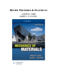 REV IEW PRO BLEM S & SO LUTIO N S JAMES M. G ERE BARRY J. G O O DNO Appendix A FE Exam Review Problems R-1.1: A plane truss has downward applied load P at joint 2 and another load P applied leftward at joint 5. The force in member 3–5 is: (A) 0 (B) ⫺P/2 (C) ⫺P (D) ⫹1.5 P Solution ⌺M1 ⫽ 0 V6 (3 L) ⫹ P L ⫺ P L ⫽ 0 so 3 5 P V6 ⫽ 0 Method of sections L Cut through members 3-5, 2-5 and 2-4; use right hand FBD 1 2 L L P ⌺M 2 ⫽ 0 6 4 L 5 P F35 L ⫹ P L ⫽ 0 3 F35 ⫽ ⫺P L 1 H1 V1 2 L P 6 4 L 5 L V6 P F35 F25 L 2 F24 4 6 L V6 1083 © 2013 Cengage Learning. All Rights Reserved. May not be scanned, copied or duplicated, or posted to a publicly accessible website, in whole or in part. 1084 APPENDIX A FE Exam Review Problems R-1.2: The force in member FE of the plane truss below is approximately: (A) ⫺1.5 kN (B) ⫺2.2 kN (C) 3.9 kN (D) 4.7 kN Solution 3m A 15 kN 3m B 10 kN 3m C 5 kN D 3m E 4.5 m F G 1m Statics ⌺MA ⫽ 0 Ey (6 m) ⫺ 15 kN (3 m) ⫺ 10 kN (6 m) ⫺ 5 kN (9 m) ⫽ 0 E y ⫽ 25 kN Ax A Ay 4.5 m G 3m B 15 kN 3m C 10 kN 3m 5 kN D 3m E F 1m Ey Method of sections: cut through BC, BE and FE; use right-hand FBD; sum moments about B 1 ⫺3 FFE (3 m) ⫺ FFE (3 m) ⫺ 10 kN (3 m) ⫺ 5 kN (6 m) ⫹Ey (3 m) ⫽ 0 110 110 Solving FFE ⫽ 5 110 kN 4 5 kN 10 kN B FFE ⫽ 3.95 kN 3 ·FFE 10 FFE 3m C D 3m E 1m ⫺ 1 ·FFE 10 Ey © 2013 Cengage Learning. All Rights Reserved. May not be scanned, copied or duplicated, or posted to a publicly accessible website, in whole or in part. 1085 APPENDIX A FE Exam Review Problems R-1.3: The moment reaction at A in the plane frame below is approximately: (A) ⫹1400 N⭈m (B) ⫺2280 N⭈m (C) ⫺3600 N⭈m (D) ⫹6400 N⭈m Solution 900 N 1.2 m 1200 N/m 900 N 1.2 m C B 3m 4m Pin connection Bx B C 3m By Cy A Statics: use FBD of member BC to find reaction C yy ⌺MB ⫽ 0 Cy ⫽ Cy (3 m) ⫺ 900 N (1.2 m) ⫽ 0 900 N (1.2 m) ⫽ 360 N 3m Sum moments about A for entire structure ⌺M A ⫽ 0 2 N 1 MA ⫹ Cy (3 m) ⫺ 900 N (1.2 m) ⫺ a1200 b 4 m a 4 mb ⫽ 0 m 2 3 Solving for MA M A ⫽ 6400 N⭈m 900 N 1.2 m 1200 N/m B C 3m Cy 4m MA A Ax Ay © 2013 Cengage Learning. All Rights Reserved. May not be scanned, copied or duplicated, or posted to a publicly accessible website, in whole or in part. 1086 APPENDIX A FE Exam Review Problems R-1.4: A hollow circular post ABC (see figure) supports a load P1 ⫽ 16 kN acting at the top. A second load P2 is uniformly distributed around the cap plate at B. The diameters and thicknesses of the upper and lower parts of the post are dAB ⫽ 30 mm, tAB ⫽ 12 mm, dBC ⫽ 60 mm, and tBC ⫽ 9 mm, respectively. The lower part of the post must have the same compressive stress as the upper part. The required magnitude of the load P2 is approximately: (A) 18 kN (B) 22 kN (C) 28 kN (D) 46 kN P1 Solution P1 ⫽ 16 kN dAB ⫽ 30 mm tAB ⫽ 12 mm dBC ⫽ 60 mm tBC ⫽ 9 mm p AAB ⫽ [dAB2 ⫺ (dAB ⫺ 2 tAB)2] ⫽ 679 mm2 4 A tAB dAB P2 B p ABC ⫽ [dBC2 ⫺ (dBC ⫺ 2 tBC)2] ⫽ 1442 mm2 4 Stress in AB: tBC P1 sAB ⫽ ⫽ 23.6 MPa AAB C P1 ⫹ P2 ⬍ must equal sAB ABC Stress in BC: sBC ⫽ Solve for P2 P2 ⫽ AB ABC ⫺ P1 ⫽ 18.00 kN Check: sBC ⫽ dBC P1 ⫹ P2 ⫽ 23.6 MPa ABC ⬍ same as in AB R-1.5: A circular aluminum tube of length L ⫽ 650 mm is loaded in compression by forces P. The outside and inside diameters are 80 mm and 68 mm, respectively. A strain gage on the outside of the bar records a normal strain in the longitudinal direction of 400 ⫻ 10⫺6. The shortening of the bar is approximately: (A) 0.12 mm (B) 0.26 mm (C) 0.36 mm (D) 0.52 mm Solution ⫽ 400 (10⫺6) L ⫽ 650 mm d ⫽ L ⫽ 0.260 mm © 2013 Cengage Learning. All Rights Reserved. May not be scanned, copied or duplicated, or posted to a publicly accessible website, in whole or in part. APPENDIX A FE Exam Review Problems 1087 Strain gage P P L R-1.6: A steel plate weighing 27 kN is hoisted by a cable sling that has a clevis at each end. The pins through the clevises are 22 mm in diameter. Each half of the cable is at an angle of 35⬚ to the vertical. The average shear stress in each pin is approximately: (A) 22 MPa (B) 28 MPa (C) 40 MPa (D) 48 MPa Solution W ⫽ 27 kN dp ⫽ 22 mm ⫽ 35⬚ Cross sectional area of each pin: p Ap ⫽ d p2 ⫽ 380 mm2 4 P Cable sling Tensile force in cable: W a b 2 T⫽ ⫽ 16.48 kN cos(u) Shear stress in each clevis pin (double shear): T ⫽ 21.7 MPa t⫽ 2 AP 35° 35° Clevis Steel plate R-1.7: A steel wire hangs from a high-altitude balloon. The steel has unit weight 77kN/m3 and yield stress of 280 MPa. The required factor of safety against yield is 2.0. The maximum permissible length of the wire is approximately: (A) 1800 m (B) 2200 m (C) 2600 m (D) 3000 m © 2013 Cengage Learning. All Rights Reserved. May not be scanned, copied or duplicated, or posted to a publicly accessible website, in whole or in part. 1088 APPENDIX A FE Exam Review Problems Solution g ⫽ 77 kN m3 Y ⫽ 280 MPa sallow ⫽ Allowable stress: Weight of wire of length L: sY ⫽ 140.0 MPa FSY W ⫽ ␥ AL Max. axial stress in wire of length L: Lmax ⫽ Max. length of wire: FSY ⫽ 2 smax ⫽ W A max ⫽ ␥ L sallow ⫽ 1818 m g R-1.8: An aluminum bar (E ⫽ 72 GPa, ⫽ 0.33) of diameter 50 mm cannot exceed a diameter of 50.1 mm when compressed by axial force P. The maximum acceptable compressive load P is approximately: (A) 190 kN (B) 200 kN (C) 470 kN (D) 860 kN Solution E ⫽ 72 GPa dinit ⫽ 50 mm dfinal ⫽ 50.1 mm dfinal ⫺ dinit dinit L ⫽ 0.002 Lateral strain: L ⫽ Axial strain: a ⫽ Axial stress: ⫽ Ea ⫽ ⫺436.4 MPa ⫽ 0.33 ⫺L ⫽ ⫺0.006 n ⬍ below yield stress of 480 MPa so Hooke’s Law applies Max. acceptable compressive load:R p Pmax ⫽ s a dinit2b ⫽ 857 kN 4 R-1.9: An aluminum bar (E ⫽ 70 GPa, ⫽ 0.33) of diameter 20 mm is stretched by axial forces P, causing its diameter to decrease by 0.022 mm. The load P is approximately: (A) 73 kN (B) 100 kN (C) 140 kN (D) 339 kN © 2013 Cengage Lear