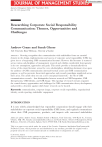 Journal of Management Studies 53:7 November 2016 doi: 10.1111/joms.12196 Researching Corporate Social Responsibility Communication: Themes, Opportunities and Challenges Andrew Crane and Sarah Glozer York University; Royal Holloway, University of London ABSTRACT Growing recognition that communication with stakeholders forms an essential element in the design, implementation and success of corporate social responsibility (CSR) has given rise to a burgeoning CSR communication literature. However this literature is scattered across various sub-disciplines of management research and exhibits considerable heterogeneity in its core assumptions, approaches and goals. This article provides a thematically-driven review of the extant literature across five core sub-disciplines, identifying dominant views upon the audience of CSR communication (internal/external actors) and CSR communication purpose, as well as pervasive theoretical approaches and research paradigms manifested across these areas. The article then sets out a new conceptual framework – the 4Is of CSR communication research – that distinguishes between research on CSR Integration, CSR Interpretation, CSR Identity, and CSR Image. This typology of research streams organizes the central themes, opportunities and challenges for CSR communication theory development, and provides a heuristic against which future research can be located. Keywords: communication, corporate image, corporate social responsibility, organizational identity, social reporting, stakeholder engagement INTRODUCTION It is now widely acknowledged that responsible corporations should engage with their stakeholders on corporate social responsibility (CSR) issues, and regularly communicate about their CSR programmes, products, and impacts with concerned stakeholders Address for reprints: Andrew Crane, Schulich School of Business, York University, 4700 Keele St., Toronto, Ontario, M3J 1P3, Canada (acrane@schulich.yorku.ca) and Sarah Glozer, School of Management, Royal Holloway, University of London, Egham, Surrey TW20 0EX, UK (Sarah.Glozer@royalholloway.ac.uk). This is an open access article under the terms of the Creative Commons Attribution-NonCommercialNoDerivs License, which permits use and distribution in any medium, provided the original work is properly cited, the use is non-commercial and no modifications or adaptations are made. C 2016 The Authors V Journal of Management Studies published by John Wiley & Sons Ltd and Society for the Advancement of Management Studies A. Crane and S. Glozer (Du et al., 2010). This has included communication on products and in advertisements, in corporate social responsibility reports, and also through stakeholder engagement initiatives. CSR communication is regarded as critical for everything from convincing consumers to reward responsible companies (Bhattacharya and Sen, 2004), influencing corporate accountability (Archel et al., 2011), to enabling managers and other stakeholders to make sense of the world (Basu and Palazzo, 2008). As corporate responsibilities have increasingly expanded due to heightened stakeholder expectations in a globalized economy (Scherer and Palazzo, 2009, 2011), the way in which organizations communicate with their stakeholders through CSR communication has become a subject of intense scrutiny. Interest in such phenomena has thus given rise to a burgeoning, multi-disciplinary literature that has sought to reveal the role of communications of various kinds between firms and their stakeholders in shaping CSR meanings, expectations and practices (Basu and Palazzo, 2008; Bhattacharya et al., 2011; Swaen and Vanhamme, 2005). There is then, by now, a well-established literature concerned with CSR communication across management disciplines. Theoretical advances have been made in understanding how stakeholders can be informed, responded to, and involved in CSR strategy construction and execution (Morsing and Schultz, 2006), while empirical research has sought to ‘make sense of CSR communication’ (Ziek, 2009) in the context of new communication technologies, diminishing traditional political influences, and globalisation challenges that continue to change the face of corporate-stakeholder interaction (Scherer and Palazzo, 2009). At this critical conjecture, CSR communication is in a ‘kind of transition’ (Schneider et al., 2007). That is, traditional, one-way CSR communication tools are increasingly being complemented by ‘Web 2.0’ bidirectional and symmetrical communication channels, which blur the boundaries between the senders and receivers of CSR information and transform organization-stakeholder interaction (Capriotti, 2011). Given this shifting context, scholars have sought to understand how CSR communication can build legitimacy (Bebbington et al., 2008), support the development of trusting relationships with stakeholders (Coombs and Holladay, 2012), communicate the abstract and intangible characteristics of an organization (Schlegelmilch and Pollack, 2005), provide true and transparent information to an increasingly vocal stakeholder movement (Podnar, 2008), and develop successful CSR communication campaigns that exploit the web 2.0 tools such as blogs (Fieseler et al., 2010), websites (Capriotti, 2011) and online discourse (Unerman and Bennett, 2004). However, the theoretical and practical impact of this work has thus far been limited by a highly fragmented literature that is poorly integrated and lacks much by way of common assumptions, frameworks, or theories. All this suggests that CSR communication as a unified field is an embryonic notion (Maignan and Ferrell, 2004; Morsing, 2006). Indeed, while much of the CSR literature within management studies is conceptually related to the field of communication, e.g., disclosure, reporting, reputation, etc., there is not so much a distinctive or unified CSR communication literature but rather a heterogeneous collection of literatures across disparat
