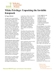 White Privilege: Unpacking the Invisible Knapsack By Peggy McIntosh Through work to bring materials from Women’s Studies into the rest of the curriculum, I have often noticed men’s unwillingness to grant that they are over-privileged, even though they may grant that women are disadvantaged. They may say they will work to improve women’s status, in the society, the university, or the curriculum, but they can’t or won’t support the idea of lessening men’s. Denials which amount to taboos surround the subject of advantages which men gain from women’s disadvantages. These denials protect male privilege from being fully acknowledged, lessened or ended. Thinking through unacknowledged male privilege as a phenomenon, I realized that, since hierarchies in our society are interlocking, there was most likely a phenomenon of white privilege that was similarly denied and protected. As a white person, I realized I had been taught about racism as something that puts others at a disadvantage, but had been taught not to see one of its corollary aspects, white privilege, which puts me at an advantage. I think whites are carefully taught not to recognize white privilege, as males are taught not to recognize male privilege. So I have begun in an untutored way to ask what it is like to have white privilege. I have come to see white privilege as an invisible package of unearned assets that I can count on cashing in each day, but about which I was “meant” to remain oblivious. White privilege is like an invisible weightless knapsack of special provisions, maps, passports, codebooks, visas, clothes, tools and blank checks. Describing white privilege makes one newly accountable. As we in Women’s Studies work to reveal male privilege and ask men to give up some of their power, so one who writes about white privilege must ask, “Having described it, what will I do to lessen or end it?” After I realized the extent to which men work from a base of unacknowledged privilege, I understood that much of their oppressiveness was unconscious. Then I remembered the frequent charges from women of color that white women whom they encounter are oppressive. I began to understand why we are justly seen as oppressive, even when we don’t see ourselves that way. I began to count the ways in which I enjoy unearned skin privilege and have been conditioned into oblivion about its existence. I was taught to see racism only in individual acts of meanness, not in invisible systems conferring dominance on my group. My schooling gave me no training in seeing myself as an oppressor, as an unfairly advantaged person, or as a participant in a damaged culture. I was taught to see myself as an individual whose moral state depended on her individual moral will. My schooling followed the pattern my colleague Elizabeth Minnich has pointed out: whites are taught to think of their lives as morally neutral, normative, and average, and also ideal, so that when we work to benefit others, this is seen as work which will allow “them” to be more like “us.” I decided to try to work on myself at least by identifying some of the daily effects of white privilege in my life. I have chosen those conditions which I think in my case attach somewhat more to skin-color privilege than to class, religion, ethnic status, or geographic location, though of course all these other factors are intricately intertwined. As far as I can see, my African American coworkers, friends, and acquaintances with whom I come “Some Notes for Facilitators” © 2010 Peggy McIntosh “Unpacking the Invisible Knapsack” © 1989 Peggy McIntosh into daily or frequent contact in this particular time, place and line of work cannot count on most of these conditions. 1. I can if I wish arrange to be in the company of people of my race most of the time. 2. If I should need to move, I can be pretty sure of renting or purchasing housing in an area which I can afford and in which I would want to live. 3. I can be pretty sure that my neighbors in such a location will be neutral or pleasant to me. 4. I can go shopping alone most of the time, pretty well assured that I will not be followed or harassed. 5. I can turn on the television or open to the front page of the paper and see people of my race widely represented. 6. When I am told about our national heritage or about “civilization,” I am shown that people of my color made it what it is. 7. I can be sure that my children will be given curricular materials that testify to the existence of their race. 8. If I want to, I can be pretty sure of finding a publisher for this piece on white privilege. 9. I can go into a music shop and count on finding the music of my race represented, into a supermarket and find the staple foods that fit with my cultural traditions, into a hairdresser’s shop and find someone who can cut my hair. p. 2 singled out because of my race. 10. Whether I use checks, credit cards or cash, I can count on my skin color not to work against the appearance of financial reliability. 20. I can easily buy posters, postcards, picture books, greeting cards, dolls, toys, and children’s magazines featuring people of my race. 11. I can arrange to protect my children most of the time from people who might not like them. 21. I can go home from most meetings of organizations I belong to feeling somewhat tied in, rather than isolated, out-of-place, outnumbered, unheard, held at a distance, or feared. 12. I can swear, or dress in secondhand clothes, or not answer letters, without having people attribute these choices to the bad morals, the poverty, or the illiteracy of my race. 13. I can speak in public to a powerful male group without putting my race on trial. 14. I can do well in a challenging situation without being called a credit to my race. 15. I am never asked to speak for all the people of my racial group. 16. I can remain oblivious of the language and customs of persons of color who constitute the wo
