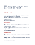 200+ examples of corporate jargon (and what to say instead) 1. 30,000-foot view What it means: Consider the big picture of a situation or problem rather than getting hung up on the details. How it’s used: “Let’s take a 30,000-foot view on our customer acquisition strategy.” Try this instead: Overview 2. Alignment What it means: A shared understanding of a goal or purpose and how to work toward it together. How it’s used: “I want to make sure we’re all in alignment on the project goals.” Try this instead: Agreement 3. Bandwidth What it means: How much time and energy a person has available for a task or responsibility. How it’s used: “Do you have the bandwidth to take over this monthly report?” Try this instead: Availability By Adit Yadav 4. Circle back What it means: Reconnect about a topic at a later time. How it’s used: “I’ll circle back on this next month.” Try this instead: Follow up 5. Close the loop What it means: Wrap up a topic or process with a firm conclusion. How it’s used: “Can you reach out to the client to close the loop on that proposal?” Try this instead: Finish 6. Deliverable What it means: Something (either tangible or intangible) that’s produced as part of a project How it’s used: “That’s a crucial deliverable for the upcoming product launch.” Try this instead: Outcome 7. Disrupt What it means: Innovate or introduce something new. How it’s used: “We’re poised to disrupt the healthcare technology market.” Try this instead: Change 8. Double-click https://www.instagram.com/career__adit/ Page 2 By Adit Yadav What it means: Dig deeper into a topic or issue. How it’s used: “I want to double-click on your feedback about engagement surveys.” Try this instead: Explore 9. Download What it means: Give information to other team members. How it’s used: “We’re here to download last week’s investor call.” Try this instead: Share 10. EOD What it means: End of day (which can mean something different to everyone, especially on distributed teams). How it’s used: “Can you get this back by EOD?” Try this instead: List the exact date and time (for example, “by 4pm PST on Monday”) 11. Full disclosure What it means: Complete admission of information related to a situation or decision. How it’s used: “Full disclosure: I know that candidate personally.” Try this instead: Nothing (simply state the fact without qualifying it) 12. Hard stop https://www.instagram.com/career__adit/ Page 3 By Adit Yadav What it means: Firm end time for a meeting or other commitment. How it’s used: “I have a hard stop at 3pm for another meeting.” Try this instead: End 13. Ideate What it means: Generate new ideas, usually through brainstorming How it’s used: “Let’s pull the team together and ideate ways to improve retention.” Try this instead: Brainstorm 14. Leverage What it means: Use strategies, relationships, or resources to their maximum benefit. How it’s used: “We should leverage the customer support team’s knowledge for this project.” Try this instead: Make the most of 15. Mind meld What it means: Come together to share ideas and perspectives. How it’s used: “Let’s have a quick mind meld before the client meeting tomorrow.” Try this instead: Discussion 16. Mission critical https://www.instagram.com/career__adit/ Page 4 By Adit Yadav What it means: Tasks, strategies, or other components that are essential for achieving a goal. How it’s used: “The graphics are mission critical for getting this ebook launched on time.” Try this instead: Crucial 17. Move the needle What it means: Make significant progress. How it’s used: “We’re looking for sales strategies that will move the needle on our revenue numbers.” Try this instead: Effective 18. Offline What it means: Discuss something outside of the current meeting or conversation. How it’s used: “We’ll chat about that offline.” Try this instead: Later 19. Out of pocket What it means: To be unreachable. How it’s used: “I’ll be out of pocket tomorrow afternoon for my daughter’s dance recital.” Try this instead: Unavailable 20. Piggyback https://www.instagram.com/career__adit/ Page 5 By Adit Yadav What it means: Take inspiration from an existing idea or initiative, rather than start from scratch How it’s used: “To piggyback off of this customer’s feature request…” Try this instead: Build 21. Ping What it means: Send a brief message or notification to someone. How it’s used: “I’ll ping Sean to check in.” Try this instead: Contact 22. Pivot What it means: Strategically shift direction or focus in response to changes. How it’s used: “We’re going to pivot our approach to product development.” Try this instead: Switch 23. Punt What it means: Postpone a decision or task to a later time. How it’s used: “Let’s punt that to next week’s meeting.” Try this instead: Delay 24. Put a pin in it What it means: Temporarily set aside a topic or decision. How it’s used: “We’ll put a pin in this until we can get more https://www.instagram.com/career__adit/ Page 6 By Adit Yadav information.” Try this instead: Pause 25. Scale What it means: Expand a team, product, service, or business. How it’s used: “We need this process to scale along with our team.” Try this instead: Grow 26. Seamless What it means: Process or experience that is smooth and efficient. How it’s used: “Our checkout experience should be seamless.” Try this instead: Easy 27. Synergy What it means: Combined effort that leads to better results than individual efforts. How it’s used: “Bringing together our marketing and sales team will create synergy.” Try this instead: Teamwork 28. Table this What it means: Postpone or set aside a topic or decision for a later date. How it’s used: “Let’s table this for now.” Try this instead: Move on https://www.instagram.com/career__adit/ Page 7 By Adit Yadav 29. Utilize What it means: 