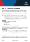 Harvard referencing guide The Harvard referencing style is commonly used in universities around the world. There are many different versions. The version used at the University of Adelaide is referred to as Harvard UofA. It is based on the Style manual for authors, editors and printers 2002, 6th ed., John Wiley & Sons, Milton, Qld. This guide is a guide only. You may need to confirm specific referencing requirements for assignments with your lecturer or tutor. Harvard is an author-date style. When you refer to someone else’s work, you need to include a reference to that work in two places: • • In-text citation: this is a short reference in your document, generally at the end of the relevant sentence or paragraph. It consists of the author’s family name, the year of publication and the page number for direct quotes (and where possible for other citations) inside a pair of brackets. In the reference list: this is a complete list, in alphabetical order by author, of all the works you referenced in-text. The references give full details of each source. Reference list In your reference list, you usually include, in this order: • • • • • • Author’s family name Author’s initial(s) Year of publication Title of article or book, etc. Publication details (journal information, publisher information) Page numbers (if needed) Here is a generic example for a journal article with three authors: Author, AA, Author, B & Author, C Year, 'Article title in between single quotes, in lower case and with no full stop to end', ˰Journal Title in Italics with Capitals, vol. ##, no. #, pp. ##-##. In-text citations In an in-text citation, provide the author’s family name, followed by the year of publication. Enclose them in brackets at the end of your sentence. Include a page number where possible, especially if you are quoting directly from a source. An in-text reference looks like this: It has been claimed that... (Author Year, p. #). It could also look like this: Author claims that.... (Year, p. #). Page numbers Remember that you need to include a page number if you quote or paraphrase. To refer to a single page, use the abbreviation p. To refer to more than one page, use the abbreviation pp. For example, use (Jones 2010, p. 112) for referring to one page and use (Jones 2010, pp. 112-113) when referring to more than one page. CRICOS 00123M Last updated 20 April 2023 Page 1 of 13 Journal articles In print or from a UofA database Author’s family name, Initial(s) Year of publication, ‘Title in single quotes’, Journal Title in Italics, vol. ##, (volume number) no. #, (issue number) pp. #-# (page numbers the article covers). You do NOT need to include a URL or database name. For online-only articles that are not part of a journal with sequentially numbered pages, use the article number rather than a page range in the reference list. For in-text references, include the article number followed by the relevant page number within the article, e.g., p.2752-3. Example in-text citation Example reference list entry (Habel 2009, p. #) Habel, C 2009, 'Academic self-efficacy in ALL: capacity-building through self-belief', Journal of Academic Language and Learning, vol. 3, no. 2, pp. 94-104. (Smith, 2021, p. 6789-3) Waqas, U, Rashid, HMA, Ahmed, MF, Rasool, AM & Al-Atroush, ME 2022, ‘Damage Characteristics of Thermally Deteriorated Carbonate Rocks: A Review’, Applied Sciences, vol. 12, no. 5, article no: 2752 [no pagination] From Web (freely available from an e-journal website) Author’s family name, Initial(s) Year of publication, ‘Title in single quotes’, Journal Title in Italics, vol. ##, (volume number) no. #, (issue number) viewed Date Month Year, pp. #-# (page numbers the article covers), <URL address>. • • If volume, issue, or page numbers are unavailable, you can leave them out. If there is other relevant information (e.g. publication month, article number), you can include that instead. Example in-text citation Example reference list entry (Ticker 2017, p. #) Ticker, CS 2017, 'Music and the mind: music's healing powers', Musical Offerings, vol. 8, no. 1, article 1, viewed 21 May 2017, <http://digitalcommons.cedarville.edu /cgi/viewcontent.cgi ?article=1064&context=musicalofferings>. Two authors Author’s family name, Initial(s) & Author's family name, Initial(s) year of publication, ‘Title in single quotes’, Journal Title in Italics, vol. ##, (volume number) no. #, (issue number) pp. #-# (page numbers the article covers). • • Leave the authors' names in the order they appear on the article. Separate the authors' names with an ampersand (&). Example in-text citation Example reference list entry (Darwin & Palmer 2009, p. #) Darwin, A & Palmer, E 2009, 'Mentoring circles in higher education', Higher Education Research and Development, vol. 28, no. 2, pp. 125-136. Three authors Author’s family name, Initial(s), Author's family name, Initial(s) & Author's family name, Initial(s) year of publication, ‘Title in single quotes’, Journal Title in Italics, vol. ##, (volume number) no. #, (issue number) pp. #-# (page numbers the article covers). • • Leave the authors' names in the order they appear on the article. Use an ampersand (&) to separate the last two authors. CRICOS 00123M Last updated 20 April 2023 Page 2 of 13 Example in-text citation Example reference list entry (Maier, Baron & McLaughlan 2007, p. #) Maier, H, Baron, J & McLaughlan, R 2007, 'Using online roleplay simulations for teaching sustainability principles to engineering students', International Journal of Engineering Education, vol. 23, no. 6, pp. 1162-1171. Four or more authors Author’s family name, Initial(s), Author's family name, Initial(s), Author's family name, Initial(s) & Author's family name, Initial(s) year of publication, ‘Title in single quotes’, Journal Title in Italics, vol. ##, (volume number) no. #, (issue number) pp. #-# (page numbers the article covers). • • • • Leave