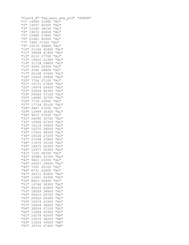 "Cost4_A" "md_earn_wne_p10" "STATE" "1" 14965 31400 "AL" "2" 19547 40300 "AL" "3" 11540 38100 "AL" "4" 19072 46600 "AL" "5" 15986 27800 "AL" "6" 21681 42400 "AL" "7" 7485 27100 "AL" "9" 15179 34800 "AL" "10" 21140 45400 "AL" "11" 39848 41900 "AL" "12" 6110 27700 "AL" "13" 14622 21300 "AL" "14" 31718 29800 "AL" "15" 9304 26300 "AL" "16" 9182 28900 "AL" "17" 25198 37600 "AL" "18" 10452 26900 "AL" "20" 7754 27100 "AL" "21" 10771 27800 "AL" "22" 14974 24400 "AL" "23" 23839 42300 "AL" "24" 29369 37100 "AL" "25" 14080 32700 "AL" "26" 7718 23500 "AL" "27" 17718 35100 "AL" "28" 9487 27200 "AL" "29" 12999 30300 "AL" "30" 9672 27200 "AL" "31" 26090 30700 "AL" "32" 10966 22300 "AL" "33" 16119 33800 "AL" "34" 10270 28000 "AL" "35" 17620 48500 "AL" "36" 19126 27200 "AL" "37" 27248 37800 "AL" "38" 17670 35100 "AL" "39" 10476 26300 "AL" "40" 12977 36300 "AL" "41" 7120 28700 "AL" "42" 32985 33700 "AL" "43" 9421 23200 "AL" "44" 24357 29000 "AL" "45" 7391 20100 "AL" "46" 8731 22600 "AL" "47" 34371 45800 "AL" "49" 12401 24300 "AL" "50" 8923 26000 "AL" "51" 13746 38300 "AL" "52" 40233 43800 "AL" "53" 18509 28800 "AL" "54" 24615 24700 "AL" "55" 20622 25600 "AL" "56" 10474 21000 "AL" "57" 16024 36600 "AL" "58" 30034 37100 "AL" "60" 13284 25900 "AL" "61" 14278 42000 "AK" "63" 15070 38200 "AK" "64" 13554 39500 "AK" "65" 39710 47400 "AK" "67" 23187 42000 "AK" "68" 11549 42000 "AK" "70" 30946 28300 "AZ" "71" 29875 25200 "AZ" "84" 20061 45200 "AZ" "85" 13401 25600 "AZ" "86" 21624 44400 "AZ" "87" 46183 27500 "AZ" "89" 8702 28700 "AZ" "90" 28349 25200 "AZ" "92" 8244 31200 "AZ" "96" 29706 46500 "AZ" "98" 10219 27800 "AZ" "99" 43624 60900 "AZ" "101" 12007 33300 "AZ" "102" 29968 45200 "AZ" "108" 13316 29800 "AZ" "109" 12925 36000 "AZ" "110" 26385 38400 "AZ" "111" 26952 38400 "AZ" "112" 24458 26700 "AZ" "114" 11752 22500 "AZ" "115" 21182 38800 "AZ" "116" 11304 22100 "AZ" "118" 12678 32500 "AZ" "120" 26877 53400 "AZ" "121" 7415 30100 "AZ" "124" 37677 35200 "AZ" "126" 13925 36600 "AZ" "129" 12807 35700 "AZ" "130" 12786 27100 "AZ" "131" 30745 31000 "AZ" "134" 28979 52600 "AZ" "136" 8887 28200 "AZ" "137" 16990 34800 "AR" "140" 20015 21100 "AR" "143" 31045 37200 "AR" "146" 18064 43600 "AR" "147" 15579 27400 "AR" "149" 17770 32700 "AR" "150" 15361 35000 "AR" "151" 14827 33600 "AR" "153" 17975 42100 "AR" "154" 13097 26600 "AR" "155" 18333 37100 "AR" "156" 19872 35700 "AR" "157" 10824 21000 "AR" "158" 17141 31100 "AR" "159" 9411 20200 "AR" "160" 8527 23100 "AR" "163" 13544 25000 "AR" "164" 12636 23900 "AR" "165" 23751 38600 "AR" "166" 17175 35200 "AR" "167" 44854 40500 "AR" "170" 30606 46200 "AR" "175" 10126 21800 "AR" "176" 12672 22500 "AR" "179" 11292 25500 "AR" "180" 8739 27800 "AR" "181" 29140 37500 "AR" "182" 11549 24100 "AR" "183" 12363 25200 "AR" "184" 31596 31100 "AR" "185" 10662 25600 "AR" "186" 20107 26200 "AR" "187" 15921 21200 "AR" "188" 12639 26700 "AR" "190" 13677 28700 "AR" "191" 12160 23000 "AR" "192" 9754 21300 "AR" "195" 20545 32300 "AR" "196" 12823 26100 "AR" "197" 16466 35900 "AR" "198" 13779 26800 "AR" "200" 14353 29900 "AR" "201" 34399 36100 "CA" "202" 25652 38400 "CA" "206" 10977 34300 "CA" "207" 9493 29500 "CA" "208" 37393 30200 "CA" "214" 11078 27600 "CA" "216" 11744 27000 "CA" "217" 54019 51700 "CA" "220" 41514 49000 "CA" "221" 7966 29700 "CA" "223" 14384 31800 "CA" "226" 41843 40700 "CA" "227" 34322 29100 "CA" "229" 24617 42300 "CA" "230" 12122 29800 "CA" "233" 12410 32100 "CA" "234" 36439 41800 "CA" "235" 49375 35700 "CA" "237" 52389 74000 "CA" "238" 44254 52900 "CA" "239" 21479 60900 "CA" "241" 15517 48100 "CA" "242" 15474 44900 "CA" "243" 16516 45500 "CA" "244" 15424 52000 "CA" "245" 20730 45100 "CA" "246" 11281 42800 "CA" "247" 15479 43200 "CA" "248" 13476 46500 "CA" "249" 18698 51300 "CA" "250" 16087 46900 "CA" "251" 13161 44900 "CA" "252" 19660 44200 "CA" "253" 18655 46500 "CA" "254" 30800 62700 "CA" "255" 28950 57100 "CA" "256" 27346 55800 "CA" "257" 29240 59200 "CA" "258" 27146 48700 "CA" "259" 27700 59600 "CA" "261" 30224 52000 "CA" "262" 30670 44600 "CA" "266" 25240 40400 "CA" "267" 32570 32800 "CA" "269" 53643 32500 "CA" "270" 20707 81100 "CA" "272" 9895 29300 "CA" "273" 9677 34200 "CA" "283" 7973 31400 "CA" "284" 11853 24900 "CA" "285" 12465 32900 "CA" "286" 13237 28100 "CA" "287" 53733 51800 "CA" "288" 27900 63000 "CA" "289" 38324 42100 "CA" "290" 35943 34400 "CA" "292" 8321 29100 "CA" "293" 9162 36900 "CA" "295" 55330 63600 "CA" "298" 8870 30500 "CA" "299" 33058 48500 "CA" "300" 29887 49200 "CA" "303" 9608 23000 "CA" "305" 12789 30200 "CA" "307" 14613 29000 "CA" "308" 12714 28000 "CA" "309" 13639 30500 "CA" "310" 13137 32900 "CA" "311" 7894 26800 "CA" "313" 8759 33000 "CA" "314" 9247 43600 "CA" "318" 12921 29700 "CA" "319" 33201 33900 "CA" "320" 28778 46500 "CA" "321" 13280 38300 "CA" "322" 53169 51400 "CA" "324" 13395 31600 "CA" "327" 15365 30200 "CA" "334" 13474 32700 "CA" "335" 39798 34500 "CA" "336" 30576 30400 "CA" "337" 40198 34500 "CA" "338" 36012 34500 "CA" "339" 13762 26900 "CA" "344" 10675 47600 "CA" "347" 9856 26000 "CA" "348" 32745 39700 "CA" "350" 8378 32700 "CA" "352" 10147 26900 "CA" "354" 8874 30800 "CA" "357" 11256 31700 "CA" "359" 6509 32300 "CA" "361" 13696 29500 "CA" "362" 55288 78600 "CA" "363" 24959 35200 "CA" "364" 24640 30100 "CA" "365" 24083 42100 "CA" "366" 25430 37400 "CA" "367" 23993 40000 "CA" "369" 42438 50100 "CA" "371" 20650 36200 "CA" "372" 24148 31300 "CA" "373" 8147 24500 "CA" "378" 15191 35200 "CA" "379" 25701 38400 "CA" "380" 25355 38400 "CA" "381" 25376 38400 "CA" "385" 9284 25200 "CA" "386" 23594 31200 "CA" "387" 30432 38200 "CA" "388" 40660 52700 "CA" "389" 34839 39800 "CA" "390" 10010 28400 "CA" "392" 12165 27600 "CA" "393" 14187 25300 "CA" "397" 37224 41300 "CA" "399" 9523 27800 "CA" "401" 14154 29700 "CA" "402" 12578 33600 "CA" "403" 10396 25900 "CA" "404" 10977 26500 "CA" "405" 12392 30600 "CA" "406" 37830 40900 "CA" "407" 10244 25600 "CA" "409" 13025 28900 "CA" "410" 14068 34300 "CA" "411" 33172 38200 "CA" "412" 52047 55600 "CA" "423" 14840 32