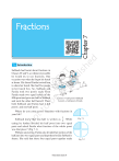 Chapter 7 Fractions 7.1 Introduction Subhash had learnt about fractions in Classes IV and V, so whenever possible he would try to use fractions. One occasion was when he forgot his lunch at home. His friend Farida invited him to share her lunch. She had five pooris in her lunch box. So, Subhash and Farida took two pooris each. Then Farida made two equal halves of the fifth poori and gave one-half to Subhash and took the other half herself. Thus, both Subhash and Farida had 2 full pooris and one-half poori. 2 pooris + half-poori–Subhash 2 pooris + half-poori–Farida Where do you come across situations with fractions in your life? Subhash knew that one-half is written as 1 . While 2 eating he further divided his half poori into two equal parts and asked Farida what fraction of the whole poori was that piece? (Fig 7.1) Without answering, Farida also divided her portion of the half puri into two equal parts and kept them beside Subhash’s shares. She said that these four equal parts together make Rationalised 2023-24 Fig 7.1 Fig 7.2 MATHEMATICS one whole (Fig 7.2). So, each equal part is one-fourth of one whole poori and 4 parts together will be 4 or 1 whole poori. 4 When they ate, they discussed what they had learnt earlier. Three parts out of 4 equal parts is Similarly, Fig 7.4 Fig 7.3 and take three parts (Fig 7.3). For 3 . 4 3 is obtained when we 7 divide a whole into seven equal parts 1 , we divide a whole into eight equal parts 8 and take one part out of it (Fig 7.4). Farida said that we have learnt that a fraction is a number representing part of a whole. The whole may be a single object or a group of objects. Subhash observed that the parts have to be equal. 7.2 A Fraction Let us recapitulate the discussion. A fraction means a part of a group or of a region. 5 is a fraction. We read it as “five-twelfths”. 12 What does “12” stand for? It is the number of equal parts into which the whole has been divided. What does “5” stand for? It is the number of equal parts which have been taken out. Here 5 is called the numerator and 12 is called the denominator. Name the numerator of 4 3 and the denominator of . 15 7 Play this Game 2 3 You can play this game with your friends. Take many copies of the grid as shown here. Consider any fraction, say 1 . 2 Each one of you should shade 1 of the grid. 2 104 Rationalised 2023-24 Fracti Intege F RACTIONS EXERCISE 7.1 1. Write the fraction representing the shaded portion. (i) (ii) (v) (vi) (iii) (iv) (vii) (ix) (viii) (x) 2. Colour the part according to the given fraction. 1 3 1 4 1 6 3 4 4 9 Rationalised 2023-24 105 MATHEMATICS 3. Identify the error, if any. 1 1 This is 2 4 4. What fraction of a day is 8 hours? 5. What fraction of an hour is 40 minutes? This is This is 3 4 6. Arya, Abhimanyu, and Vivek shared lunch. Arya has brought two sandwiches, one made of vegetable and one of jam. The other two boys forgot to bring their lunch. Arya agreed to share his sandwiches so that each person will have an equal share of each sandwich. (a) How can Arya divide his sandwiches so that each person has an equal share? (b) What part of a sandwich will each boy receive? 7. Kanchan dyes dresses. She had to dye 30 dresses. She has so far finished 20 dresses. What fraction of dresses has she finished? 8. Write the natural numbers from 2 to 12. What fraction of them are prime numbers? 9. Write the natural numbers from 102 to 113. What fraction of them are prime numbers? 10. What fraction of these circles have X’s in them? 11. Kristin received a CD player for her birthday. She bought 3 CDs and received 5 others as gifts. What fraction of her total CDs did she buy and what fraction did she receive as gifts? 7.3 Fraction on the Number Line You have learnt to show whole numbers like 0,1,2... on a number line. We can also show fractions on a number line. Let us draw a number line and 1 on it. 2 1 We know that is greater than 0 and less than 1, so it should lie between 0 2 try to mark and 1. Since we have to show parts and show 1 part as 1 , we divide the gap between 0 and 1 into two equal 2 1 (as shown in the Fig 7.5). 2 106 Rationalised 2023-24 Fracti Intege F RACTIONS ×1 0 1 2 Fig 7.5 Suppose we want to show 1 on a number line. Into how many equal parts 3 should the length between 0 and 1 be divided? We divide the length between 0 and 1 into 3 equal parts and show one part as 1 (as shown in the Fig 7.6) 3 ×1 0 1 3 Fig 7.6 Can we show 2 2 on this number line? means 2 parts out of 3 parts as 3 3 shown (Fig 7.7). Fig 7.7 Similarly, how would you show and 0 3 3 on this number line? 3 1. Show 0 3 is the point zero whereas since is 3 3 1 whole, it can be shown by the point 1 (as shown in Fig 7.7) So if we have to show 3 on a 7 number line, then, into how many equal parts should the length between 0 and 1 be divided? If P shows 3 then 7 how many equal divisions lie between 0 and P? Where do 3 on a number line. 5 10 1 0 5 , , and on 10 10 10 10 a number line. 3. Can you show any other fraction between 0 and 1? Write five more fractions that you can show and depict them on the number line. 4. How many fractions lie between 0 and 1? Think, discuss and write your answer? 2. Show 0 7 and lie? 7 7 107 Rationalised 2023-24 MATHEMATICS 7.4 Proper Fractions You have now learnt how to locate fractions on a number line. Locate the fractions 3 1 9 0 5 , , , , on separate number lines. 4 2 10 3 8 Does any one of the fractions lie beyond 1? All these fractions lie to the left of 1as they are less than 1. In fact, all the fractions we have learnt so far are less than 1. These are proper fractions. A proper fraction as Farida said (Sec. 7.1), is a number representing part of a whole. In a proper fraction the denominator shows the number of parts into which the whole is divided and the numerator shows the number of parts which have been considered. Therefore, in a proper fraction the numerator is always less than the denominator. 1. Give a proper fraction : (a) whose numerator 