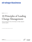 strategy+business ISSUE 75 SUMMER 2014 10 Principles of Leading Change Management These time-honored tools and techniques can help companies transform quickly. BY DEANNE AGUIRRE AND MICAH ALPERN REPRINT 00255 strategy+business issue 75 feature organizations & people 1 These time-honored tools and techniques can help companies transform quickly. Illustration by Lo Cole by DeAnne Aguirre and Micah Alpern Since the mid-2000s, organizational change management and transformation have become permanent features of the business landscape. Vast new markets and labor pools have opened up, innovative technologies have put once-powerful business models on the chopping block, and capital flows and investor demand have become less predictable. To meet these challenges, firms have become more sophisticated in the best practices for organizational change management. They are far more sensitive to and more keenly aware of the role that culture plays. They’ve also had to get much better on their follow-through. feature organizations & people 10 PRINCIPLES OF LEADING CHANGE MANAGEMENT 2 feature organizations & people 3 Micah Alpern micah.alpern@ strategyand.pwc.com is a senior associate with Strategy& based in Chicago and a member of the Katzenbach Center’s operating team. He is an expert in culture transformation and organizational change management. Yet according to a 2013 Strategy&/Katzenbach Center survey of global senior executives on culture and change management, the success rate of major change initiatives is only 54 percent. This is far too low. The costs are high when change efforts go wrong—not only financially but in confusion, lost opportunity, wasted resources, and diminished morale. When employees who have endured real upheaval and put in significant extra hours for an initiative that was announced with great fanfare see it simply fizzle out, cynicism sets in. Our experience with organizational change management suggests that there are three major hurdles to overcome. The first—no surprise—is “change fatigue,” the exhaustion that sets in when people feel pressured to make too many transitions at once. A full 65 percent of respondents to the Katzenbach Center survey reported this as a problem. The change initiatives they suffered through may have been poorly thought through, rolled out too fast, or put in place without sufficient preparation. Fatigue is a familiar problem in organizational change management, especially when splashy “whole new day” initiatives are driven from the top. Change initiatives also flounder, according to 48 percent of the respondents, because companies lack the skills to ensure that change can be sustained over time. Leaders might set out eagerly to raise product quality, but when production schedules slow and the pipeline starts looking sparse, they lose heart. Lacking an effective way to deal with production line problems, they decide their targets were unrealistic, they blame the production technology, or they accuse their frontline people of not being up to the task. A much better way to solve the problem is to invest in operational improvements, such as process design and This article is a revision and update of “10 Principles of Change Management,” by John Jones, DeAnne Aguirre, and Matthew Calderone, s+b, Summer 2004. Also contributing to this article was s+b contributing editor Sally Helgesen. training, to instill new practical approaches and give people the knowledge and cultural support they need. The third major obstacle is that transformation efforts are typically decided upon, planned, and implemented in the C-suite, with little input from those at lower levels. This filters out information that could be helpful in designing the initiative while also limiting opportunities to get frontline ownership of the change. In the Katzenbach Center survey, 44 percent of participants reported not understanding the changes they were expected to make, and 38 percent said they didn’t agree with the changes. The following list of 10 guiding principles for change can help executives navigate the treacherous shoals of transformation in a systematic way. 1. Lead with the culture. Lou Gerstner, who as chief ex- ecutive of IBM led one of the most successful business transformations in history, said the most important lesson he learned from the experience was that “culture is everything.” Businesspeople today understand this. In the Katzenbach Center survey, 84 percent said that the organization’s culture was critical to the success of change management, and 64 percent saw it as more critical than strategy or operating model. Yet change leaders often fail to address culture—in terms of either overcoming cultural resistance or making the most of cultural support. Among respondents whose companies were unable to sustain change over time, a startling 76 percent reported that executives failed to take account of the existing culture when designing the strategy+business issue 75 DeAnne Aguirre deanne.aguirre@ strategyand.pwc.com is a senior partner with Strategy& based in San Francisco. She is the coleader of the firm’s global Katzenbach Center and an expert in culture, leadership, talent effectiveness, and organizational change management. She advises senior executives globally on organizational topics. ALTHOUGH IT’S IMPORTANT TO ENGAGE EMPLOYEES AT EVERY LEVEL EARLY ON, ALL SUCCESSFUL CHANGE MANAGEMENT INITIATIVES START AT THE TOP. to recognize and acknowledge each company’s underlying culture, leaders of the merged firm harnessed deeply ingrained strengths to energize the change and avoided the incoherence that could have resulted from a less intentional and sensitive redesign. 2. Start at the top. Although it’s important to engage employees at every level early on, all successful change management initiatives start at the top, with a committed and well-aligned group of executives strongly supported by the CEO. This alignment can’t be 