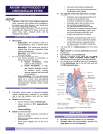 ANATOMY AND PHYSIOLOGY OF CARDIOVASCULAR SYSTEM ○ ○ ● ANATOMY OF HEART ANATOMY ● ● The heart, a vital organ in the circulatory system, is a hollow, muscular organ situated in the mediastinum, the central area of the thoracic cavity, between the lungs, and resting on the diaphragm. Its average weight is 300 grams (10.6 oz), and its size and weight are influenced by factors such as age, gender, body weight, physical activity, and any underlying heart disease. STRUCTURE OF THE HEART ● ● Heart Layers: ○ Endocardium: The inner layer, made up of endothelial tissue, lines the heart's interior, including the valves. ○ Myocardium: The middle layer consists of muscle fibers that are responsible for the heart's pumping action. ○ Epicardium: The outermost layer, covering the heart's surface. Pericardium (Heart’s Protective Sac): ○ The heart is encased in a pericardium, a fibrous sac that has two layers: ■ Visceral Pericardium: Closely adheres to the epicardium. ■ Parietal Pericardium: A tough, fibrous layer that attaches to the great vessels, diaphragm, sternum, and vertebral column, providing structural support to the heart within the mediastinum. ○ Pericardial Space: This space between the visceral and parietal pericardium contains about 20 mL of fluid, which lubricates the heart's surface and reduces friction during its contraction and relaxation cycles (systole and diastole). ● ● ● ● ● ● Ventricular systole follows atrial systole. This synchronization allows the ventricles to fully fill before ejecting blood. The right side of the heart (right atrium and right ventricle): ○ Distributes venous (deoxygenated) blood to the lungs via the pulmonary artery (pulmonary circulation) for oxygenation. ○ Pulmonary artery is the only artery in the body carrying deoxygenated blood. ○ The right atrium receives venous blood returning from the superior vena cava (head, neck, and upper extremities), inferior vena cava (trunk and lower extremities), and coronary sinus (coronary circulation). The left side of the heart (left atrium and left ventricle): ○ Distributes oxygenated blood to the rest of the body via the aorta (systemic circulation). ○ The left atrium receives oxygenated blood from the pulmonary circulation through four pulmonary veins. The heart lies in a rotated position within the chest cavity. Right ventricle is positioned anteriorly (just beneath the sternum). Left ventricle is located posteriorly. Due to its proximity to the chest wall, the apical impulse (or point of maximal impulse [PMI]) is easily detected during normal ventricular contraction. In a normal heart, the PMI is found at the intersection of the midclavicular line on the left chest wall and the fifth intercostal space. HEART CHAMBERS ● ● ● The heart's pumping action is achieved through the rhythmic relaxation and contraction of its muscular walls in two top chambers (atria) and two bottom chambers (ventricles). Diastole (relaxation phase): ○ All four chambers relax simultaneously. ○ Allows ventricles to fill in preparation for contraction. ○ Often referred to as the period of ventricular filling. Systole (contraction phase): ○ Refers to events during the contraction of atria and ventricles. ○ Atrial and ventricular systoles do not occur simultaneously. ○ Atrial systole happens first, at the end of diastole. BSN 3-4 JOSHUA ALLAN G. ARELLANO, SN HEART VALVES ATRIOVENTRICULAR VALVES ● ● AV valves separate the atria from the ventricles. Tricuspid valve (three cusps/leaflets) separates the right atrium from the right ventricle. ● Mitral (bicuspid) valve (two cusps) separates the left atrium from the left ventricle. ● ● DURING DIASTOLE ● ● The tricuspid and mitral valves are open. Blood flows freely from the atria into the relaxed ventricles. DURING VENTRICULAR SYSTOLE ● ● ● ● ● Ventricles contract, causing blood to flow upward into the cusps of the tricuspid and mitral valves, leading to valve closure. Papillary muscles and chordae tendineae help maintain valve closure by preventing backflow. Papillary muscles are located on the ventricular walls and are connected to the valve leaflets via chordae tendineae (thin fibrous bands). Contraction of papillary muscles makes the chordae tendineae taut, keeping the valves closed and preventing regurgitation (backflow of blood) into the atria. Blood is then ejected into the pulmonary artery and aorta. SEMILUNAR VALVES ● ● ● The semilunar valves consist of three leaflets shaped like half-moons. Pulmonic valve is located between the right ventricle and the pulmonary artery. Aortic valve is located between the left ventricle and the aorta. DURING DIASTOLE ● ● ● The semilunar valves are closed. Pressure in the pulmonary artery and aorta decreases, causing blood to flow back toward the valves. This backflow fills the cusps with blood and closes the semilunar valves. ● LEFT CORONARY ARTERY ● ● The semilunar valves are forced open as blood is ejected from the right and left ventricles into the pulmonary artery and aorta, respectively. CORONARY ARTERIES ● ● ● ● ● The left and right coronary arteries supply arterial blood to the heart. These arteries originate from the aorta, just above the aortic valve leaflets. Coronary arteries are perfused during diastole (unlike other arteries). With a normal heart rate (60 to 80 bpm), there is enough time for myocardial perfusion during diastole. Increased heart rate shortens diastolic time, reducing perfusion time, and may lead to myocardial ischemia (inadequate oxygen supply). RIGHT CORONARY ARTERY ● Supplies the right side of the heart and travels to the inferior wall. BSN 3-4 JOSHUA ALLAN G. ARELLANO, SN Has three branches: 1. Left main coronary artery (from the point of origin to the first major branch). 2. Left anterior descending artery (supplies the anterior wall of the heart). 3. Circumflex artery (circles around to the lateral left wall o