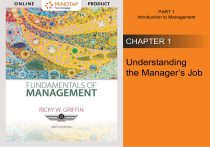 PART 1 Introduction to Management CHAPTER 1 Understanding the Manager’s Job © 2019 Cengage. All rights reserved. Learning Objectives After studying this chapter, you should be able to: 1. Define management, describe the kinds of managers found in organizations, identify and explain the four basic management functions, describe the fundamental management skills, and comment on management as a science and art. 2. Justify the importance of history and theory to managers, and explain the evolution of management through the classical, behavioral, and quantitative perspectives. 3. Identify and discuss key contemporary management perspectives represented by the systems and contingency perspectives, and identify the major challenges and opportunities faced by managers today. © 2019 Cengage. All rights reserved. Discussion Starter (1) • Unlike most traditional managers, Netflix CEO, Reed Hastings does not have an office. He wanders around headquarters, talking to people about their work and their ideas. Hastings continues to look for the “next big thing.” – – To watch a brief interview with Reed Hastings, visit CNN Money (http://money.cnn.com/video/news/2014/02/21/nnetflix-ceo-reed-hastings-business-ofbeing.cnnmoney/index.html). What qualities and traits do you think are essential for a manager to have in order to create a successful business? © 2019 Cengage. All rights reserved. 1-1 An Introduction to Management (slide 1 of 3) • Organization – A group of people working together in a structured and coordinated fashion to achieve a set of goals • Management – A set of activities (including planning and decision making, organizing, leading, and controlling) directed at an organization’s resources (human, financial, physical, and information) with the aim of achieving organizational goals in an efficient and effective manner © 2019 Cengage. All rights reserved. 1-1 An Introduction to Management (slide 2 of 3) EFFICIENTLY Using resources wisely in a cost-effective way and EFFECTIVELY Making the right decisions and successfully implementing them © 2019 Cengage. All rights reserved. 1-1 An Introduction to Management (slide 3 of 3) • Manager – Someone whose primary responsibility is to carry out the management process © 2019 Cengage. All rights reserved. FIGURE 1.1 Kinds of Managers by Level and Area © 2019 Cengage. All rights reserved. Levels of Management • Top managers – Executives who manage the overall organization – Create the organization’s goals, overall strategy, and operating policies • Middle managers – Implement the policies and plans developed by top managers – Supervise and coordinate the activities of lower-level managers • First-line managers – Supervise and coordinate the activities of operating employees – Spend a large proportion of their time supervising the work of their subordinates © 2019 Cengage. All rights reserved. Managing in Different Areas of the Organization Marketing Managers Financial Managers Human Resources Managers Kinds of Managers by Area Administrative Managers Specialist Managers Operations Managers © 2019 Cengage. All rights reserved. FIGURE 1.2 The Management Process © 2019 Cengage. All rights reserved. What Skills Do Managers Need? Technical Conceptual Interpersonal Fundamental Management Skills Diagnostic Decision Making Communication Time Management © 2019 Cengage. All rights reserved. 1-1c Fundamental Management Skills (slide 1 of 3) • Technical skills – The skills necessary to accomplish or understand the specific kind of work done in an organization • Interpersonal skills – The ability to communicate with, understand, and motivate both individuals and groups • Conceptual skills – The manager’s ability to think in the abstract • Diagnostic skills – The manager’s ability to visualize the most appropriate response to a situation © 2019 Cengage. All rights reserved. 1-1c Fundamental Management Skills (slide 2 of 3) • Communication skills – The manager’s abilities both to effectively convey ideas and information to others and to effectively receive ideas and information from others • Decision-making skills – The manager’s ability to correctly recognize and define problems and opportunities and to then select an appropriate course of action to solve problems and capitalize on opportunities • Time management skills – The manager’s ability to prioritize work, to work efficiently, and to delegate appropriately © 2019 Cengage. All rights reserved. 1-1c Fundamental Management Skills (slide 3 of 3) • Watch this video from Bloomberg in which CEOs identify what they believe to be one skill every leader needs: – YouTube (https://www.youtube.com/watch?v=NhW7bnh0sDk). © 2019 Cengage. All rights reserved. Discussion Starter (2) • Recall a recent group project or task in which you have participated. Explain how members of the group displayed each of the managerial skills. © 2019 Cengage. All rights reserved. 1-1d The Science and the Art of Management • The Science of Management – Assumes problems and issues can be approached using rational, logical, objective, and systematic ways – Requires technical, diagnostic, and decision-making skills • The Art of Management – Requires a blend of intuition, experience, instinct, and personal insights – Relies heavily on conceptual, communication, interpersonal, and time management skills © 2019 Cengage. All rights reserved. 1-2a The Importance of Theory and History (slide 1 of 2) • Why Theory? – Provides a conceptual framework for organizing knowledge and providing a blueprint for action • Management theories are grounded in reality. • Most managers develop and refine their own theories of how they should run their organizations and manage the behavior of their employees. © 2019 Cengage. All rights reserved. 1-2a The Importance of Theory and History (slide 2 of 2) • Why History? – Stresses an awareness and un