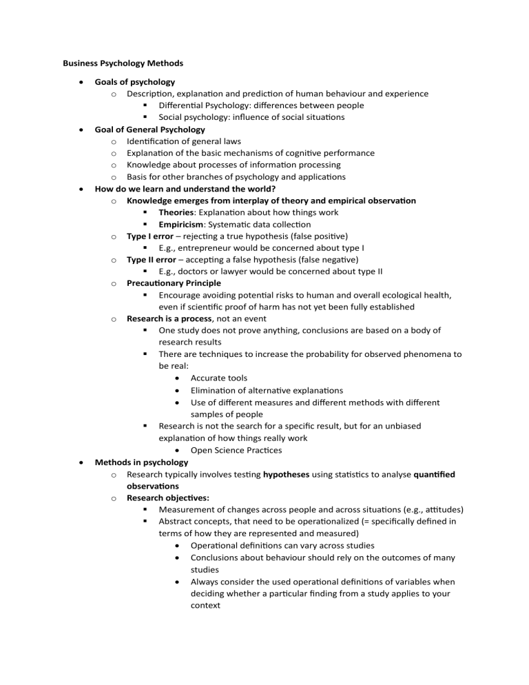 Business Psychology Methods Goals of psychology o Description, explanation and prediction of human behaviour and experience Differential Psychology: differences between people Social psychology: influence of social situations Goal of General Psychology o Identification of general laws o Explanation of the basic mechanisms of cognitive performance o Knowledge about processes of information processing o Basis for other branches of psychology and applications How do we learn and understand the world? o Knowledge emerges from interplay of theory and empirical observation Theories: Explanation about how things work Empiricism: Systematic data collection o Type I error – rejecting a true hypothesis (false positive) E.g., entrepreneur would be concerned about type I o Type II error – accepting a false hypothesis (false negative) E.g., doctors or lawyer would be concerned about type II o Precautionary Principle Encourage avoiding potential risks to human and overall ecological health, even if scientific proof of harm has not yet been fully established o Research is a process, not an event One study does not prove anything, conclusions are based on a body of research results There are techniques to increase the probability for observed phenomena to be real: Accurate tools Elimination of alternative explanations Use of different measures and different methods with different samples of people Research is not the search for a specific result, but for an unbiased explanation of how things really work Open Science Practices Methods in psychology o Research typically involves testing hypotheses using statistics to analyse quantified observations o Research objectives: Measurement of changes across people and across situations (e.g., attitudes) Abstract concepts, that need to be operationalized (= specifically defined in terms of how they are represented and measured) Operational definitions can vary across studies Conclusions about behaviour should rely on the outcomes of many studies Always consider the used operational definitions of variables when deciding whether a particular finding from a study applies to your context o o o o o o Research participants Different groups of people are likely to differ in their experience and circumstances Findings in one group cannot automatically be generalized to everyone else Sometimes you can generalize the results from a student sample to the population in general, or population of interest (e.g., study about attention processes in general population), sometimes not (foreign policy decisions of political elite) Always consider the used sample when deciding whether a particular finding from a study applies to your context Counter Factual (Control group) Counterfactual events are the events that could have taken place but did not Counterfactuals pose a fundamental problem of causal inference because a counter factual is not observable Causality Is the relation between a cause and its effect An event results into an outcome or creates a consequence Correlation does necessarily not imply causality Qualitative Designs Low standardizing mostly used if there is not so much known about a topic Goal: exploration, generation of hypotheses Naturalistic Observation (real world observation of behaviour, verbal responses etc.) Restricted to things you can see or hear Approach: Focus groups Interview Recording of conversations Correlational Studies Correlation does not equal causation No variable is manipulated, no random assignment, all variables are measured as is at the same point in time Predictor: hypothesized causal variable Criterion: variable that should be predicted No specific prediction about how variables are related to each (pure exploration whether there is a relation in a systematic way) Survey Design We want to avoid survey termination or item nonresponse How many items are really needed? Will you use all for the analysis? Which concepts are relevant for my research? Which indicators are necessary to measure the concepts? Which items are needed to measure these indicators? What is a manageable length of a survey? Web 20 min, phone interview 30 min Face2face interview 90 min o o o Rule of thumb – 4 responses per minute All questions should be understood by survey responders and researchers in the same way Should be easy to answer Process: o Understand the question (e.g., no technical terms, no abbreviations, no abstract descriptions, include helpful examples and concrete time frames (last 2 weeks) no complex sentence structures, no hypothetical questions, no negation, avoid asking for two items in the same question, no implicit assumptions) o Search relevant information (e.g., memory) o Judgement o Transfer of judgement onto the scale o Adapting of the response according to social desirability Context of each question relevant Standalone „How satisfied are you with your life? “vs. after „How satisfied are you with your relationship? “ Start with an easy ice breaker question Socio-demographic question in the end Exception when responses for screening or filtering needed Reliability Describes the precision of measurements Specifically, how precisely can a measurement procedure capture the real quantity that we are trying to measure Respectively, reliability = absence of measurement error How to measure reliability: Correlation between 2 measures o Test-retest method o Split-half method o Inter-Class Correlation Validity Describes the accuracy of a measure Specifically, does the procedure measure what it is supposed to measure? Respectively, validity = fit between underlying construct and the measure External validity Truth in real life Internal validity Truth in the study Laboratory experiments Most highly controlled method of hypothesis testing Goal: Isolation of a cause-and-effect relationship Independent variables (IVs) are predicted to impact the dependent variables (DVs) Manipulation of IVs, then measurement of DVs while controlling all other c