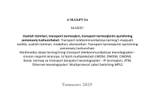 4-МАЪРУЗА МАВЗУ: Uzatish tizimlari, transport tarmoqlari, transport tarmoqlarini qurishning zamonaviy tushunchalari. Transport telekommunikatsiya tarmog‘i-maqsadi, tarkibi, uzatish tizimlari, modellari, elementlari. Transport tarmoqlarini qurishning zamonaviy tushunchasi. Multimedia aloqa tarmog'ining transport telekommunikatsiya texnologiyalari sinxron raqamli ierarxiya, to'lqinli multiplekslash (WDM, DWDM, CWDM). Kanal, tarmoq va transport darajalari texnologiyalari - IP tarmoqlari, ATM, Ethernet texnologiyalari. Multiprotocol Label Switching MPLS Тошкент 2025 ITU-T тавсия этган тармоқ модели Axborot uzatish usullari: • Sinxron rejimda uzatish (SRU): • • IKM • • PDH • • SDH, SONET, NG- SDH • • RАТС КК, • SRU xususiyatlari: • Doimiy uzatish tezligi • Signalni siklik uzatish Asinxron uzatish rejimi (ARU): • ATM, Frame Relay, X.25 • Ethernet (10, FE, GbE, 10 GbE, 100 GbE) • IP (TCP / IP) • MPLS ... IP / MPLS ARU xususiyatlari: O'zgaruvchan uzatish tezligi Paketlarni erkin uzatish Transport tarmoqlari (Transport Network) • Transport tarmog'ining funktsiyalari ikki guruhga bo'linadi: • • asosiy (transport) funktsiyalari to'g'ridan-to'g'ri bir nuqtadan boshqasiga transport tarmog'idan ma'lumot uzatishni ta'minlash; • • yordamchi funktsiyalar - boshqaruv, sinxronizatsiya, energiya ta’minoti va boshqa funktsiyalarni bajaradigan qo'llabquvvatlash tarmoqlari. Транспорт тармоқларининг хусусиятлари • Транспорт сатхи фойдаланувчининг турли хилдаги ахборотларини (товуш, видео, маълумотлар) аниқ узатилишига жавоб беради. Бунда манба ва белгиланган нуқта орасида ахборот алмашинуви, уланиш тури (телефон чақириғи, Интернет тармоғида иш сеанси, видеони узатиш, бир қанча иштирокчилар билан тармоқли ўйин ёки фильм трансляцияси)га боғлиқ бўлмаган ҳолда шундай тамойил бўйича амалга оширилади. Ахборотни узатишда транспорт технологияси сифатида вақт бўйича ажратишга эга бўлган TDM, xWDM мультиплексорлаш, узатишнинг асинхрон режими ATM ёки Интернет-IP протоколи, MPLS технологияси ишлатилиши мумкин. Транспорт тармоғининг тузилиши Транспорт тармоғининг куп сатхли архитектураси • Моделнинг қуйи сатхи– сигнал узатиш муҳити ҳисобланади. Барча турдаги хизматлар учун бу сатхи оптик толали алоқа линиялари (ОТАЛ) ёки рақамли радиореле линиялари (РРЛ) асосида амалга оширилган бўлиши даркор. Баъзи ҳолларда сигнални узатиш мухити сифатида йўлдошли алоқанинг икки тарафлама каналлари ишлатилиши мумкин. • Иккинчи сатхда иккита қатламни ажратиш мақсадга мувофиқ. Қуйи қатламда рақамли трактни ташкил қилиш функцияси бажарилади. Рақамли тракт сифатида STM-N, Ethernet ёки бошқа стандартларга асосланган трактлар ишлатилиши мумкин. Юқори поғона эса белгиланган хизмат кўрсатиш сифати (QoS)ни тақдим этишга жавоб беради. NGN тармоқларида белгиланган (QoS) кўрсаткичларнинг тақдим этилиши ATM, MPLS ва шунга ўхшаш технологиялар ҳисобига амалга оширилади. • Моделнинг учинчи сатхи, барча турдаги ахборотларни пакет кўринишида алмашиш учун қўлланиладиган IP-технологиядир. Бу сатхда талаб қилинган ўтказиш қобилиятини тақдим этиш, шунингдек, алоқанинг ишончлилигини таъминлаш каби хизматлар амалга оширилади. NGN тармоғи транспорт сатхининг истиқболли қурилмаларига бўлган талаблар Хусусиятлари Қайта тикланиш тезлиги Масштабланувчанлик Талаблари Рад этишдан сўнг қайта тикланиш 50 мс дан ортиқ бўлмаган вақтда амалга оширилиши керак. Мос ҳолда кўп сонли сервисларни қўллабқувватлаш имкони. Тармоқ абонентлари ишлатаётган ресурслар Тенг уланиш имкони билан бирга тармоқ ресурсларига тенг уланиш имконининг мавжудлиги Эксплуатация жараёнида маъмурий бошқариш ва хизмат кўрсатиш Захиралаш Ўзида хатоликларни аниқлаш, узатиш ва ҳар бир хизматлар учун сифатнинг тўғрилигини бошқариш кабиларни жам қилган бошқарув функцияси тўпламининг мавжудлиги Бир ёки бир неча сервислар учун тармоқ ресурсларини захиралаш Тармоқда ишлашнинг Тармоқ ресурсла