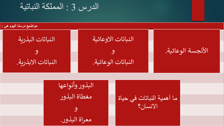 الدرس : 3المملكة النباتية مواضيع درسنا اليوم هي : النباتات االوعائية النباتات البذرية و و النباتات الوعائية. النباتات االبذرية. األنجسة الوعائية. البذور وأنواعها ما أهمية النباتات في حياة االنسان؟ مغطاة البذور و معراة البذور. -1االنسيجةالوعائية:لها نوعان وهما. النوع األول :الذي يكون على شكل أنياب مجوفة تنقل الماء و االمالح من الجذر الى األوراق مثال :الخشب النوع الثان :الذي ينقل الغذاء من األوراق الى أجزاء النباتات جميعها CC BY-SAهذه الصورة بواسطة كاتب غير معروف مرخصة باالسم -2النباتات الوعائية و النباتات الالوعائية. النباتات الوعائية :تحتوي عىل أنسجة وعائية وتمتاز الكبي و تركيبها عن النباتات الالوعائية بحجمها ر المعقد ,وقدرتها عىل العيش ف مختلف البيئات. CC BYهذه الصورة بواسطة كاتب غير معروف مرخصة باالسم النباتات الالوعائية :تلجأ هذه النباتات الى طرائق أخرى لنقل الماء و الغذاء والتحتوي على أنسجة وعائية مثال:الفيوناريا CC BY-SAهذه الصورة بواسطة كاتب غير معروف مرخصة باالسم النباتات البذرية والنباتات الالبذرية النباتات البذرية :ه النباتات الت تتكاثر بالبذور كالحمضيات والصنوبريات والنباتات اال بذرية :تتكاثر باألبواغ كالسسخسيات مغطاة البذور و معراة البذور مغطاة البذور :النباتات التي تكون في مبيض الزهرة الذي يتحول الى ثمرة معراة البذور :التي تكون بذورها في مخاريط مثل الصنوبر ما أهمية النباتات في حياة االنسان تعرفت سابقا ان للنباتات أهمية كبيرة في حياة االنسان من غذاء ولباس و مالبس ومن ناحية الغذاء اكتشف العلماء ان هنالك فوائد كالفيتامينات و المعادن ومن األمثلة عليها كالشاي األخضر ألنه يهضم المعدة ويساعد على التركيز ويعمل على استقالب الدهون CC BYهذه الصورة بواسطة كاتب غير معروف مرخصة باالسم