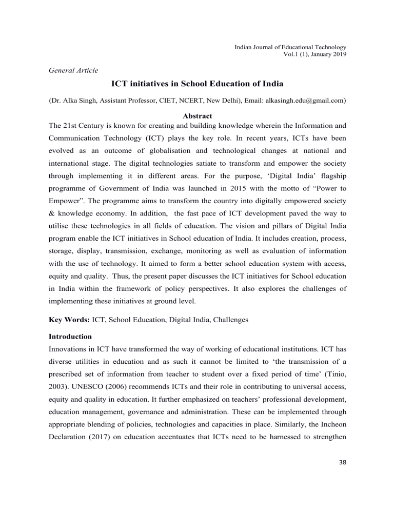 Indian Journal of Educational Technology Vol.1 (1), January 2019 General Article ICT initiatives in School Education of India (Dr. Alka Singh, Assistant Professor, CIET, NCERT, New Delhi), Email: alkasingh.edu@gmail.com) Abstract The 21st Century is known for creating and building knowledge wherein the Information and Communication Technology (ICT) plays the key role. In recent years, ICTs have been evolved as an outcome of globalisation and technological changes at national and international stage. The digital technologies satiate to transform and empower the society through implementing it in different areas. For the purpose, ‘Digital India’ flagship programme of Government of India was launched in 2015 with the motto of “Power to Empower”. The programme aims to transform the country into digitally empowered society & knowledge economy. In addition, the fast pace of ICT development paved the way to utilise these technologies in all fields of education. The vision and pillars of Digital India program enable the ICT initiatives in School education of India. It includes creation, process, storage, display, transmission, exchange, monitoring as well as evaluation of information with the use of technology. It aimed to form a better school education system with access, equity and quality. Thus, the present paper discusses the ICT initiatives for School education in India within the framework of policy perspectives. It also explores the challenges of implementing these initiatives at ground level. Key Words: ICT, School Education, Digital India, Challenges Introduction Innovations in ICT have transformed the way of working of educational institutions. ICT has diverse utilities in education and as such it cannot be limited to ‘the transmission of a prescribed set of information from teacher to student over a fixed period of time’ (Tinio, 2003). UNESCO (2006) recommends ICTs and their role in contributing to universal access, equity and quality in education. It further emphasized on teachers’ professional development, education management, governance and administration. These can be implemented through appropriate blending of policies, technologies and capacities in place. Similarly, the Incheon Declaration (2017) on education accentuates that ICTs need to be harnessed to strengthen 38 Indian Journal of Educational Technology Vol.1 (1), January 2019 education systems, disseminate & transmit knowledge, access the information, and provide effective and quality teaching & learning. In addition, ICT use in education is considered as a two-way interaction rather than one-way reception that would make the technology more educational. Also, the National Curriculum Framework (2005) expresses that teachers and students must be treated not merely as consumers of technology but also as active producers. The ICT innovations and its comprehensive development need to be used in Education. For the purpose, the policies and initiatives with better implementation are required. Since independence, different educational policies have recommended the importance and use of ICT in education. In 1986, the National Policy on Education (NPE) promoted the use of computers in schools. As a result, computer was introduced in Indian schools in 1986. The NPE states that professional education is to be imparted through exposure to computers, training and computer literacy. Hence, the computer literacy studies in schools (CLASS) project was launched in 1984-85 to support computer literacy in schools at that time. However, the NPE (1986), as modified in 1992, stressed the need to employ educational technology to improve the quality of education. Till the end of 20th century, the ICT component was integrated with the major policies and initiatives. Later, the specific policies and initiatives on ICT in education were launched in 21st century. In 2004, two major centrally sponsored schemes, namely, Educational Technology (ET) and Computer Literacy and Studies in Schools (CLASS) were merged for a more comprehensive centrally sponsored scheme – ICT @ Schools. The ICT @ school scheme has been subsumed with Rashtriya Madhyamik Shiksha Abhiyan (RMSA). Recently, the Govt. of India has launched an integrated scheme for pre-nursery to Class 12 i.e. Samagra Shiksha under the Union Budget of 2018-19. It is to be noted that Samagra Shiksha subsumes the three flagship schemes of Sarva Shiksha Abhiyan (SSA), RMSA and Teacher Education (TE). Consequently, the above-mentioned ICT @ school scheme is covered under new Samagra Shiksha for improving school effectiveness in terms of equal opportunities for schooling and equitable learning outcomes. ICT @ school scheme aims to provide opportunities to students of secondary schools for capacity building in ICT skills and learn 39 Indian Journal of Educational Technology Vol.1 (1), January 2019 through computer aided learning process. The Scheme is to bridge the digital divide and socio economic and geographical barriers. It provides support to States/UTs to establish sustainable computer labs in schools. At the same time, Universal Secondary Education report (2005) by the Central Advisory Board of Education (CABE) has figured ICT as an important norm of schooling. Additionally, the National Policy on ICT (2012) was framed specifically for school education. MHRD has already presented different drafts of this policy, one in 2009, and the revised draft dated 24 Feb. 2011 and the final revised one in 2012. This policy initiative focuses on ICT use in School Education to devise, catalyze, support and sustain ICT. It promotes the ICT enabled activities and processes in order to improve access, quality, and efficiency in the school system. It emphasized that the educational resources need to be prepared in various media forms for widespread availability and extensive use. Thus, the policy promotes digitization of educational resources. ICT can support teachers’ capacity building as well as
