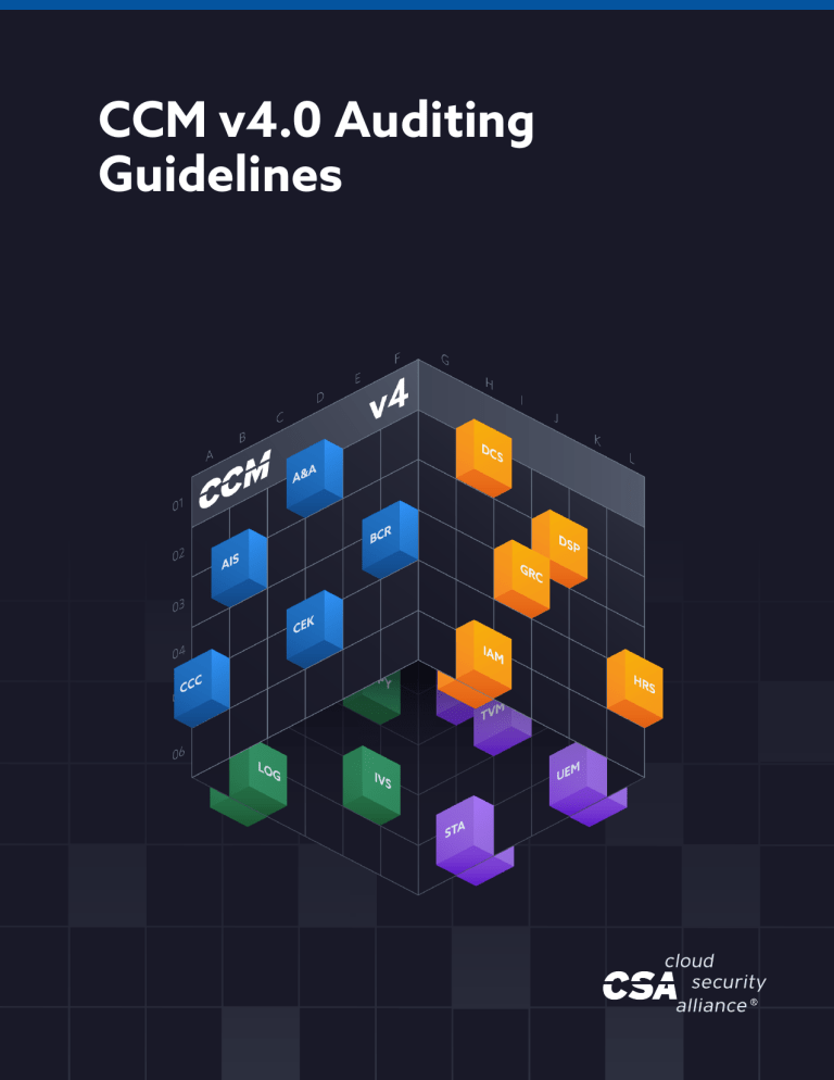 CCM v4.0 Auditing Guidelines About the CCM Working Group The CCM WG comprises professionals from the cloud industry, such as cloud security professionals, auditors, operators and a great number of organizations, representing both providers and consumers of the cloud, as well as consulting/auditing firms. The CCM v4 and the Auditing Guidelines is the result of a collective work that is built on the experience and feedback collected from the group and is meant to provide the community with one of the best vendor-neutral cloud security and privacy control frameworks. The activities of the WG are supervised by co-chairs, who are highly experienced professionals, representing 3 roles in the cloud industry, the Cloud Service Provider (CSP), the Cloud Service Consumer (CSC) and Cloud auditor. © 2021 Cloud Security Alliance – All Rights Reserved. You may download, store, display on your computer, view, print, and link to the Cloud Security Alliance at https://cloudsecurityalliance.org subject to the following: (a) the draft may be used solely for your personal, informational, noncommercial use; (b) the draft may not be modified or altered in any way; (c) the draft may not be redistributed; and (d) the trademark, copyright or other notices may not be removed. You may quote portions of the draft as permitted by the Fair Use provisions of the United States Copyright Act, provided that you attribute the portions to the Cloud Security Alliance. © Copyright 2021, Cloud Security Alliance. All rights reserved. 2 Acknowledgments Lead Authors: Sanjeev Gupta (Team Lead) Parminder Bawa Renu Bedi Damian Heal Jan Jacobsen Bilal Khattak David Nickles Agnidipta Sarkar Steve Sparkes Tanya Tipper-Luster Ashish Vashishtha Contributors: Brian Dorsey Angell Duran Joel John Erik Johnson John D. Maria Claus Matzke Vani Murthy Michael Roza CCM Leadership: Daniele Catteddu (CSA) Sean Cordero David Nickles Shawn Harris Harry Lu Lefteris Skoutaris (CSA) CSA Global Staff: Claire Lehnert (Design) Stephen Lumpe (Cover) © Copyright 2021, Cloud Security Alliance. All rights reserved. 3 Table of Contents Executive Summary.............................................................................................................................5 1. Introduction.....................................................................................................................................6 1.1 Purpose and Scope...................................................................................................................6 1.2 CCM Compliance Audit Documentation...................................................................................6 1.3 Key Assumptions.....................................................................................................................7 1.4 Target Audience.......................................................................................................................7 1.5 Versioning................................................................................................................................7 2. Auditing Guidelines..........................................................................................................................8 2.1 Audit and Assurance (A&A)......................................................................................................8 2.2 Application and Interface Security (AIS).................................................................................10 2.3 Business Continuity Management and Operational Resilience (BCR)..................................... 12 2.4 Change Control and Configuration Management (CCC)......................................................... 15 2.5 Cryptography, Encryption and Key Management (CEK).......................................................... 18 2.6 Datacenter Security (DCS).....................................................................................................24 2.7 Data Security and Privacy Lifecycle Management (DSP).........................................................29 2.8 Governance, Risk Management and Compliance (GRC).........................................................39 2.9 Human Resources (HRS)........................................................................................................42 2.10 Identity and Access Management (IAM).............................................................................. 46 2.11 Interoperability and Portability (IPY)..................................................................................... 51 2.12 Infrastructure and Virtualization Security (IVS)..................................................................... 52 2.13 Logging and Monitoring (LOG)............................................................................................. 55 2.14 Security Incident Management, E-Discovery, and Cloud Forensics (SEF)..............................58 2.15 Supply Chain Management, Transparency, and Accountability (STA)....................................60 2.16 Threat and Vulnerability Management (TVM)...................................................................... 64 2.17 Universal Endpoint Management (UEM)...............................................................................67 Acronyms...........................................................................................................................................70 Glossary............................................................................................................................................. 71 © Copyright 2021, Cloud Security Alliance. All rights reserved. 4 Executive Summary The Cloud Security Alliance (CSA) Cloud Controls Matrix (CCM) provides fundamental security principles, controls, and controls criteria to guide cloud service providers (CSPs) and cloud service customers (CSCs) seeking secure implementation, assessment, and management of cloud services security risks. The CSA CCM provides a 
