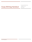 Dr Jeunese Adrienne Payne Essay Writing Handout Essay Writing Handout JP662@cam.ac.uk March, 2018 1 1. Why Essays? R1. Definitions of Terms Essays give you the opportunity to demonstrate a wide range of skills. A good essay shows that you: R.1.1. Critical Question Terms • • • • • Have engaged with the material and learning Are able to identify and prioritise appropriate material to read Understand and are able to evaluate that material Can select and apply the most relevant material to a task Can construct an effective argument and arrive at a wellsupported conclusion Often, it isn’t until you try to communicate an argument and its evidence (through an essay, in a lecture, to your peers, etc.) that you discover where the gaps are. In this way, essays help you consolidate and make sense of what you’ve learned. They do this by helping you organise your thinking on topics. With essays, you are also typically restricted by a small word limit and/or little writing time; this encourages you to produce an essay that is precise, concise, and clear – an important skill in itself, beyond university. Other transferable skills from essay writing include: ability to organise ideas; ability to manage time; ability to argue a case and communicate effectively; active reading; critical thinking; and analysis. 2. General Advice An essay is not just about showing what you know. A good essay, whether for an exam or during term-time, is one that applies what you have learned to the task of addressing the specific essay question. With this in mind, the general advice is: • • • • • Answer the question; keep it relevant Develop a logical and clearly structured argument Support and illustrate your argument Go beyond description to demonstrate critical thinking Practice writing and proofreading 3. Plan Your Essay Every essay needs a strong and clear structure, organized around an argument. The planning process is likely to be iterative for term-time essays. In an exam setting, where time is limited, it can seem like a waste of time to brainstorm and plan before beginning. However, creating a plan, even in exams, should help you in a number of ways: 1. 2. The process of creating a plan helps you identify the most relevant points rather than the first ones that come to mind. Having a plan with key ideas written down to refer back to allows you to rely less on your working memory as you write. Essay Writing Handout Analyse: Break the issue down into parts; present evidence for/against these parts and how they interrelate to inform your final argument on the topic. Assess/to what extent: With evidence, weigh up different stances to make a judgement about the extent to which an assertion is true/you agree with it. Discuss (debate): Make a case for or against an argument with reasoning and evidence before arriving at a conclusion. Evaluate: Give a verdict/weigh up to what extent an assertion is true based on evidence for and against. Examine: Establish key facts and issues relevant to the topic and justify why these are important, in context. Also, provide an evaluation (see directly above). Justify: Make a case for an idea/point of view and back this up with evidence, considering and debunking the opposing view(s) before coming to a conclusion. Review: Recap/summarise the main themes/points and comment on any major arguments arising from them in relation to your own stance on the topic. R.1.2. Descriptive Question Terms Clarify: Explain (see below) the concept/topic in simpler/clearer terms. Compare: Concentrate on the similarities between 2+ subjects, and point out where they diverge. Contrast: Concentrate on the differences between two+ subjects. Define: Give the meaning; bring attention to different interpretations and problems with the definition. Demonstrate/illustrate/show: Present the stages/factors that give rise to a phenomenon or show how an assertion is valid; present in a logical order with examples/evidence/reasoned arguments. Describe/give an account of: Objectively provide insight into the main characteristics of the subject; explain how and why a phenomenon has occurred. Elaborate: Give more detail/information. 2 3. If you run out of time in an exam, the reader may be inclined to look at the points you were hoping to make. Just make sure you cross the plan out so that the examiner doesn’t include it as part of your essay! You don’t get points in essays for lists and diagrams. Explain: Answer “what”, “how”, and “why” (as if teaching); make clear and simple; define key terms and substantiate with relevant research. Explore: Consider, in an objective and questioning (less argumentative) tone, different stances on the topic and reconcile them where possible. Identify: Point out and describe key points/ideas in relation to the topic/argument, including implications. Outline: Organise and present the main/global points and inter-relations. Summarise: Give the condensed and/or general version of main points. R2. Word Choice You need to choose your words wisely so that they do not get in between the intended message and your reader. Formal, precise words don’t make your essay boring; they help you communicate your message objectively, clearly, and confidently. R2.1. Choosing Strong Verbs In creating a plan, you should attempt to garner as much guidance as you can from the essay question. Deconstruct the essay question and examine every word (see Reference 1. Definitions of Terms). Use the component parts to build up your essay answer; respond to every element of the question in corresponding measures. 3.1. Introduction The introduction should lead into a focused argument. Every sentence needs to show a progression towards your argument. Some tips for leading into your argument include: • • • • • • • • Re-write/explain how you interpret the question/show your understanding of the task set Challenge or (re-)define the issue/topic Engage with definitions