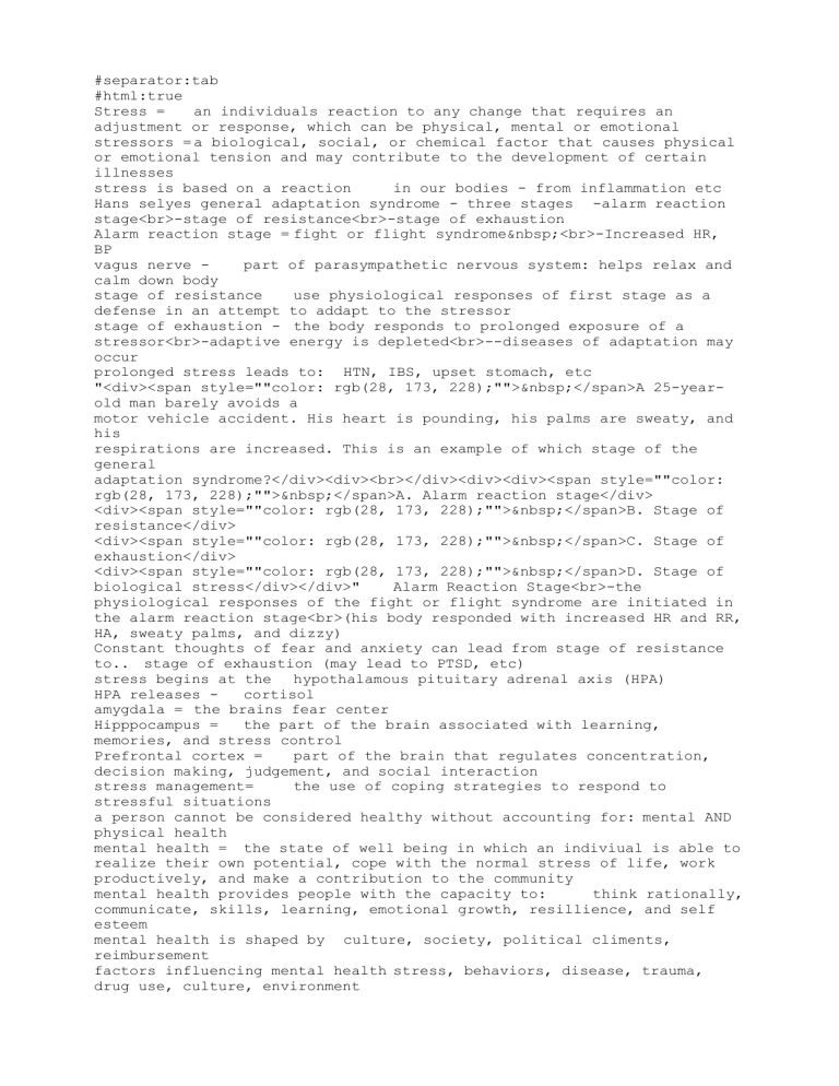 #separator:tab #html:true Stress =an individuals reaction to any change that requires an adjustment or response, which can be physical, mental or emotional stressors =a biological, social, or chemical factor that causes physical or emotional tension and may contribute to the development of certain illnesses stress is based on a reactionin our bodies - from inflammation etc Hans selyes general adaptation syndrome - three stages-alarm reaction stage<br>-stage of resistance<br>-stage of exhaustion Alarm reaction stage =fight or flight syndrome&nbsp;<br>-Increased HR, BP vagus nerve -part of parasympathetic nervous system: helps relax and calm down body stage of resistanceuse physiological responses of first stage as a defense in an attempt to addapt to the stressor stage of exhaustion -the body responds to prolonged exposure of a stressor<br>-adaptive energy is depleted<br>--diseases of adaptation may occur prolonged stress leads to:HTN, IBS, upset stomach, etc "<div><span style=""color: rgb(28, 173, 228);"">&nbsp;</span>A 25-year-old man barely avoids a motor vehicle accident. His heart is pounding, his palms are sweaty, and his respirations are increased. This is an example of which stage of the general adaptation syndrome?</div><div><br></div><div><div><span style=""color: rgb(28, 173, 228);"">&nbsp;</span>A. Alarm reaction stage</div> <div><span style=""color: rgb(28, 173, 228);"">&nbsp;</span>B. Stage of resistance</div> <div><span style=""color: rgb(28, 173, 228);"">&nbsp;</span>C. Stage of exhaustion</div> <div><span style=""color: rgb(28, 173, 228);"">&nbsp;</span>D. Stage of biological stress</div></div>"Alarm Reaction Stage<br>-the physiological responses of the fight or flight syndrome are initiated in the alarm reaction stage<br>(his body responded with increased HR and RR, HA, sweaty palms, and dizzy) Constant thoughts of fear and anxiety can lead from stage of resistance to..stage of exhaustion (may lead to PTSD, etc) stress begins at thehypothalamous pituitary adrenal axis (HPA) HPA releases -cortisol amygdala =the brains fear center Hipppocampus =the part of the brain associated with learning, memories, and stress control Prefrontal cortex =part of the brain that regulates concentration, decision making, judgement, and social interaction stress management=the use of coping strategies to respond to stressful situations a person cannot be considered healthy without accounting for:mental AND physical health mental health =the state of well being in which an indiviual is able to realize their own potential, cope with the normal stress of life, work productively, and make a contribution to the community mental health provides people with the capacity to:think rationally, communicate, skills, learning, emotional growth, resillience, and self esteem mental health is shaped byculture, society, political climents, reimbursement factors influencing mental healthstress, behaviors, disease, trauma, drug use, culture, environment social determinants of healtha persons MH is shaped by various enviorments operating at different stages of life.&nbsp;<br>-social inequalities (the higher the inequality the higher the risk) positive stress =&nbsp;eustress Maslows hierarchy of needs-self actualization<br>-self esteem/respect of others<br>-love and belonging<br>-safety and security<br>-physiological needs (1st) physiological needsfood, water, air, sleep, exercise, shelter safety and securityavoiding harm and protection<br>-maintain comfort, order, structure<br>-physical safety<br>-freedom from fear love and belonginggiving and receiving affection<br>-companionship<br>-interpersonal relationships<br>-identification with a group self esteem / respect of othersthe individual seeks self-respect and respect of others<br>-works to achieve success and recognition<br>-desires prestige from accomplishments self actualization&nbsp;self fulfillment<br>realization of highest potential "Self actualized individuals' posses:&nbsp;"appropriate perceptions of reality, accepting oneself or others, spontaneity, focus/concentration, problem solving, privacy, creativeness, ethics, etc Burdents of mental illness1. the illness itself<br>2. the stigma attached to the disorder "Mental Health Parity Act 1996-&nbsp;""required insurers that provide mental health coverage to offer annual and lifetime benefits at the same level provided for medical/surgical coverage; By 2000, the Govt found that only 86% of health plans actually complied with the law." DSM-V"<div>•Developed by APA for evaluation of the client’s mental status and standardization of symptomology to develop diagnoses of mental illness.</div><div><br></div><div>-For clinicians to have a common language to communicate characteristics of mental disorders presented by their patients</div>" 4 out of 10 disabilities in the US are related to:mental health disorders DSM =diagnostic statistical manual DSM determines-what classifies as a disorder vs what doesnt a disorder is diagnosed when it starts to affect:level of functioning (ADLs, quality of life) holistic carebiological, psychological, social, and spiritual components treatment of mental disorders is:"multidisciplinary<br>-Nurses, social workers, mental health technicians, nurse practitioners, general practitioners, case managers, etc." therapeutic use of self"the ability to use one’s personality consciously &amp; in full awareness in an attempt to establish relatedness &amp; structure nursing interventions" therapeutic use of self requires:"Requires self awareness &amp; self understanding/compassion<br>-Foundation of philosophical belief about life, death, &amp; overall human condition" <div>•Hildegard Peplau (1962) =</div>considered mother of psychiatric nursing…identified counseling as major sub-role of psychiatric nursing "<span style=""color: rgb(0, 0, 0);"">Hildegard Peplau - theory of interpersonal relationships in nursing</span>"descrives the nurse-patient relationship as the foundation of nurse 