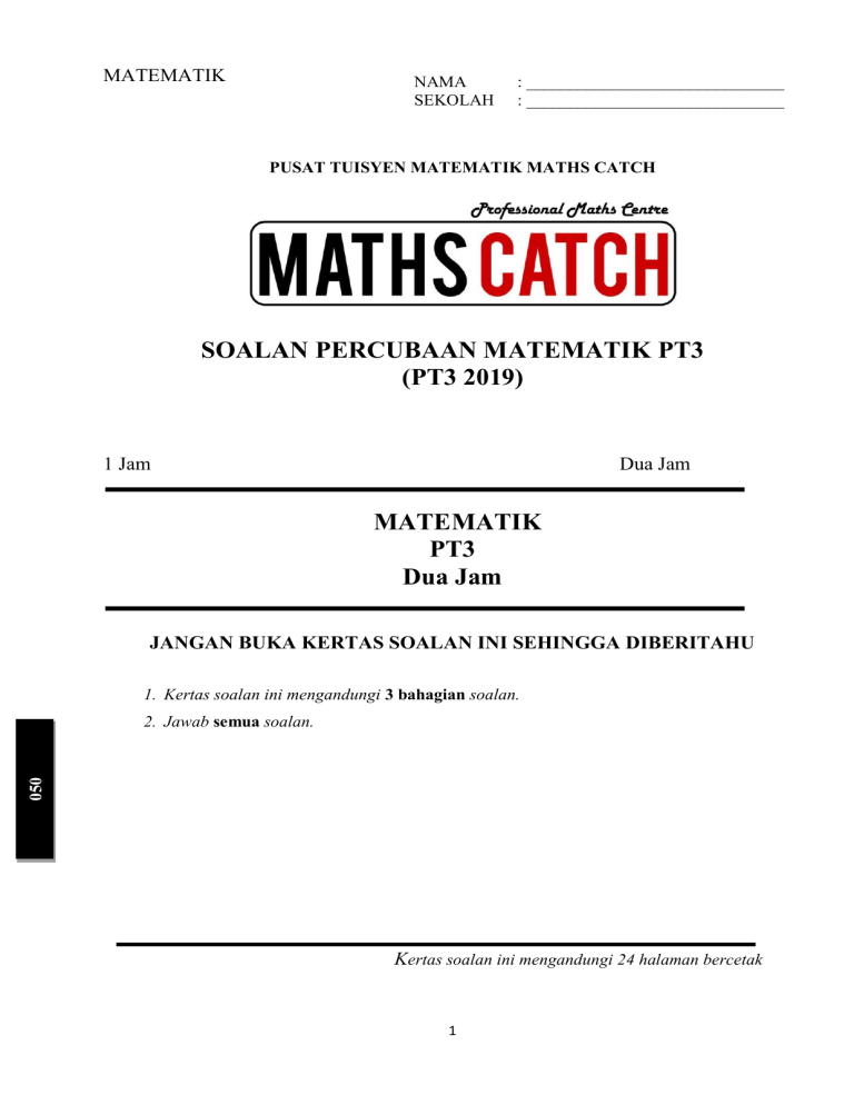 MATHS Catch USAHA +DOA+TAWAKAL MATEMATIK NAMA SEKOLAH : ______________________________ : ______________________________ SEKOLAH: ____________________________ PUSAT TUISYEN MATEMATIK MATHS CATCH SOALAN PERCUBAAN MATEMATIK PT3 (PT3 2019) 1 Jam Dua Jam MATEMATIK PT3 Dua Jam JANGAN BUKA KERTAS SOALAN INI SEHINGGA DIBERITAHU 1. Kertas soalan ini mengandungi 3 bahagian soalan. 050 2. Jawab semua soalan. Kertas soalan ini mengandungi 24 halaman bercetak 1 MATHS Catch USAHA +DOA+TAWAKAL 7 MATHS Catch USAHA +DOA+TAWAKAL 8 MATHS Catch USAHA +DOA+TAWAKAL 9 MATHS Catch USAHA +DOA+TAWAKAL Bahagian B [20 markah] Jawab semua soalan. [4 markah/ marks] 10 MATHS Catch USAHA +DOA+TAWAKAL 11 MATHS Catch USAHA +DOA+TAWAKAL BAHAGIAN C / SECTION C (60 Markah / Marks) Jawab semua soalan. Answer all questions. QUESTION 1 / SOALAN 1 ________________________________________________________________________________ 12 MATHS Catch USAHA +DOA+TAWAKAL 13 MATHS Catch USAHA +DOA+TAWAKAL QUESTION 2 / SOALAN 2 _________________________________________________________________________________ 14 MATHS Catch USAHA +DOA+TAWAKAL 15 MATHS Catch USAHA +DOA+TAWAKAL QUESTION 3 / SOALAN 3 _________________________________________________________________________________ 16 MATHS Catch USAHA +DOA+TAWAKAL 17 MATHS Catch USAHA +DOA+TAWAKAL QUESTION 4 / SOALAN 4 18 MATHS Catch USAHA +DOA+TAWAKAL QUESTION 5 / SOALAN 5 ________________________________________________________________________________ 19 MATHS Catch USAHA +DOA+TAWAKAL QUESTION 6 / SOALAN 6 20 MATHS Catch USAHA +DOA+TAWAKAL 21