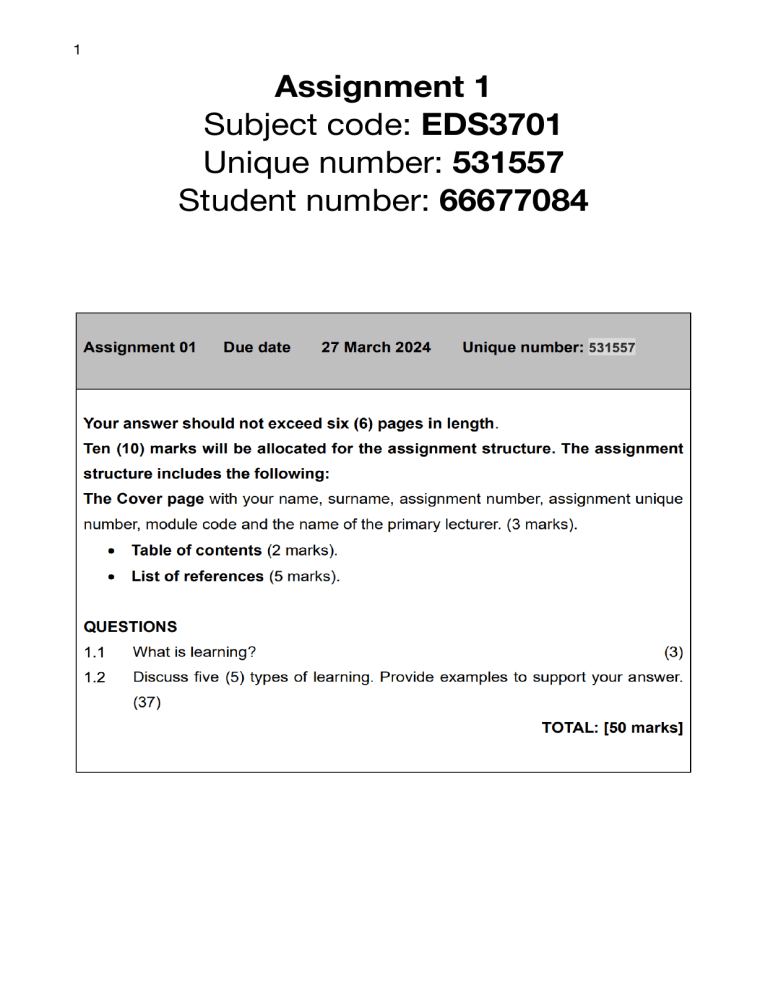 1 Assignment 1 Subject code: EDS3701 Unique number: 531557 Student number: 66677084 2 Table of Contents Cover page Questions Table of contents Answers Sources 1 1 2 3 3 3 Question 1: 1.1 What is learning? • • • Learning is the result of a change made in behaviour. The action; learning , happens when we experience something. Learning is the acquisition of knowledge, information and skills. Learning is not just part of our lives as children and young adults in school but it is an ongoing process that we experience throughout our entire lives. 1.2 • • • • • (3) Discuss ve (5) types of learning. Provide examples to support your answer. (37) Visual - This is when we use physical examples during practicals or when the teacher does an experiment and the learners view the actions of the teacher and the actions or reactions of the experiment. Auditory - This is when the learners attains knowledge while the teacher is speaking or giving instruction. The can clarify any confusion by hearing what the teacher says and then replying with an answer or question. Kinesthetic - This is when learners do a physical activity or get to be hands on. This is an activity where the learner is physically active using his/her body. Verbal - This is when teachers discuss answer and or theories. Writing them down is also part. They get to engage with other learners and their thought by using this method. Social - This is a learning style where the learners get to discuss, hear and mediate on their own thoughts and the ideas of others. It is a collaborative space where all the other 4 styles are in unison. fi fi fi Sources: • https://craftythinking.com/the-5-learning-styles/ #:~:text=The%20 ve%20main%20learning%20styles,preferences%20and%20strengths%20i n%20learning. • https://bau.edu/blog/types-of-learning-styles/ #:~:text=This%20model%20identi es%20four%20types,a%20complementary%20way%20of %20teaching. • https://teach.com/what/teachers-know/learning-styles/