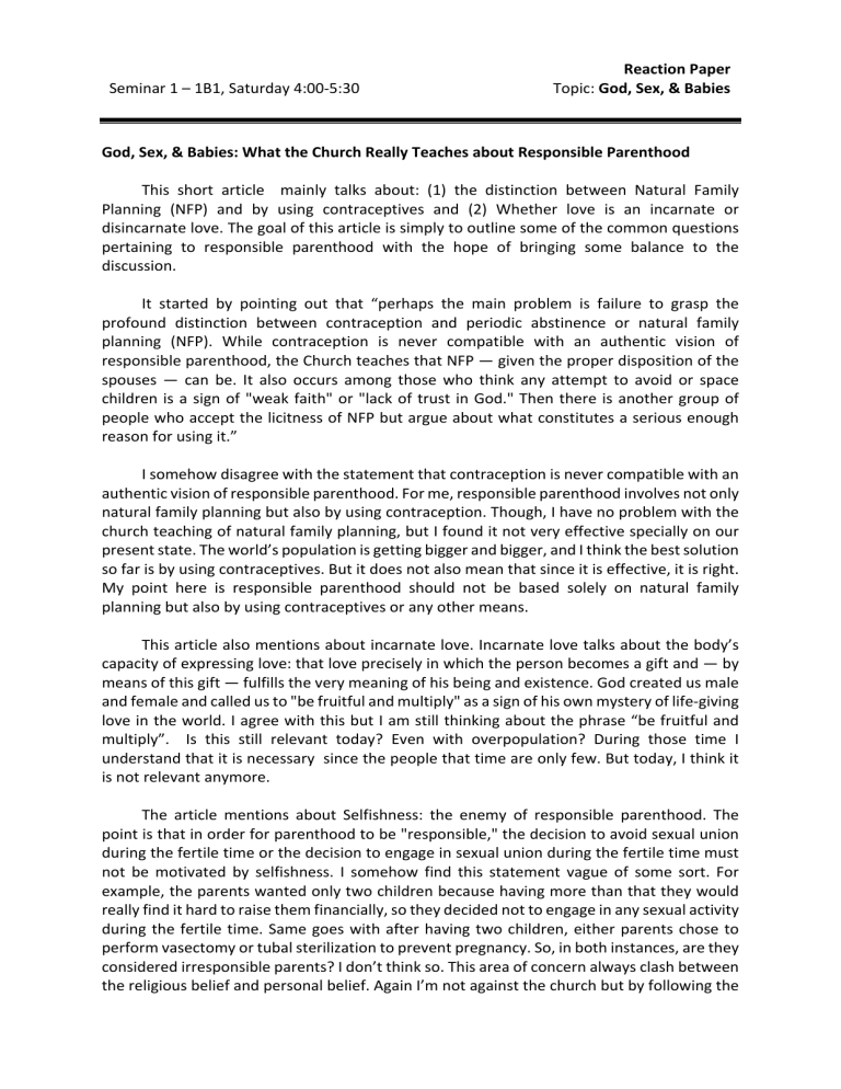 Seminar 1 – 1B1, Saturday 4:00-5:30 Reaction Paper Topic: God, Sex, & Babies God, Sex, & Babies: What the Church Really Teaches about Responsible Parenthood This short article mainly talks about: (1) the distinction between Natural Family Planning (NFP) and by using contraceptives and (2) Whether love is an incarnate or disincarnate love. The goal of this article is simply to outline some of the common questions pertaining to responsible parenthood with the hope of bringing some balance to the discussion. It started by pointing out that “perhaps the main problem is failure to grasp the profound distinction between contraception and periodic abstinence or natural family planning (NFP). While contraception is never compatible with an authentic vision of responsible parenthood, the Church teaches that NFP — given the proper disposition of the spouses — can be. It also occurs among those who think any attempt to avoid or space children is a sign of "weak faith" or "lack of trust in God." Then there is another group of people who accept the licitness of NFP but argue about what constitutes a serious enough reason for using it.” I somehow disagree with the statement that contraception is never compatible with an authentic vision of responsible parenthood. For me, responsible parenthood involves not only natural family planning but also by using contraception. Though, I have no problem with the church teaching of natural family planning, but I found it not very effective specially on our present state. The world’s population is getting bigger and bigger, and I think the best solution so far is by using contraceptives. But it does not also mean that since it is effective, it is right. My point here is responsible parenthood should not be based solely on natural family planning but also by using contraceptives or any other means. This article also mentions about incarnate love. Incarnate love talks about the body’s capacity of expressing love: that love precisely in which the person becomes a gift and — by means of this gift — fulfills the very meaning of his being and existence. God created us male and female and called us to "be fruitful and multiply" as a sign of his own mystery of life-giving love in the world. I agree with this but I am still thinking about the phrase “be fruitful and multiply”. Is this still relevant today? Even with overpopulation? During those time I understand that it is necessary since the people that time are only few. But today, I think it is not relevant anymore. The article mentions about Selfishness: the enemy of responsible parenthood. The point is that in order for parenthood to be "responsible," the decision to avoid sexual union during the fertile time or the decision to engage in sexual union during the fertile time must not be motivated by selfishness. I somehow find this statement vague of some sort. For example, the parents wanted only two children because having more than that they would really find it hard to raise them financially, so they decided not to engage in any sexual activity during the fertile time. Same goes with after having two children, either parents chose to perform vasectomy or tubal sterilization to prevent pregnancy. So, in both instances, are they considered irresponsible parents? I don’t think so. This area of concern always clash between the religious belief and personal belief. Again I’m not against the church but by following the above statement to become responsible parents, you can’t control how many children you wanted to have. Finally, I observed that in certain countries where the families limit their children by using contraceptives, their quality of life is much better and their country is progressive compared to other countries where using contraceptives is against their religious belief such as the Philippines.