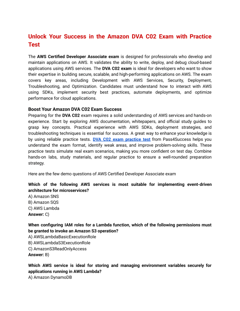 Unlock Your Success in the Amazon DVA C02 Exam with Practice Test The AWS Certified Developer Associate exam is designed for professionals who develop and maintain applications on AWS. It validates the ability to write, deploy, and debug cloud-based applications using AWS services. The DVA C02 exam is ideal for developers who want to show their expertise in building secure, scalable, and high-performing applications on AWS. The exam covers key areas, including Development with AWS Services, Security, Deployment, Troubleshooting, and Optimization. Candidates must understand how to interact with AWS using SDKs, implement security best practices, automate deployments, and optimize performance for cloud applications. Boost Your Amazon DVA C02 Exam Success Preparing for the DVA C02 exam requires a solid understanding of AWS services and hands-on experience. Start by exploring AWS documentation, whitepapers, and official study guides to grasp key concepts. Practical experience with AWS SDKs, deployment strategies, and troubleshooting techniques is essential for success. A great way to enhance your knowledge is by using reliable practice tests. DVA C02 exam practice test from Pass4Success helps you understand the exam format, identify weak areas, and improve problem-solving skills. These practice tests simulate real exam scenarios, making you more confident on test day. Combine hands-on labs, study materials, and regular practice to ensure a well-rounded preparation strategy. Here are the few demo questions of AWS Certified Developer Associate exam Which of the following AWS services is most suitable for implementing event-driven architecture for microservices? A) Amazon SNS B) Amazon SQS C) AWS Lambda Answer: C) When configuring IAM roles for a Lambda function, which of the following permissions must be granted to invoke an Amazon S3 operation? A) AWSLambdaBasicExecutionRole B) AWSLambdaS3ExecutionRole C) AmazonS3ReadOnlyAccess Answer: B) Which AWS service is ideal for storing and managing environment variables securely for applications running in AWS Lambda? A) Amazon DynamoDB B) AWS Systems Manager Parameter Store C) AWS Secrets Manager Answer: B)