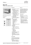 Products Base units PNOZ m1p coated version Base units from the PNOZmulti modular safety system Approvals PNOZ m1p coated version Unit features Chip card ` Can be configured in the PNOZmulti Configurator ` Positive-guided relay outputs: – 1 safety output in accordance with EN 954-1, Cat. 4 or 2 safety outputs in accordance with EN 954-1, Cat. 2 ` Semiconductor outputs: – 2 safety outputs in accordance with EN 954-1, Cat. 4 or 4 safety outputs in accordance with EN 954-1, Cat. 3 – 1 auxiliary output ` 4 test pulse outputs ` 1 cascading input and output can also be used as a standard output ` 20 inputs for connecting: – E-STOP pushbutton – Two-hand button – Safety gate limit switch – Reset button – Light beam devices – Scanner – Enable switch – PSEN – Operating mode selector switch – Safety mats ` Muting function ` Connectable: – 8 expansion modules on the right – 1 fieldbus module on the left – 4 expansion modules on the left ` LED for: – Diagnostics – Supply voltage – Output circuits – Input circuits ` Test pulse outputs used to detect shorts across the inputs ` Monitoring of shorts between the safety outputs ` Plug-in connection terminals (either cage clamp terminal or screw terminal) Chip cards are available with memories of 8 kByte and 32 kByte. For largescale projects we recommend the 32 kByte chip card (see chapter containing the order references). The chip card with a memory of 32 kByte can only be used from PNOZ m1p Version 2.0. Safety features The relay conforms to the following safety criteria: ` The circuit is redundant with built-in self-monitoring. ` The safety function remains effective in the case of a component failure. ` The relay contacts meet the requirements for safe separation through increased insulation compared with all other circuits in the safety system. ` The safety outputs are tested periodically using a disconnection test. Unit description The PNOZmulti modular safety system is used for the safety-related interruption of safety circuits and is designed for use on: ` Emergency stop equipment ` Safety circuits in accordance with VDE 0113 Part 1 and EN 60204-1 Pilz GmbH & Co. KG, Sichere Automation, Felix-Wankel-Straße 2, 73760 Ostfildern, Germany Telephone: +49 711 3409-0, Telefax: +49 711 3409-133, E-Mail: pilz.gmbh@pilz.de NSG-D-2-361-2007-09 Products Base units PNOZ m1p coated version Block diagram I0 I1 I2 I3 I4 I5 I6 I7 I8 I9 I10 I11 I12 I13 I14 I15 I16 I17 I18 I19 = 13 23 Input = O4 O5 Power Cascading CI+ CI- CO+CO- Test pulse output T0 T1 T2 T3 O0 O1 O2 O3 24 V 0V 24 V 0V OA0 Pilz GmbH & Co. KG, Sichere Automation, Felix-Wankel-Straße 2, 73760 Ostfildern, Germany Telephone: +49 711 3409-0, Telefax: +49 711 3409-133, E-Mail: pilz.gmbh@pilz.de Interface expansion module Interface Interface RS 232 diagnostic chip card module A1 A2 14 24 NSG-D-2-361-2007-09 -2 Products Base units PNOZ m1p coated version Function description The function of the inputs and outputs on the safety system depends on the safety circuit created using the PNOZmulti Configurator. A chip card is used to download the safety circuit to the base unit. The base unit has 2 microcontrollers that monitor each other. They evaluate the input circuits on the base unit and expansion modules and switch the outputs on the base unit and expansion modules accordingly. The online help on the PNOZmulti Configurator contains descriptions of the operating modes and all the functions of the PNOZmulti safety system, plus connection examples. Wiring The wiring is defined in the circuit diagram in the Configurator. There you can select the inputs that are to perform a particular safety function and the outputs that will switch this safety function. Please note: ` Information given in the "Technical details" must be followed. ` Outputs: – O0 to O5 are safety outputs. – O4 and O5 are relay outputs – O0 to O3 are semiconductor outputs – OA0 is an auxiliary output. ` To prevent contact welding, a fuse should be connected before the output contacts (see technical details). ` Use copper wire that can withstand 75 °C. ` Sufficient fuse protection must be provided on all output contacts with inductive loads. ` Power for the safety system and input circuits must always be provided from a single power supply. The power supply must meet the regulations for extra low voltages with safe separation. ` Two connection terminals are available for each of the supply connections 24 V and 0 V (semiconductor outputs), plus A1 and A2 (power supply). This means that the supply voltage can be looped through several connections. The current at each terminal may not exceed 9 A. ` Test pulse outputs must exclusively be used to test the inputs. They must not be used to drive loads. Do not route the test pulse lines together with actuator cables within an unprotected multicore cable. ` Test pulse outputs are also used to supply safety mats that trigger a short circuit. Where test pulses are used for the safety mat, they may not be reused for other purposes. Safety mats are supported from Version 4.3 of the base unit. Pilz GmbH & Co. KG, Sichere Automation, Felix-Wankel-Straße 2, 73760 Ostfildern, Germany Telephone: +49 711 3409-0, Telefax: +49 711 3409-133, E-Mail: pilz.gmbh@pilz.de NSG-D-2-361-2007-09 Products Base units PNOZ m1p coated version Preparing for operation ` Supply voltage Supply voltage AC DC For the safety system (connector X7) For the semiconductor outputs (connector X2) Must always be present, even if the semiconductor outputs are not used A1 + 24 V DC A2 0V 24 V + 24 V DC 0V 0V Connection examples ` Input circuit Input circuit E-STOP without detection of shorts across contacts E-STOP with detection of shorts across contacts Single-channel Dual-channel I0 S1 L+ I0 S1 L+ L+ I1 S1 S1 I0 I0 T0 T1 T0 Input circuit without detection of shorts across contacts Input circuit with detection of shorts across contacts I1 ` Reset circuit Reset circuit S3 I5 S3 I5 L+ T0 Pilz GmbH & 