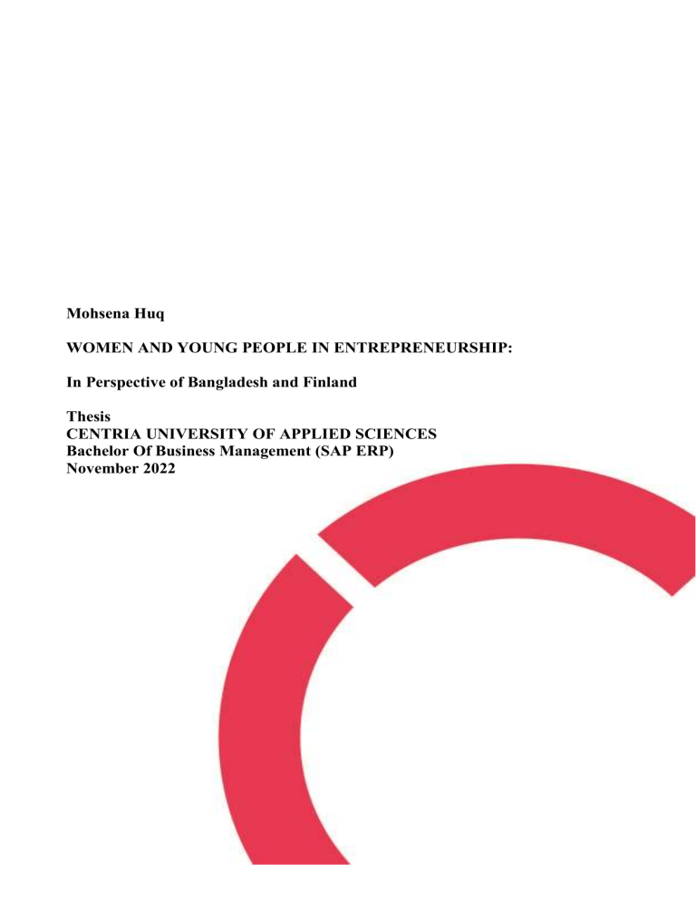 Mohsena Huq WOMEN AND YOUNG PEOPLE IN ENTREPRENEURSHIP: In Perspective of Bangladesh and Finland Thesis CENTRIA UNIVERSITY OF APPLIED SCIENCES Bachelor Of Business Management (SAP ERP) November 2022 ABSTRACT Centria University of Applied Sciences Date Xxxx 2022 Author Mohsena Huq Degree programme Bachelors of Business Management (SAP ERP) Name of thesis WOMEN AND YOUNG PEOPLE IN ENTREPRENEURSHIP: In Perspective of Bangladesh and Finland Centria supervisor Pages Paula Tornikoski 35 Instructor representing commissioning institution or company First name Last name There is a growing interest in entrepreneurship among women and young people in Bangladesh and Finland. This is likely due to a number of factors, including the increasing global interconnectedness of economies and the rise of the Internet and social media. In Bangladesh, youth unemployment is a major problem, and entrepreneurship can provide an opportunity for women and young people to create their own jobs. In Finland, meanwhile, young people are often highly educated and have access to world-class technology and infrastructure. This makes it easier for them to start and grow businesses. This research is about identifying young people and women's thoughts on entrepreneurship. In particular, views, social influence, observed behavior, motivation, learning, and support will be considered in order to measure intent. I seek enlightenment by assessing their views and intentions. Key words Entrepreneurship; Intention; Vrooms theory; Push Factors; Pull Factors; Generations theory; Women and Young People; Bangladesh and Finland perspective; Entrepreneurship scenario in both countries. ABSTRACT CONCEPT DEFINITIONS CONTENTS 1 INTRODUCTION................................................................................................................................1 1.1 Background: ...................................................................................................................................1 1.2 Research objective ..........................................................................................................................2 2 THEORETICAL FRAMEWORK .....................................................................................................4 2.1 Entrepreneurship ...........................................................................................................................4 2.2 Intention ..........................................................................................................................................4 2.3 Entrepreneur and Entrepreneurial Intention .............................................................................5 2.4 Motivation to be an Entrepreneur ................................................................................................6 2.4.1 Pull factors .............................................................................................................................7 2.4.2 Push factors ...........................................................................................................................7 2.5 Vroom’s (1964) expectancy framework: ......................................................................................8 2.6 Theory of generations ....................................................................................................................8 2.6.1 Generations............................................................................................................................8 2.6.2 Work preference of generations ..........................................................................................9 2.7 Factors Affecting Entrepreneurial Intention.............................................................................11 2.8 Relationship between Entrepreneurial Intention and Various Determinants .......................12 3. Entrepreneurship in Bangladesh………………………………………………………………...13 3.1 Educational inspiration in Bangladesh ......................................................................................13 3.2 Support programs in motivating entrepreneurship in Bangladesh ........................................14 3.3 E-business in motivating entrepreneurship in Bangladesh ......................................................15 3.4 Reasons why Bangladeshi women are so enthusiastic about entrepreneurship……………..15 3.5 Start-up scenario in Bangladesh………………………………………………………………..15 3.6 Scopes for garments business and textile business in Bangladesh……………………………15 3.7 Challenges starting new business in Bangladesh………………………………………………15 4. Entrepreneurship in Finland………………………………………………………………………15 4.1 Educational inspiration in Finland……………………………………………………………..15 4.2 Entrepreneurship in Finnish youngsters………………………………………………………15 4.3 Support programs in motivating entrepreneurship in Finland………………………………15 4.4 E-Commerce in Finland………………………………………………………………………...15 4.5 Finnish women in workforce……………………………………………………………………15 4.6 Start-up scenario in Finland…………………………………………………………………….15 4.7 Scopes for garments business and textile business in Finland………………………………15 4.8 Challenges starting new business in Finland……………………………………………….....15 5. Findings……………………………………………………………………………………………15 Conclusion………………………………………………………………………………………….