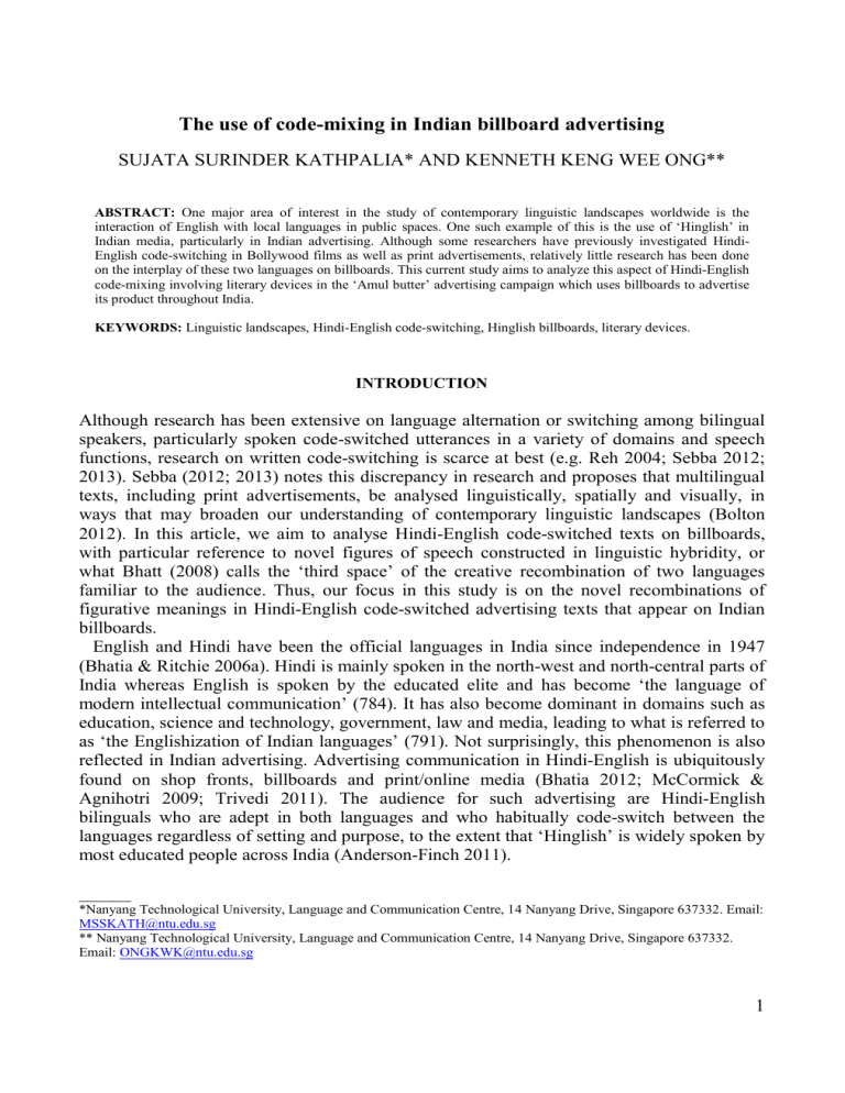 The use of code-mixing in Indian billboard advertising SUJATA SURINDER KATHPALIA* AND KENNETH KENG WEE ONG** ABSTRACT: One major area of interest in the study of contemporary linguistic landscapes worldwide is the interaction of English with local languages in public spaces. One such example of this is the use of ‘Hinglish’ in Indian media, particularly in Indian advertising. Although some researchers have previously investigated HindiEnglish code-switching in Bollywood films as well as print advertisements, relatively little research has been done on the interplay of these two languages on billboards. This current study aims to analyze this aspect of Hindi-English code-mixing involving literary devices in the ‘Amul butter’ advertising campaign which uses billboards to advertise its product throughout India. KEYWORDS: Linguistic landscapes, Hindi-English code-switching, Hinglish billboards, literary devices. INTRODUCTION Although research has been extensive on language alternation or switching among bilingual speakers, particularly spoken code-switched utterances in a variety of domains and speech functions, research on written code-switching is scarce at best (e.g. Reh 2004; Sebba 2012; 2013). Sebba (2012; 2013) notes this discrepancy in research and proposes that multilingual texts, including print advertisements, be analysed linguistically, spatially and visually, in ways that may broaden our understanding of contemporary linguistic landscapes (Bolton 2012). In this article, we aim to analyse Hindi-English code-switched texts on billboards, with particular reference to novel figures of speech constructed in linguistic hybridity, or what Bhatt (2008) calls the ‘third space’ of the creative recombination of two languages familiar to the audience. Thus, our focus in this study is on the novel recombinations of figurative meanings in Hindi-English code-switched advertising texts that appear on Indian billboards. English and Hindi have been the official languages in India since independence in 1947 (Bhatia & Ritchie 2006a). Hindi is mainly spoken in the north-west and north-central parts of India whereas English is spoken by the educated elite and has become ‘the language of modern intellectual communication’ (784). It has also become dominant in domains such as education, science and technology, government, law and media, leading to what is referred to as ‘the Englishization of Indian languages’ (791). Not surprisingly, this phenomenon is also reflected in Indian advertising. Advertising communication in Hindi-English is ubiquitously found on shop fronts, billboards and print/online media (Bhatia 2012; McCormick & Agnihotri 2009; Trivedi 2011). The audience for such advertising are Hindi-English bilinguals who are adept in both languages and who habitually code-switch between the languages regardless of setting and purpose, to the extent that ‘Hinglish’ is widely spoken by most educated people across India (Anderson-Finch 2011). ______ *Nanyang Technological University, Language and Communication Centre, 14 Nanyang Drive, Singapore 637332. Email: MSSKATH@ntu.edu.sg ** Nanyang Technological University, Language and Communication Centre, 14 Nanyang Drive, Singapore 637332. Email: ONGKWK@ntu.edu.sg 1 Although the term ‘Hinglish’ is commonly used in the literature to refer to Hindi-English code-switching, it needs some clarification as there are divergent views on its meaning. Trivedi (2011: vii) describes this conflict aptly when he comments that “It is obviously a mixture of Hindi and English – but is it the use of Hindi words and syntactic elements in English, or the use of English words and syntax in Hindi?” The other aspect that is problematic is the term ‘Hinglish’ itself as it is closer to English in its pronunciation and spelling, giving the impression that it refers to Hindi-in-English rather than English-in-Hindi (ibid). Yet another aspect concerns the variety of Hindi being referred to in the word blend ‘Hinglish’ – whether it is Mumbai Hindi, Kalkatiya Hindi, Madrasi Hindi or Dakkani Hindi on the one hand, or common mainstream Hindi (Theth Hindi), Sanskritised Hindi (Pandit’s Hindi) or Hindustani (influenced by Urdu) on the other. In the context of the present study, Hinglish is used to encompass Hindi-in-English and English-in-Hindi code-mixing as well as code-mixing of English with different varieties of Hindi, including the Hindi-Sanskrit-Urdu hybrid and regional Hindi. Bhatt (2011: 78) states that Hinglish is ‘the language of the street and is the lingo of most college campuses’. As both languages are intertwined and practiced widely and extensively, the linguistic situation is similar to the linguistic ambiguity of markedness in the case of Taiap-Tok Pisin speakers in Papua New Guinea (Stroud 1992; 1998). English nor Hindi can be confidently attributed as the marked or unmarked language as both are typically mixed and used dynamically and frequently – motivation speculation is fruitless in the HindiEnglish context. Bhatt (2008) notes that code-switched advertising texts cleverly exploit the interplay of sociolinguistic similarities and differences of Hindi and English to create enriched and fused meanings that are accessible to bilingual readers in India, although his study was limited to the analysis of only two advertising texts. Previous research on code-switched advertisements has been somewhat limited in scale and depth. Ahn and Ferle (2008) found that Korean youths were more able to recognise and recall brand names in English than in Korean. The hypothesis was that English (the foreign language) in the Roman script is more distinctive and novel than the Hangul script. A similar study by Li and Kalyanaraman (2012) of Chinese participants reading Web editorial content in one language, and advertisements in another language, found that there is higher retentionretrieval of English advertisings messages than Chinese ones. 