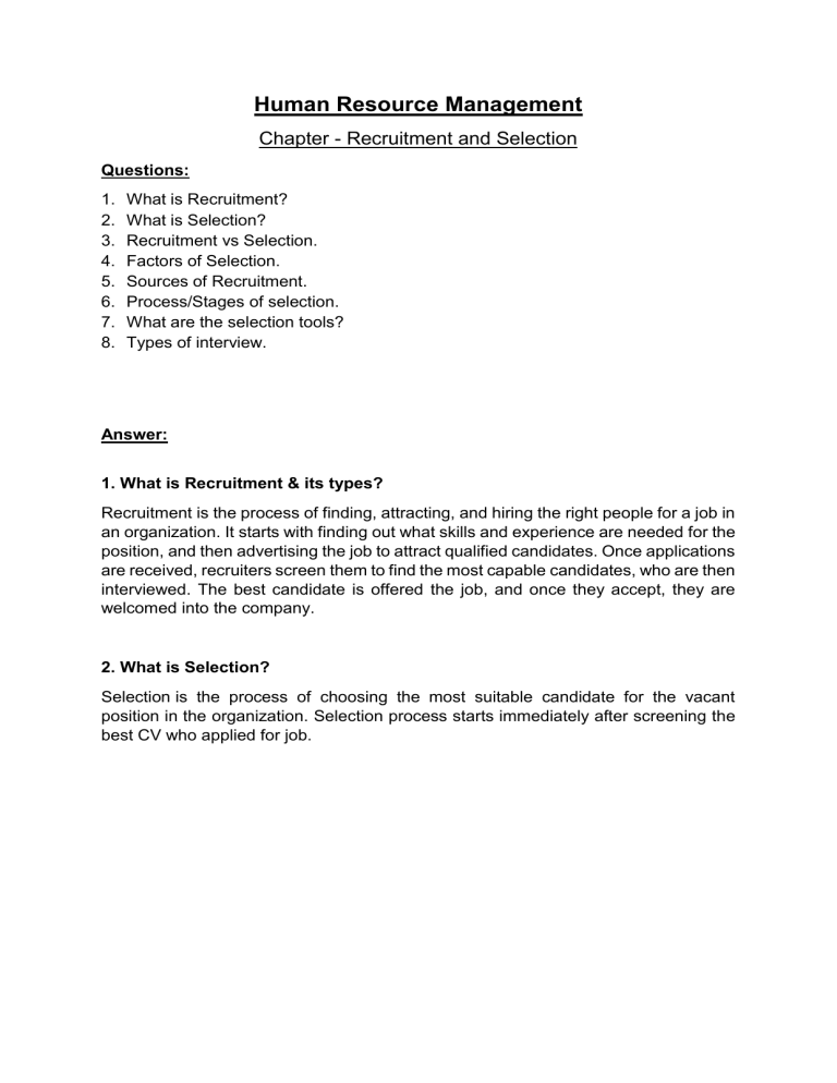Human Resource Management Chapter - Recruitment and Selection Questions: 1. What is Recruitment? 2. What is Selection? 3. Recruitment vs Selection. 4. Factors of Selection. 5. Sources of Recruitment. 6. Process/Stages of selection. 7. What are the selection tools? 8. Types of interview. Answer: 1. What is Recruitment & its types? Recruitment is the process of finding, attracting, and hiring the right people for a job in an organization. It starts with finding out what skills and experience are needed for the position, and then advertising the job to attract qualified candidates. Once applications are received, recruiters screen them to find the most capable candidates, who are then interviewed. The best candidate is offered the job, and once they accept, they are welcomed into the company. 2. What is Selection? Selection is the process of choosing the most suitable candidate for the vacant position in the organization. Selection process starts immediately after screening the best CV who applied for job. 3. Recruitment vs Selection. Feature Meaning Purpose Process Outcome Nature Scope Time Recruitment Recruitment is the process of finding, attracting, and hiring the right people for a job in an organization. Selection Selection is the process of choosing the most suitable candidate for the vacant position in the organization. qualified Choosing the best one. Finding the candidates. Advertising, sourcing, collecting applications. A list of potential candidates. Positive Wide Less time consumed Screening, interviews, tests, background checks. A final job offer to the best candidate. Negative Narrow More time consumed 4. Factors of Selection Selection is the process of choosing the most suitable candidate for the vacant position in the organization. Selection process starts immediately after screening the best CV who applied for job. There are 2 factors of Selection: External factors Internal factors External factors: Supply and demand Unemployment rate Labor Market Political & Social factors Image of Organization Competitors Supply & Demand: More jobs than candidates = Harder hiring, tough competition. Companies need many applicants to find the best fit. Unemployment Rate: More unemployed people = Easier hiring, lower salaries. Fewer unemployed people = Harder hiring, higher salaries. Labour Market: Availability of skilled workers. Right education and qualifications for jobs. Political & Social Factors: Political issues like strikes and conflicts affect hiring. Disasters and pandemics make recruitment difficult. Company Image: A good reputation attracts job seekers. A bad reputation makes hiring tough. Competition: Other companies may offer better pay and benefits. Hard to hire top talent due to competition. Internal factors: Recruitment policy Human Res Planning Size of the firm Cost of recruitment Growth & Expansion Recruitment Policy: Rules on qualification, experience, salary, position, and benefits. Human Resource Plan (HRP): Hiring should match the HR plan not more or less. Size of the Firm: Business capacity, strength, and stability affect hiring. Cost of Recruitment: Expenses like expert hiring, ads, venue rent, and accommodation. Growth & Expansion: Future business growth and expansion plans influence hiring needs. 5. Sources of Recruitment Recruitment is the process of finding, attracting, and hiring the right people for a job in an organization. There are 2 sources: 1. INTERNAL 2. EXTERNAL Internal Sources: Current Employee References from present employee Data bank of former applicants Retired Employee Former/Ex employee Job rotation/Transfer Current Employees: Giving promotions or department changes to existing staff. Employee Referrals: Workers suggest qualified candidates. Data Bank of Former Applicants: Selecting from past job seekers. Retired Employees: Rehiring skilled retired workers. Ex-Employees: Calling back good employees who left for better opportunities. Job Rotation/Transfer: Moving staff to different roles within the company. External Sources: • Advertising firms • Employment agencies • Headhunters • Referrals and walk-ins • College/University campus • Company’s web site • Website/Online portals • Social Networking Advertising firms: The advertising agencies who work for recruitment. Newspaper, online, billboard, leaflet etc Employment agencies: The agencies who work for recruitment for any department or for any organizations. Headhunters/consulting firms: The third-party professional firms. Referrals and walk-ins: References from any networks, associations, professional firms. Walk in called the instant interview of a referred candidate who may or may not applied in formal process. College/University campus: Job fair, career fair by the employer, companies and spot selections. Company’s web site: The internal website of the company. There is CV Bank. Tracking ID and password are given to control the CV. Website/Online portals: The third-party, vendor system who worked for online services to a company or organizations from the outside. Social Networking: Many types of social networking namely, linkedIn, facebook etc 6. Process/Stages of selection Selection is the process of choosing the most suitable candidate for the vacant position in the organization. Selection process starts immediately after screening the best CV who applied for job. Preliminary Interview: Basic, fundamental questions are asked at the initial discussion with candidates. Usually based on job description and job specifications. Selection tests: Skill of candidate are test, examined using different kind of test. Example: situation, technical Employment Interview: Interview based on functions, professional matters. It consist of functions and job environment such as: working hours, day off. Job nature Reference & background: The referee of CV is asked. Background of any antisocial acts, legal issues and previous employers. Selection Decision: Final decision is made to choose t