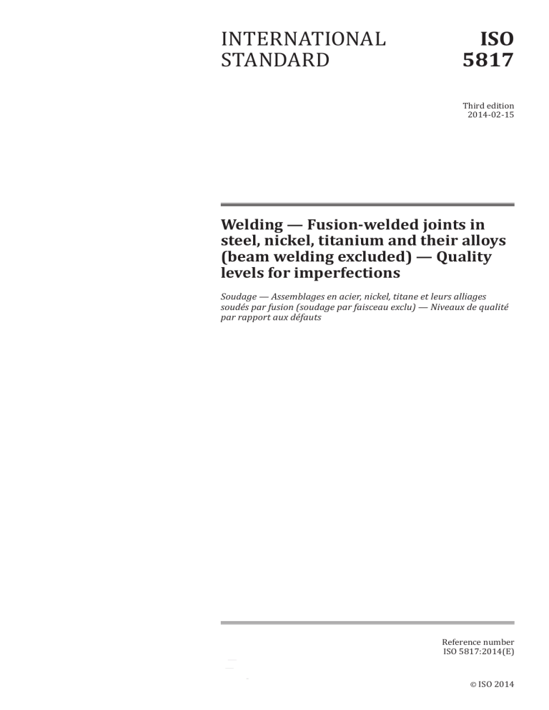 INTERNATIONAL STANDARD ISO 5817 Third edition 2014-02-15 Welding — Fusion-welded joints in steel, nickel, titanium and their alloys (beam welding excluded) — Quality levels for imperfections Soudage — Assemblages en acier, nickel, titane et leurs alliages soudés par fusion (soudage par faisceau exclu) — Niveaux de qualité par rapport aux défauts Reference number ISO 5817:2014(E) © ISO 2014 ISO 5817:2014(E) COPYRIGHT PROTECTED DOCUMENT © ISO 2014 All rights reserved. Unless otherwise specified, no part of this publication may be reproduced or utilized otherwise in any form or by any means, electronic or mechanical, including photocopying, or posting on the internet or an intranet, without prior written permission. Permission can be requested from either ISO at the address below or ISO’s member body in the country of the requester. ISO copyright office Case postale 56 • CH-1211 Geneva 20 Tel. + 41 22 749 01 11 Fax + 41 22 749 09 47 E-mail copyright@iso.org Web www.iso.org Published in Switzerland ii © ISO 2014 – All rights reserved ISO 5817:2014(E) Page Foreword ....................................................................................................................................................................................................................................... iv Introduction .................................................................................................................................................................................................................................v 1 2 3 4 5 Scope ................................................................................................................................................................................................................................ 1 Normative references ..................................................................................................................................................................................... 1 Terms and definitions .................................................................................................................................................................................... 2 Symbols ......................................................................................................................................................................................................................... 3 Assessment of imperfections .................................................................................................................................................................. 4 Annex A (informative) Examples of determination of percentage (%) porosity ................................................21 Annex B (informative) Additional information and guidelines for use of this International Standard ...............................................................................................................................................................................23 Annex C (informative) Additional requirements for welds in steel subject to fatigue .................................24 Bibliography ............................................................................................................................................................................................................................ 27 iii ISO 5817:2014(E) Foreword ISO (the International Organization for Standardization) is a worldwide federation of national standards bodies (ISO member bodies). The work of preparing International Standards is normally carried out through ISO technical committees. Each member body interested in a subject for which a technical committee has been established has the right to be represented on that committee. International organizations, governmental and non-governmental, in liaison with ISO, also take part in the work. ISO collaborates closely with the International Electrotechnical Commission (IEC) on all matters of electrotechnical standardization. The procedures used to develop this document and those intended for its further maintenance are described in the ISO/IEC Directives, Part 1. In particular the different approval criteria needed for the different types of ISO documents should be noted. This document was drafted in accordance with the editorial rules of the ISO/IEC Directives, Part 2. www.iso.org/directives Attention is drawn to the possibility that some of the elements of this document may be the subject of patent rights. ISO shall not be held responsible for identifying any or all such patent rights. Details of any patent rights identified during the development of the document will be in the Introduction and/or on the ISO list of patent declarations received. www.iso.org/patents Any trade name used in this document is information given for the convenience of users and does not constitute an endorsement. For an explanation on the meaning of ISO specific terms and expressions related to conformity assessment, as well as information about ISO’s adherence to the WTO principles in the Technical Barriers to Trade (TBT) see the following URL: Foreword - Supplementary information The committee responsible for this document is ISO/TC 44, Welding and allied processes, Subcommittee SC 10, Unification of requirements in the field of metal welding. This third edition cancels and replaces the second edition (ISO 5817:2003,), which has been technically revised. It also incorporates Technical Corrigendum ISO 5817:2003/Cor 1:2006. Requests for official interpretations of any aspect of this International Standard should be directed to the Secretariat of ISO/TC 44/SC 10 via your national standards body. A complete listing of these bodies can be found at www.iso.org. iv © ISO 2014 – All rights reserved ISO 5817:2014(E) Introduction v ISO 5817:2014(E) Welding — Fusion-welded joints in steel, nickel, titanium and their alloys (beam welding excluded)