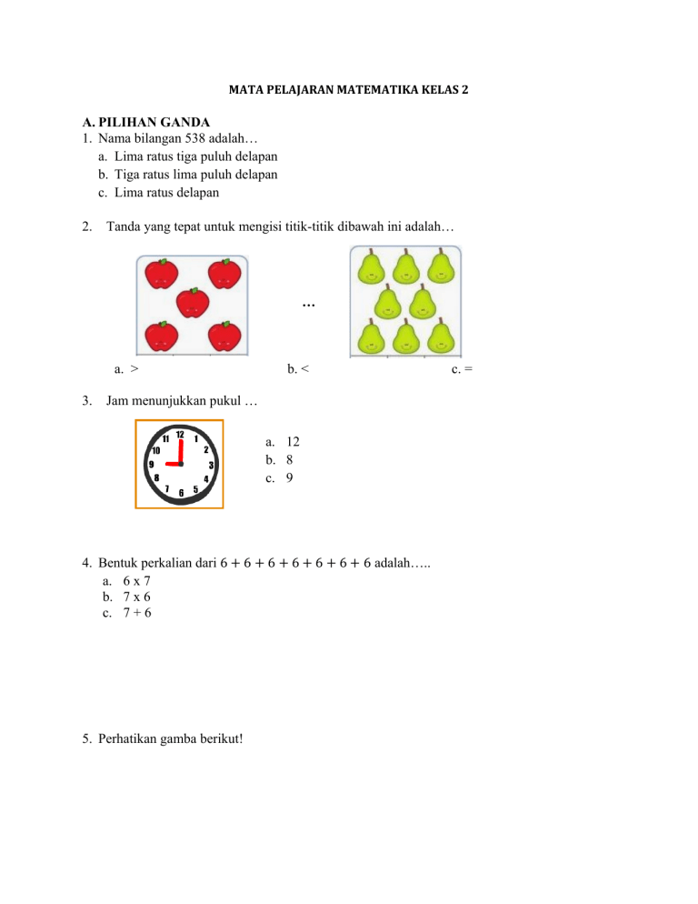 MATA PELAJARAN MATEMATIKA KELAS 2 A. PILIHAN GANDA 1. Nama bilangan 538 adalah… a. Lima ratus tiga puluh delapan b. Tiga ratus lima puluh delapan c. Lima ratus delapan 2. Tanda yang tepat untuk mengisi titik-titik dibawah ini adalah… … a. > 3. b. < Jam menunjukkan pukul … a. 12 b. 8 c. 9 4. Bentuk perkalian dari 6 + 6 + 6 + 6 + 6 + 6 + 6 adalah….. a. 6 x 7 b. 7 x 6 c. 7 + 6 5. Perhatikan gamba berikut! c. = Bentuk perkalian dari gambar di samping adalah … a. 6 x 5 b. 2 x 3 c. 5 x 5 6. Hasil dari 8 x 0 adalah….. a. 8 b. 80 c. 0 7. Bentuk pengurangan berulang dari 10 : 2 = 5 adalah ….. a. 10 – 2 – 2 – 2 – 2 – 2 = 0 b. 10 – 5 – 5 = 0 c. 10 – 2 – 2 – 2 – 2 – 2 = 2 8. 45 : 9 = 5 merupakan kebalikan dari perkalian ….. a. 9 x 5 = 9 b. 9 x 5 = 45 c. 9 x 9 =45 9. Jika hasil dari 40 : 5 = n, makanilai n adalah ….. a. 8 b. 10 c. 4 10. Jumlah pensil di bawah ini dapat dituliskan dengan bentuk … a. 5 x 5 = 15 b. 1 x 15 =15 c. 5 x 3 =15 11. Reza memiliki 42 ekor ikan kecil. Ikan tersebut dibagikan kepada 6 temannya dengan bagian yang sama. Jumlah ikan yang diterima masing-masing temannya adalah….. a. 5 b. 6 c. 7 12. Siswa kelas dua ada 36 orang. Akan dibentuk kelompok dengan anggota setiap kelompok 4 orang. Banyak kelompok yang dapat dibuat adalah….. a. 4 b. 6 c. 9 13. Hasil dari 19 + 5 – 7 adalah….. a. 23 b. 17 c. 7 14. Jika hasil (15 : 5) x 9 = p, maka nilai p adalah ….. a. 27 b. 35 c. 37 15. Ibu membeli 25 buah jeruk, diberikan kepada Hendra sebanyak 9 buah. Ibu membeli lagi 8 buah jeruk. Banyak buah jeruk yang dimiliki Ibu sekarang adalah….. a. 24 b. 28 c. 30 16. Gambar di samping merupakan bangun datar … a. Segi tiga b. Segi empat c. Lingkaran 17. Gambar di samping merupakan contoh bangun datar … a. Persegi panjang b. Segi tiga c. Persegi 18. Gambar di samping merupakan contoh bangun datar … a. Segi tiga sama sisi b. Segi tiga sama kaki c. Lingkaran 19. Pada gambar berikut, yang merupakan bangun datar belah ketupat adalah … a. b. c. 20. Gambar di samping jika diurutkan dari yang terkecil menjadi … a. a, b, c, d b. b, a, c, d c. d, c, a, b B. URAIAN 1. Isilah titik – titik di bawah ini! 2. Tentukan hasil dari: a. 38 – 12 + 7 = … b. (2 x 9 ) : 3 = … 3. Urutkanlah dari yang terbesar! 4. Gambarlah bangun datar berikut: a. Segitiga b. Persegi c. Persegi panjang d. Lingkaran 5. Berbentuk apakah benda di bawah ini?