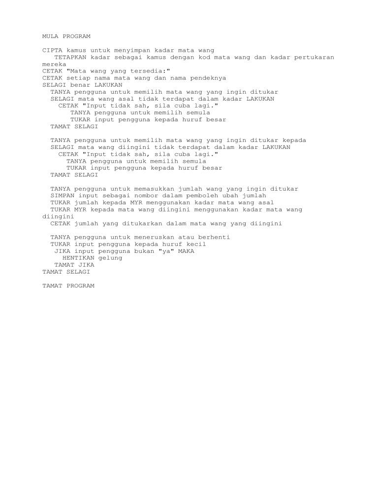 MULA PROGRAM CIPTA kamus untuk menyimpan kadar mata wang TETAPKAN kadar sebagai kamus dengan kod mata wang dan kadar pertukaran mereka CETAK "Mata wang yang tersedia:" CETAK setiap nama mata wang dan nama pendeknya SELAGI benar LAKUKAN TANYA pengguna untuk memilih mata wang yang ingin ditukar SELAGI mata wang asal tidak terdapat dalam kadar LAKUKAN CETAK "Input tidak sah, sila cuba lagi." TANYA pengguna untuk memilih semula TUKAR input pengguna kepada huruf besar TAMAT SELAGI TANYA pengguna untuk memilih mata wang yang ingin ditukar kepada SELAGI mata wang diingini tidak terdapat dalam kadar LAKUKAN CETAK "Input tidak sah, sila cuba lagi." TANYA pengguna untuk memilih semula TUKAR input pengguna kepada huruf besar TAMAT SELAGI TANYA pengguna untuk memasukkan jumlah wang yang ingin ditukar SIMPAN input sebagai nombor dalam pemboleh ubah jumlah TUKAR jumlah kepada MYR menggunakan kadar mata wang asal TUKAR MYR kepada mata wang diingini menggunakan kadar mata wang diingini CETAK jumlah yang ditukarkan dalam mata wang yang diingini TANYA pengguna untuk meneruskan atau berhenti TUKAR input pengguna kepada huruf kecil JIKA input pengguna bukan "ya" MAKA HENTIKAN gelung TAMAT JIKA TAMAT SELAGI TAMAT PROGRAM