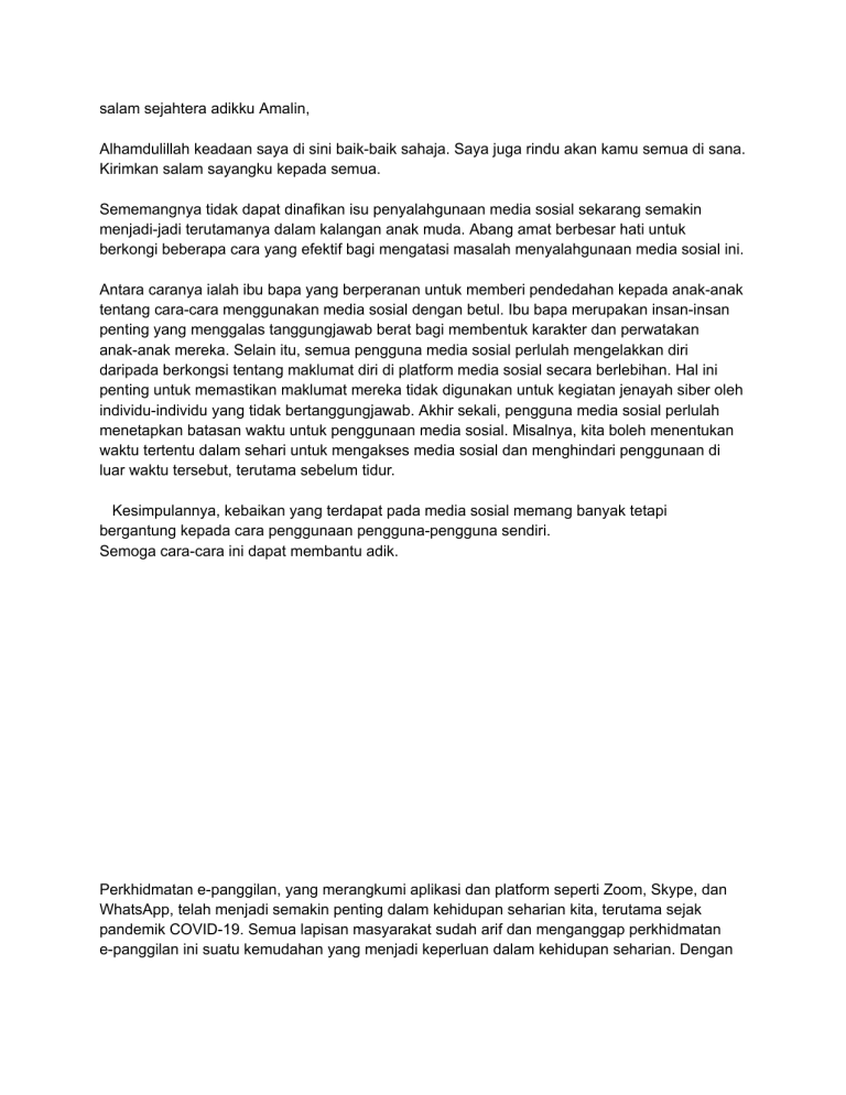 salam sejahtera adikku Amalin, Alhamdulillah keadaan saya di sini baik-baik sahaja. Saya juga rindu akan kamu semua di sana. Kirimkan salam sayangku kepada semua. Sememangnya tidak dapat dinafikan isu penyalahgunaan media sosial sekarang semakin menjadi-jadi terutamanya dalam kalangan anak muda. Abang amat berbesar hati untuk berkongi beberapa cara yang efektif bagi mengatasi masalah menyalahgunaan media sosial ini. Antara caranya ialah ibu bapa yang berperanan untuk memberi pendedahan kepada anak-anak tentang cara-cara menggunakan media sosial dengan betul. Ibu bapa merupakan insan-insan penting yang menggalas tanggungjawab berat bagi membentuk karakter dan perwatakan anak-anak mereka. Selain itu, semua pengguna media sosial perlulah mengelakkan diri daripada berkongsi tentang maklumat diri di platform media sosial secara berlebihan. Hal ini penting untuk memastikan maklumat mereka tidak digunakan untuk kegiatan jenayah siber oleh individu-individu yang tidak bertanggungjawab. Akhir sekali, pengguna media sosial perlulah menetapkan batasan waktu untuk penggunaan media sosial. Misalnya, kita boleh menentukan waktu tertentu dalam sehari untuk mengakses media sosial dan menghindari penggunaan di luar waktu tersebut, terutama sebelum tidur. Kesimpulannya, kebaikan yang terdapat pada media sosial memang banyak tetapi bergantung kepada cara penggunaan pengguna-pengguna sendiri. Semoga cara-cara ini dapat membantu adik. Perkhidmatan e-panggilan, yang merangkumi aplikasi dan platform seperti Zoom, Skype, dan WhatsApp, telah menjadi semakin penting dalam kehidupan seharian kita, terutama sejak pandemik COVID-19. Semua lapisan masyarakat sudah arif dan menganggap perkhidmatan e-panggilan ini suatu kemudahan yang menjadi keperluan dalam kehidupan seharian. Dengan kemajuan teknologi dan keperluan untuk berkomunikasi secara efisien, e-panggilan menawarkan pelbagai kelebihan yang sukar diabaikan. Antara kelebihannya ialah perkhidmatan e-panggilan membolehkan pengguna untuk berhubung dari mana sahaja, asalkan ada sambungan internet. Ini meningkatkan ketersediaan untuk komunikasi, sama ada untuk urusan perniagaan, pendidikan, atau perhubungan peribadi. Pengguna tidak lagi terikat kepada lokasi fizikal, yang membolehkan interaksi global. Pergilah ke ceruk dunia mana sekalipun, komunikasi tidak lagi terbatas. Oleh itu, jelaslah bahawa perkhidmatan e-panggilan memudahkan perhubungan. Selain itu, dalam dunia kerja yang semakin berkembang ke arah model kerja jarak jauh, perkhidmatan e-panggilan membolehkan pekerja dan majikan untuk berinteraksi dengan lebih fleksibel. Mesyuarat boleh diadakan tanpa halangan geografi, membolehkan pasukan untuk berkolaborasi walaupun berada di lokasi yang berbeza. Hal ini sekali gus dapat mengurangkan kos yang perlu ditanggung untuk pengangkutan pekerja. Sudah terang lagi bersuluhlah sekarang bahawa e-panggilan membolehkan interaksi yang fleksibel. Akhir sekali, e-panggilan telah menjadi alat penting dalam pendidikan, membolehkan pengajaran secara dalam talian. Pelajar dapat mengikuti kelas dari rumah, yang sangat berguna bagi mereka yang tinggal jauh dari institusi pendidikan. Ini juga membolehkan akses kepada sumber pendidikan yang lebih luas dan pelbagai. Pelajar, mahasiswa mahupun murid sekolah boleh mengakses informasi atau berhubung dengan guru untuk bertanyakan tentang pembelajaran hanya dengan sebuah alat elektronik dan jaringan Internet. Benarlah e-panggilan memajukan pendidikan. Kepentingan perkhidmatan e-panggilan tidak dapat dinafikan dalam zaman yang serba pantas dan berubah ini. Dengan menyediakan cara yang berkesan untuk berkomunikasi, bekerja, dan belajar, e-panggilan telah menjadi alat penting yang membantu kita menyesuaikan diri dengan cabaran baru. Oleh itu, memahami dan memanfaatkan perkhidmatan ini adalah langkah penting untuk masa depan yang lebih terhubung dan produktif.