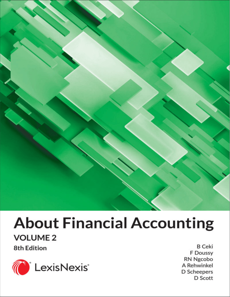 About Financial Accounting Volume 2 Eighth Edition Ab boutt Fin nanc cial A Accoun nting g Volu ume 2 Eightth Edition Contribu C ting auth hors B Ceki RN N Ngcobo A Re ehwinkel D Scheepers (edittor) ent Pass Plus Conte BT Ngiba Volu ume 1 Eightth Edition Contribu C ting auth hors B Ceki F Dousssy (editor) D Scott Members of o the LexisNe exis Group w orldwide worldwide South Afric ca N DURBAN JOHANN NESBURG CAPE TOWN O LexisNexis (Pty L y) Ltd w www.lexisnexis s.co.za 2 Peter Mokaba Road(No 215 orth Ridge Roa ad), Morningside, Durban, 4001 4 B Building 8, Cou untry Club Esttate Office Park, 21 Woodla ands Drive, Wo oodmead, 208 80 F First Floor, Gre eat Westerford d, 240 Main Ro oad, Rondebo osch, 7700 Australia Austria LexisNexis, CHATSWOOD L H , Ne ew South Wale es L LexisNexis Verrlag ARD Orac c, VIENNA Benelux Canada China L LexisNexis Ben nelux, AMSTER RDAM France Germany g Hong Kong L LexisNexis, PARIS A India Italy Japan L LexisNexis, NEW E DELHI Korea Malaysia New Zealand L LexisNexis, SEOUL E Poland Singapore United King gdom L LexisNexis Poland, WARSAW W United Stattes L LexisNexis, DAYTON A , Ohio LexisNexis Canada, MARKHA L AM, Ontario L LexisNexis, BEIJING E LexisNexis Germany, MÜNSTTER L L LexisNexis, HONG O KONG Giuffrè Editore, MILAN G L LexisNexis, TOKYO O LexisNexis, KUALA L U LUMPUR L LexisNexis, WELLINGTON E LexisNexis, SIN L NGAPORE L LexisNexis, LONDON O © 2019 ISBN 978-0 0-6390-0866-0 0 E-Book ISBN 978-0-6390 0-0867-7 First edition n 2005, reprintted 2006 Second edition 2007 Third edition 2008 Fourth editio on 2011 Fifth edition 2014 edition 2016 Sixth e Seven nth edition 2018 wledgement is given to the IFRS Foundation for quotes and definition ns used in thiss publication. Full acknow Copyright subsists s in thiss work. No parrt of this work may be repro oduced in any form or by an ny means without the publisher’s written permission. p An ny unauthorised reproduction of this wo ork will constiitute a copyright nt and render the doer liable e under both c civil and criminal law. infringemen Whilst every effort has been b made to o ensure that the information published in this work is accurate, the nd printers takke no respons sibility for any loss or dama age editors, authors, writers, contributors, publishers an a a result of th he reliance up pon the inform mation containe ed therein. suffered by any person as Editor: Mandy y Jonck Technical Editor: Maggie Tallanda Contents Page 1. Introduction to the preparation and presentation of financial statements .... 1 2. Establishment and financial statements of a partnership ............................. 65 3. Changes in the ownership structure of partnerships.................................... 99 4. The liquidation of a partnership .................................................................... 163 5. Close corporations ........................................................................................ 225 6. Introduction to companies ............................................................................ 269 7. Statement of cash flows ................................................................................ 325 8. Analysis and interpretation of financial statements ...................................... 389 9. Branches ....................................................................................................... 409 10. Manufacturing entities .................................................................................. 447 11. Budgets ........................................................................................................ 471 Index ....................................................................................................................... 497 v CHAPTER 1 Introduction to the preparation and presentation of financial statements Contents Page Overview of the introduction to the preparation and presentation of financial statements ............................................................................................................... 4 1.1 Introduction ................................................................................................... 4 1.2 Financial reporting requirements in South Africa ........................................ 1.2.1 Introduction...................................................................................... 1.2.2 The current regulatory South African financial reporting requirements .................................................................................... 7 7 1.3 The IFRS Conceptual Framework for Financial Reporting ............................ 1.3.1 Introduction...................................................................................... 1.3.2 Purpose and status of the Conceptual Framework ......................... 1.3.3 Chapter 1: The objective of general purpose financial reporting.... 1.3.4 Chapter 2: Qualitative characteristics of useful financial information ....................................................................................... 1.3.4.1 Fundamental qualitative characteristics ......................... 1.3.4.2 Enhancing qualitative characteristics ............................. 1.3.4.3 The cost constraint on useful financial reporting ............ 1.3.5 Chapter 3: Financial statements and the reporting entity ............... 1.3.5.1 Objective and scope of financial statements .................. 1.3.5.2 Reporting period ............................................................. 1.3.5.3 Going concern assumption ............................................. 1.3.5.4 The reporting entity ......................................................... 1.3.6 Chapter 4: The elements of financial statements ............................ 1.3.6.1 Introduction ..................................................................... 1.3.6.2 Definitions of an asset and an economic resource ......... 1.3.6.3 Definitions of a liability and an obligation ........................ 1.3.6.4 Defin