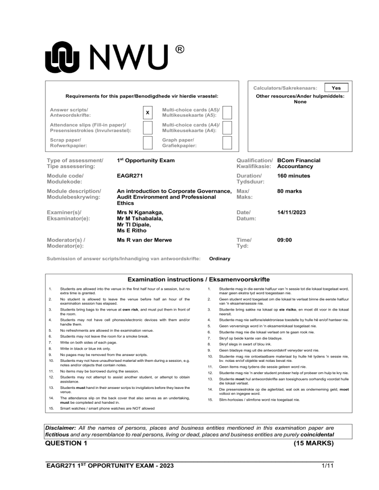 Calculators/Sakrekenaars: Requirements for this paper/Benodigdhede vir hierdie vraestel: Answer scripts/ Antwoordskrifte: X Yes Other resources/Ander hulpmiddels: None Multi-choice cards (A5)/ Multikeusekaarte (A5): Attendance slips (Fill-in paper)/ Presensiestrokies (Invulvraestel): Multi-choice cards (A4)/ Multikeusekaarte (A4): Scrap paper/ Rofwerkpapier: Graph paper/ Grafiekpapier: Type of assessment/ Tipe assessering: 1st Opportunity Exam Qualification/ BCom Financial Kwalifikasie: Accountancy Module code/ Modulekode: EAGR271 Duration/ Tydsduur: Module description/ Modulebeskrywing: An introduction to Corporate Governance, Max/ Audit Environment and Professional Maks: Ethics 80 marks Examiner(s)/ Eksaminator(e): Mrs N Kganakga, Mr M Tshabalala, Mr TI Dipale, Ms E Ritho Date/ Datum: 14/11/2023 Moderator(s) / Moderator(e): Ms R van der Merwe Time/ Tyd: 09:00 Submission of answer scripts/Inhandiging van antwoordskrifte: 160 minutes Ordinary Examination instructions / Eksamenvoorskrifte 1. Students are allowed into the venue in the first half hour of a session, but no extra time is granted. 1. Studente mag in die eerste halfuur van 'n sessie tot die lokaal toegelaat word, maar geen ekstra tyd word toegestaan nie. 2. No student is allowed to leave the venue before half an hour of the examination session has elapsed. 2. Geen student word toegelaat om die lokaal te verlaat binne die eerste halfuur van 'n eksamensessie nie. 3. Students bring bags to the venue at own risk, and must put them in front of the room. 3. Studente bring sakke na lokaal op eie risiko, en moet dit voor in die lokaal neersit. 4. Students may not have cell phones/electronic devices with them and/or handle them. 4. Studente mag nie selfone/elektroniese toestelle by hulle hê en/of hanteer nie. 5. Geen verversings word in 'n eksamenlokaal toegelaat nie. 5. No refreshments are allowed in the examination venue. 6. Studente mag nie die lokaal verlaat om te gaan rook nie. 6. Students may not leave the room for a smoke break. 7. Skryf op beide kante van die bladsye. 7. Write on both sides of each page. 8. Skryf slegs in swart of blou ink. 8. Write in black or blue ink only. 9. Geen bladsye mag uit die antwoordskrif verwyder word nie. 9. No pages may be removed from the answer scripts. 10. 10. Students may not have unauthorised material with them during a session, e.g. notes and/or objects that contain notes. Studente mag nie ontoelaatbare materiaal by hulle hê tydens 'n sessie nie, bv. notas en/of objekte wat notas bevat nie. 11. Geen items mag tydens die sessie geleen word nie. 11. No items may be borrowed during the session. 12. Studente mag nie 'n ander student probeer help of probeer om hulp te kry nie. 12. Students may not attempt to assist another student, or attempt to obtain assistance. 13. Studente moet hul antwoordskrifte aan toesighouers oorhandig voordat hulle die lokaal verlaat. 13. Students must hand in their answer scrips to invigilators before they leave the venue. 14. Die presensiestrokie op die agterblad, wat ook as onderneming geld, moet voltooi en ingegee word. 14. The attendance slip on the back cover that also serves as an undertaking, must be completed and handed in. 15. Slim-horlosies / slimfone word nie toegelaat nie. 15. Smart watches / smart phone watches are NOT allowed Disclaimer: All the names of persons, places and business entities mentioned in this examination paper are fictitious and any resemblance to real persons, living or dead, places and business entities are purely coincidental QUESTION 1 (15 MARKS) __________________________________________________________________________ EAGR271 1ST OPPORTUNITY EXAM - 2023 1/11 You are a first-year audit clerk at Vaal and Partners Inc. (hereafter VP), an auditing firm based in Mahikeng. VP was recently appointed to assist the North West Department of Human Settlements (hereafter the Department) for the next three (3) years with improving their control environment in order to manage the risks associate with their operations. Ms Betty Thomas, the Department’s financial manager has requested your firm to assist her with a presentation that she will be making at a seminar for provincial legislation on internal controls and corporate governance. Your audit partner has asked you to assist Ms Betty Thomas. The question consists of two (2) unrelated parts: PART A Ms Betty Thomas’s first inquiry is on key concepts and their relevant descriptions / statements, and she has provided you with these descriptions as well as a word bank of the different key concepts: DESCRIPTION/STATEMENT WORD BANK A. This consists of activities and policies, accounting and • Internal control supporting records, all designed and established to • Business risk initiate, record, process and report transactions. • Risk assessment process B. This involves assessing risks facing the entity and how • Information system they should be addressed. • Control activities C. The exercise of ethical and effective leadership by the • Control environment governing body towards the achievement of certain • Integrity outcomes like good performance. • Corporate governance D. The system designed, implemented and maintained by those charged with governance, management and other personnel to provide reasonable assurance about the achievement of an entity’s objectives. E. Actions, supported by policies and procedures, that are carried out to manage or reduce the risks that the organisation’s objectives will not be met. REQUIRED: 1.1 Select ONE word from the word bank provided above that best fits each description/statement listed from A to E. A word can only be used ONCE. Only write the letter and the relevant word, e.g. Z. System. YOU MUST USE CAPITAL LETTERS. TOTAL MARKS FOR QUESTION 1.1 SUBTOTAL 5x1 TOTAL 5 5 5 PART B Ms Betty Thomas’s second inquiry is on internal controls over the information technology (IT) environment and consist of a few statements or questions: 1.2.1 Con