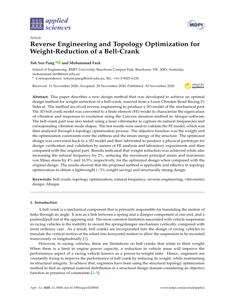 Keywords: bell crank; topology optimization; natural frequency; reverse engineering; vibrometer;