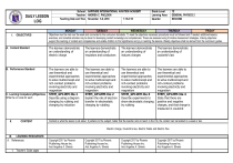 DAILY LESSON LOG I. OBJECTIVES School SAPPHIRE INTERNATIONAL AVIATION ACADEMY Teacher ANDREA C. PAELDON Teaching Date and Time November 5-8, 2018 1:15-2:15 Grade Level Learning Area Quarter 12 GENERAL PHYSICS 2 SECOND MONDAY TUESDAY WEDNESDAY THURDAY FRIDAY Objectives must be met over the week and connected to the curriculum standards. To meet the objectives necessary procedures must be followed and if needed, additional lessons, exercises, and remedial activities may be done for developing content knowledge and competencies. These are assessed using Formative Assessment strategies. Valuing objectives support the learning of content and competencies and enable children to find significance and joy in learning the lessons. Weekly objectives shall be derived from the curriculum guides. A. Content Standard The learners demonstrate an understanding of electric charge The learners demonstrate an understanding of insulators and conductors The learners demonstrate an understanding of induces charges The learners demonstrate an understanding of coulomb’s law B. Performance Standard The learners are able to use theoretical and experimental approaches to solve multiconcept and rich-context problems involving electricity and magnetism STEM_GP12EM-IIa-1 Describe using a diagram charging by rubbing and charging by induction The learners are able to use theoretical and experimental approaches to solve multiconcept and rich-context problems involving electricity and magnetism STEM_GP12EM-IIa-2 Explain the role of electron transfer in electrostatic charging by rubbing The learners are able to use theoretical and experimental approaches to solve multiconcept and rich-context problems involving electricity and magnetism STEM_GP12EM-IIa-3 Describe experiments to show electrostatic charging by rubbing The learners are able to use theoretical and experimental approaches to solve multiconcept and rich-context problems involving electricity and magnetism STEM_GP12EM-IIa-4 State that there are positive and negative charges, and that charge is measured in coulomb C. Learning Competency/Objectives Write the LC code for each. II. CONTENT Content is what the lesson is all about. It pertains to the subject matter that the teacher aims to teach in the CG, the content can be tackled in a week or two. Electric charge, Coulomb’s law, Electric Fields and Electric Flux III. LEARNING RESOURCES A. References 1. Teacher’s Guide pages Copyright 2017 by Phoenix Publishing House Inc. And Angelina A. Silverio Copyright 2017 by Phoenix Publishing House Inc. And Angelina A. Silverio Copyright 2017 by Phoenix Publishing House Inc. And Angelina A. Silverio Copyright 2017 by Phoenix Publishing House Inc. And Angelina A. Silverio 2. Learner’s Materials pages 3. Textbook pages 4. Additional Materials from Learning Resource (LR)portal B. Other Learning Resource IV. PROCEDURES A. Reviewing previous lesson or presenting the new lesson These steps should be done across the week. Spread out the activities appropriately so that students will learn well. Always be guided by demonstration of learning by the students which you can infer from formative assessment activities. Sustain learning systematically by providing students with multiple ways to learn new things, practice their learning, question their learning processes, and draw conclusions about what they learned in relation to their life experiences and previous knowledge. Indicate the time allotment for each step. Electrons transferred in any The object attracted is said The number of protons and Like charges repel and charging process. In the to have acquired charge or electrons in an atom is unlike charges attract. case charging by friction, electrified. Because the equal: hence, an atom is they are transferred charge is at rest, it is often neutral. between the two objects referred to as static being rubbed together. electricity. B. Establishing a purpose for the lesson Electrons transferred in any charging process. In the case charging by friction, they are transferred between the two objects being rubbed together. Electrons transferred in any charging process. In the case charging by friction, they are transferred between the two objects being rubbed together. Why do people experience electric shock? How great is this force of attraction or repulsion between charges? C. Presenting examples/Instances of the new lesson A grounding wire is simply a conductor that connects the object to the ground. Electrostatic is the study of all phenomena associated with electric charges at rest. Electrostatic charge by rubbing is responsible for the checking of these requirements. D. Discussing new concepts and Rub a piece of ebonite( Paper strips attracted by a The human air is combed Through experimentation, coulomb discovered that the magnitude of electrical force between two charged particles is directly proportional to the product of the magnitudes of the charges and inversely proportional the square of the distance between them. E. Discussing new concepts and practicing new skills # 2 very hard, black rubber) across a piece of animal fur. Rub a glass rod with a piece of silk. F. Developing mastery (leads to Formative Assessment 3) Determine charge on a piece of copper if you rub it with a piece of silk. practicing new skills # 1 G. Finding practical application of concepts and skills in daily living H. Making generalizations and abstractions about the lesson I. Evaluating learning Induction is the process in which, when we bring two substances near to each other due to the property of induction there is movement of charge carriers from one substance to another substance but the objects are not physically touch each other. 1. What does it mean to induce a charge? 2. What is the basic different between charging by induction and charged CD using rubber comb. Styrofoam peanuts clinging to a cat’s fur due to static electricity. From those as simple as the attraction of the plastic wrap t