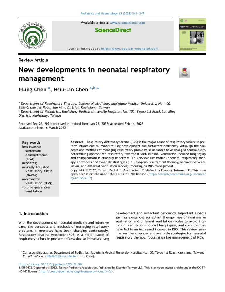 Pediatrics and Neonatology 63 (2022) 341e347 Available online at www.sciencedirect.com ScienceDirect journal homepage: http://www.pediatr-neonatol.com Review Article New developments in neonatal respiratory management I-Ling Chen a, Hsiu-Lin Chen a,b,* a Department of Respiratory Therapy, College of Medicine, Kaohsiung Medical University, No. 100, Shih-Chuan 1st Road, San Ming District, Kaohsiung, Taiwan b Department of Pediatrics, Kaohsiung Medical University Hospital, No. 100, Tzyou 1st Road, San Ming District, Kaohsiung, Taiwan Received Sep 26, 2021; received in revised form Jan 28, 2022; accepted Feb 14, 2022 Available online 16 March 2022 Key words less invasive surfactant administration (LISA); neonates; neurally Adjusted Ventilatory Assist (NAVA); noninvasive Ventilation (NIV); volume guarantee ventilation Abstract Respiratory distress syndrome (RDS) is the major cause of respiratory failure in preterm infants due to immature lung development and surfactant deficiency. Although the concepts and methods of managing respiratory problems in neonates have changed continuously, determining appropriate respiratory treatment with minimal ventilation-induced lung injury and complications is crucially important. This review summarizes neonatal respiratory therapy’s advances and available strategies (i.e., exogenous surfactant therapy, noninvasive ventilation, and different ventilation modes), focusing on RDS management. Copyright ª 2022, Taiwan Pediatric Association. Published by Elsevier Taiwan LLC. This is an open access article under the CC BY-NC-ND license (http://creativecommons.org/licenses/ by-nc-nd/4.0/). 1. Introduction With the development of neonatal medicine and intensive care, the concepts and methods of managing respiratory problems in neonates have been changing continuously. Respiratory distress syndrome (RDS) is a major cause of respiratory failure in preterm infants due to immature lung development and surfactant deficiency. Important aspects such as exogenous surfactant therapy, use of noninvasive ventilation and different ventilation modes to avoid intubation, ventilation-induced lung injury, and comorbidities have led to an increased interest in RDS. This review summarizes the advances and available strategies for neonatal respiratory therapy, focusing on the management of RDS. * Corresponding author. Department of Pediatrics, Kaohsiung Medical University Hospital No. 100, Tzyou 1st Road, Kaohsiung, Taiwan. E-mail address: ch840062@kmu.edu.tw (H.-L. Chen). https://doi.org/10.1016/j.pedneo.2022.02.002 1875-9572/Copyright ª 2022, Taiwan Pediatric Association. Published by Elsevier Taiwan LLC. This is an open access article under the CC BYNC-ND license (http://creativecommons.org/licenses/by-nc-nd/4.0/). I.-L. Chen and H.-L. Chen 2. Administration of exogenous surfactants major morbidities among infants who survive extremely preterm birth. Noninvasive ventilation (NIV) is a common treatment for preterm infants with RDS. NIV helps avoid intubation or provides post-extubation respiratory support, thereby minimizing ventilator-induced lung injury and improving the outcomes. Nasal CPAP (NCPAP), nasal intermittent positive pressure ventilation (NIPPV), bi-level positive airway pressure (BiPAP), and high-flow nasal cannula (HFNC) are common types of NIV. NCPAP delivers a constant positive pressure throughout the respiratory cycle to recruit the collapsed alveoli and reduce the airway resistance, thereby attaining functional residual capacity (FRC) and preventing airway collapse. NIPPV delivers intermittent positive pressure driven by flow at set intervals based on NCPAP. BiPAP provides cycles with high and low positive pressures at set intervals. HFNC delivers heated and humidified oxygen at a flow rate of 2e8 L/min through a nasal prong and generates a positive end-expiratory pressure. HFNC can reduce the physiological dead space, decrease nasopharyngeal airway resistance, and prevent airway mucosa dryness and injury. There is no standardized protocol for determining the optimal NIV treatment in terms of effectiveness and timeliness. Here, we discuss some current comparisons of NIV use. In very low birth weight preterm infants with RDS, NIPPV and NCPAP showed comparable results in terms of extubation failure, death or BPD, intraventricular hemorrhage, air leaks, necrotizing enterocolitis, and duration of respiratory support.10 However, synchronized NIPPV (SNIPPV) and SNIPPV þ NCPAP exhibited a higher rate of successful extubation and removal of NIV within 1 week when compared with NCPAP.11 Moreover, SNIPPV significantly reduced the incidences of desaturation, bradycardia, and apnea in preterm infants.12 These findings suggest that synchronization plays a crucial role in providing efficient respiratory support. Asynchronies may alter spontaneous breathing rhythm, elevate the work of breathing (WOB), and lead to abdominal distension. Indeed, some studies have demonstrated the efficiency of SNIPPV in reducing the WOB,13 improving gas exchange,14 and improving chest wall stability by increasing the flow delivery in the upper airway15 of preterm infants. Failure of SNIPPV was associated with the grade of RDS, antenatal steroid use, and mean airway pressure.15 The incidence of NCPAP failure was higher than that of BiPAP or NIPPV failure within the first 72 h of life in preterm infants with RDS.16,17 Failure of NCPAP was associated with lower antenatal steroid administration and smaller gestational age.17 Additionally, use of BiPAP shortened the duration of respiratory support without interfering with the incidence of BPD, incidence of retinopathy of prematurity, and lung function at 1 year of age.18 Use of high pressures during CPAP (9 cmH2O) has been recently suggested in preterm infants who are likely to require an alternative mode of noninvasive support. Use of high CPAP pressures did not have a negative impact on the cardiac output or WOB when compared with NIPPV in preterm