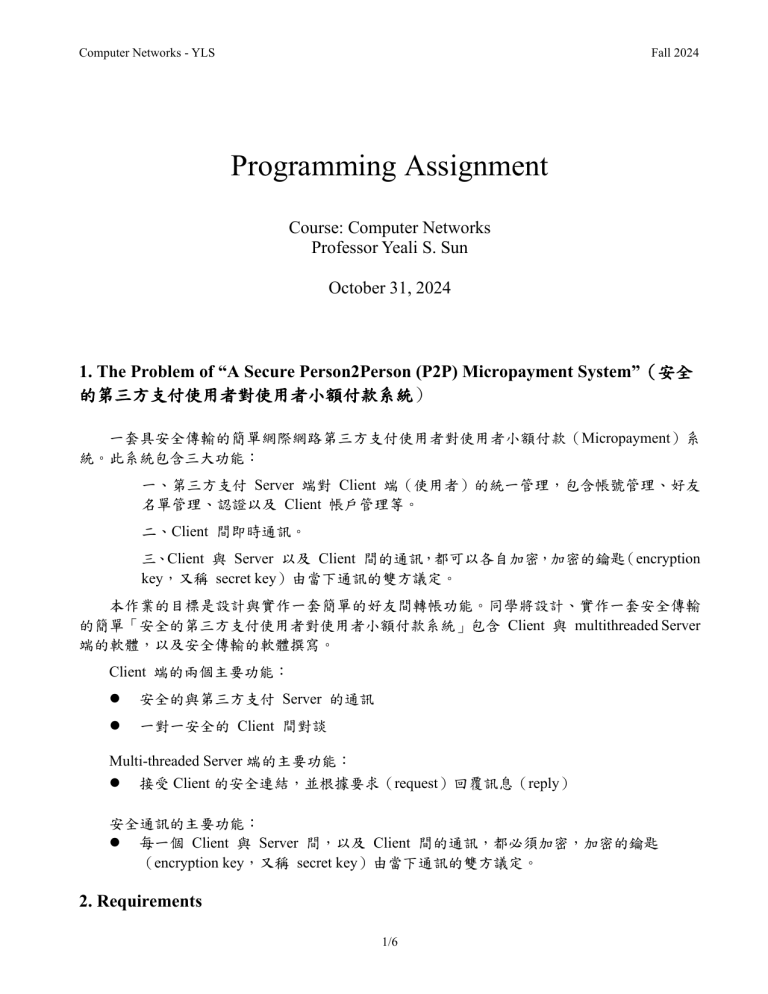 Computer Networks - YLS Fall 2024 Programming Assignment Course: Computer Networks Professor Yeali S. Sun October 31, 2024 1. The Problem of “A Secure Person2Person (P2P) Micropayment System”(安全 的第三方支付使用者對使用者小額付款系統) 一套具安全傳輸的簡單網際網路第三方支付使用者對使用者小額付款(Micropayment)系 統。此系統包含三大功能: 一、第三方支付 Server 端對 Client 端(使用者)的統一管理,包含帳號管理、好友 名單管理、認證以及 Client 帳戶管理等。 二、Client 間即時通訊。 三、Client 與 Server 以及 Client 間的通訊,都可以各自加密,加密的鑰匙(encryption key,又稱 secret key)由當下通訊的雙方議定。 本作業的目標是設計與實作一套簡單的好友間轉帳功能。同學將設計、實作一套安全傳輸 的簡單「安全的第三方支付使用者對使用者小額付款系統」包含 Client 與 multithreaded Server 端的軟體,以及安全傳輸的軟體撰寫。 Client 端的兩個主要功能: ⚫ 安全的與第三方支付 Server 的通訊 ⚫ 一對一安全的 Client 間對談 Multi-threaded Server 端的主要功能: ⚫ 接受 Client 的安全連結,並根據要求(request)回覆訊息(reply) 安全通訊的主要功能: ⚫ 每一個 Client 與 Server 間,以及 Client 間的通訊,都必須加密,加密的鑰匙 (encryption key,又稱 secret key)由當下通訊的雙方議定。 2. Requirements 1/6 Computer Networks - YLS Fall 2024 本作業所有的通訊皆須採用 TCP protocol 以達到可靠傳輸,分三階段繳交及驗收: ◼ 第一階段,同學要先完成 Client 端的程式; ◼ 第二階段完成 Multi-threaded Server 端程式; ◼ 第三階段完成安全通訊的功能。 可使用的語言及 Library:Unix/Linux Socket Programming(in C/C++)、Win Socket;不可 使用Java、C#、Python、……等高階語言。 A. Client Client 端程式必須能夠: a. 向 Server 註冊(註冊時輸入使用者名稱,每人預設帳戶餘額一萬)。 b. 登入助教所提供 Server 端程式(填入使用者名稱、Port Number)。 c. 向 Server 要最新的帳戶餘額、上線清單、Public key 並接收 Server 端的回覆。 d. 和其它 Client 執行轉帳功能(不可透過 Server 端轉送)。 e. 進行離線動作前需主動告知 Server 端程式。 上線清單包含的訊息為: ⚫ 上線的總人數 ⚫ 線上的使用者名稱、其 IP address 以及可用來通訊的 port number。 B. Multi-Threaded Server A multithreaded Server is capable of serving multiple requests in parallel. The Server will create a separate thread to handle each of the connections for accepted requests. There will also be a main thread, in which the Server listens for Clients that want to establish connections. 第二階段 Server 端程式的開發要能提供 Client 端的註冊與登入,發送 Client 目前的 帳戶餘額與上線清單的回覆訊息給 Client,以及接收處理 Client 端離線前的通知,Server 提供的功能請使用 thread 及 worker pool 的方式進行程式的開發,不要使用 fork。 C. Client 與 Server 溝通 Client 與 Server 間的溝通訊息主要有四種: (1) Client 端向 Server 註冊: Client 端傳給 Server 端的訊息為: REGISTER#<UserAccountName> Server 端會回給 Client 端註冊成功或不成功的訊息分別為: 100<space>OK<CRLF> 210<space>FAIL<CRLF> (2) Client 端登入 Server: Client 端傳給 Server 端的訊息為: <UserAccountName>#<portNum> 若使用者有註冊過,Server 端會回給 Client 端上線清單,清單格式為: 2/6 Computer Networks - YLS Fall 2024 <accountBalance><CRLF> <serverPublicKey><CRLF> <number of accounts online><CRLF> <userAccount1>#<userAccount1_IPaddr>#<userAccount1_portNum><CRLF> <userAccount2>#<userAccount2_ IPaddr>#<userAccount2_portNum><CRLF> … 若使用者尚未註冊過,Server 會回傳給 Client 端驗證失敗的訊息: 220<space>AUTH_FAIL<CRLF> (3) Client 端向 Server 要最新的帳戶餘額與上線清單: Client 端傳給 Server 端的訊息為: List Server 端會回給 Client 端上線清單,清單格式為: <accountBalance><CRLF> <serverPublicKey><CRLF> <number of accounts online><CRLF> <userAccount1>#<userAccount1_IPaddr>#<userAccount1_portNum><CRLF> <userAccount2>#<userAccount2_ IPaddr>#<userAccount2_portNum><CRLF> … (4) Client 端結束程式: Client 端傳給 Server 端的訊息為: Exit Server 端會回給 Client 端上線清單,清單格式為: Bye<CRLF> (5) Client 端送 micropayment transaction 訊息給 Server: Client 端之間的訊息傳送格式為: <MyUserAccountName>#<payAmount>#<PayeeUserAccountName> 本訊息 Client A 要用好友 B 的 public key 加密。好友 B 收到後用自己的 private key 解密取得轉帳額度。確認金額後再用 Server 的 public key 將訊息加密,送給 Server(此處假設 B 不會竄改金額)。Server 拿到後用自己的 private key 解密並 更新雙方帳戶餘額。訊息內容假設都是 ASCII 字元文字(text)內容。 注意事項:Server 端不替 Client 端做任何訊息的 relay。 D. 安全傳輸 Socket 安全傳輸部分,請使用 openssl 這個 open source toolkits https://www.openssl.org/, 並且你的 source code 中使用 openssl toolkits 進行加密的安全傳輸。 3/6 Computer Networks - YLS Fall 2024 【套件安裝】 - 在 Unix/Linux 上(ex. Ubuntu)可直接用下列指令進行安裝。 $ apt-get install openssl - 在 Windows 上請自行上網下載 Openssl for winsocket 版本。 3. 作業繳交 本次作業分三階段繳交: A. 第一階段:Client 端程式 助教將在本階段提供 Server 端程式執行檔。該 Server 端程式需在 Linux kernel 2.6.x 環境上執行。同學可以利用該程式來測試自己的 Client 端程式功能是否正常。執行 Server 端程式 command 的格式為: $ ./<Server_name><space><portNum><space><Option> Option 的選項有 -d, -s, -a,說明如下: (每次執行只能輸入一個 Option 參數) 