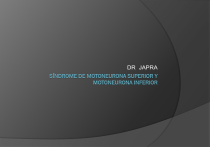 DR JAPRA FUNCION MOTORA Requiere; Movimiento 2. Postura 1. Postura; posición relativa de las diversas partes del cuerpo entre ellas(extensión y flexión de los miembros),o en relación con el medio (posición erecta, decúbito dorsal) MOTILIDAD NIVELES DE INTEGRACION 1. 2. 3. 4. Nivel medular; que actúa en la motilidad refleja Nivel del tronco cerebral; actúa principalmente en la motilidad estática, participando en el mantenimiento de la posición erecta y en las adaptaciones automáticas del tono muscular y el objeto de mantener el equilibrio Nivel cerebral; representado por la corteza cerebral que rige los movimientos voluntarios El nivel cerebeloso; que asegura la armoniosa coordinación de los movimientos MOTILIDAD NEURONA MOTRIZ CENTRAL;CONSTITUTIVA DE LA VIA MOTRIZ DIRECTA VOLUNTARIA O PIRAMIDAL NEURONAS MOTORAS PERIFERICAS;MUSCULO O MUSCULOS QUE INTERVIENEN EN ELMOVIMIENTO DADO, LAS FIBRAS NERVIOSAS QUE LO INERVAN ,LOS CILINDROEJES DE LAS CELULAS MOTORAS DE LAS ASTAS ANTERIORES O DELOS NUCLEOS GRISES TRONCALES DE LOS PARES CRANEANOS VIA MOTRIZ INDIRECTA O EXTRAPIRAMIDAL;NUCLEOSMESTRIADOS,NUCLEO ROJO,LOCUS NIGER YOTROS APARATO COORDINADOR; SISTEMA PROPIOCETIVO Y CENTROSCEREBELOSOS FUNCIONES MOTORAS DE CORTEZA CEREBRAL En los lóbulos frontales se encuentra la corteza motora, anterior al surco central del lóbulo frontal. La corteza motora está dividida en tres áreas: Corteza motora primaria 2. Área premotora 3. Área motora suplementaria 1. CORTEZA MOTORA PRIMARIA FRANJA MOTORA Los movimientos intencionales finos y precisos de los músculos distales y sobre todo los músculos flexores de las extremidades y el movimiento de los músculos de la fonación Controla secuencia de movimientos musculares independientes y representa el primer nivel de control descendente de los movimientos precisos AREAS FUNCIONALES MOTORAS Y SOMATOSENSITIVAS DE LA CORTEZA CEREBRFAL HUMUNCULO MOTOR La producción de lesiones aisladas de la parte mas posterior de la corteza motora primaria puede provocar una marcada debilidad de los grupos de los músculos flexores distales y una incapacidad permanente de llevar a cabo Tareas de manipulación delicadas con el lado opuesto del cuerpo o de la cara Las lesiones que se limitan a la parte mas anterior de la franja motora conducen a la debilidad de los músculos de mayor tamaño; las extremidades, la cintura pélvica o la columna vertebral REPRESENTACION DE LOS DIVERSOS MUSCULOS EN LACORTEZA CEREBRAL ÁREA PREMOTORA Las señales nerviosas motoras generadas en esta área, producen patrones de movimientos complejos en la coordinación motora. Ejemplo: colocar hombros y brazos de forma que las manos se orienten a realizar una actividad determinada. AREA PREMOTORA Los movimientos destinados a cumplir un objetivo dado, antes de levantar una pelota o levantar un tenedor, son programados por la corteza de asociación pre frontal y los núcleos talamicos asociados La programación para este patrón de movimiento incluye secuencias de contracción muscular para la manipulación distal compleja y para las acciones de preparación y sostén de los músculos de las extremidades y las cinturas escapular y pélvica ÁREA MOTORA SUPLEMENTARIA La información que sale de esta área es bilateral. Relacionada con la realización de movimientos complejos y precisos de ambos lados del cuerpo Por ejemplo: induce movimientos de presión simultánea de ambas manos. Las lesiones bilaterales conducen a la abolición prolongada de los movimientos de ambas manos o ambos pies LOCALIZACION DE LAS DEMAS AREAS CORTICALES RESPONSABLES DECADA TIPO ESPEPECIFICO DE ACTIVIDAD MOTORA FUNCIONES ESPECIALIZADAS MOTORAS EN LA CORTEZA Área de broca y habla: su lesión impide la vocalización Movimiento ocular voluntario. Su lesión impide que la persona mueva los ojos voluntariamente hacia objetos diferentes Área de rotación de la cabeza Área de destreza manual: si hay lesión los movimientos de las manos son incoordinados , apraxia motora FASCICULO CORTICOESPINAL VIA PIRAMIDAL 30% nace en la corteza motora primaria 30% nace en área motora premotora y motora suplementaria 40% nace en el área somatosensitiva por detrás del surco central FASCICULO CORTICOESPINAL Población de grandes fibras mielinicas con un diámetro medio de 16 micrómetros Nacen en células piramidales gigantes de Betz, que solo están presentes en la corteza motora primaria Las células miden 60 micrómetros de diámetro y los impulsos que envían hacia la medula espinal a una velocidad de 70 m/s FASCICULO CORTICOESPINAL 1. Has Geniculado 2. Fascículo piramidal directo ( Turk)(fascículo corticoespinal ventral) 3. Fascículo piramidal cruzado ( fascículo corticoespinal lateral) FASCICULO CORTICOESPINAL 1. Haz Geniculado; a medida que desciende por el tronco cerebral va enviando fibras a los núcleos motores de los nervios craneanos del otro lado, que se entrecruzan con las que vienen del lado opuesto, no todas las fibras se entre cruzan por lo que la inervación de las mismas es doble ipsi y contralateral con la excepción de las neuronas del núcleo del VII par destinadas al facial inferior, de los núcleos del XII y motor del V que reciben información predominante cruzada FASCICULO CORTICOESPINAL 2.-Fascículo corticoespinal ventral; algunas fibras no cruzan hacia el lado opuesto en el bulbo raquídeo , sino que descienden por el mismo lado de la medula , muchas de esta fibras , acaban cruzando al lado contrario de la medula a la altura del cuello o de la región torácica superior , estas fibras pueden estar dedicadas al control de los movimientos posturales bilaterales por parte de la corteza motora suplementaria VIA PIRAMIDAL FASCICULO CORTICOESPINAL 3.-Fasciculo corticoespinal lateral; cruzan en la parte inferior del bulbo y finalizan en; • Interneuronas de las regiones intermedias de la sustancia gris medular • Neuronas sensitivas de relevo situadas en las astas posteriores • Motoneuronas anteriores HAZ CO