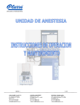 NOV´05mtx CASA PLARRE, S.A. DE C.V. Av. Cuauhtémoc 220-201 Col. Doctores, C.P. 06720 México, D.F. Tel. 01 55 55134 0270 Fax. 01 55 5134 0282 ventas@casaplarre.com.mx V 2.15 SUCURSAL MONTERREY Matehuala No. 106-A Col. Mitras Centro C.P. 64460 Monterrey N.L. Tel. 01 81 8346-1473 Fax. 01 81 8346-0278 ventas_mty@casaplarre.com.mx SUCURSAL GUADALAJARA Gral. Antonio León No. 434 Int. 13 Col. Ladrón de Guevara C.P. 44650 Guadalajara, Jal. Tel. 01 33 3630 9781 Fax. 01 33 3630 9741 ventas_gdl@casaplarre.com INFORMACION IMPORTANTE. Este manual lo proporciona CASA PLARRE S.A. de C.V. a los usuarios de la unidad de anestesia PLARRE como un servicio para los mismos. CASA PLARRE S.A. de C.V. no se hace responsable del mal uso que pudiera hacerse de la información aquí contenida. CASA PLARRE S.A. de C.V. es únicamente responsable por las reparaciones realizadas por personal de sus centros de servicio, los cuales se encuentran listados en la portada de este manual. Este manual únicamente describe la localización y funcionamiento de las diferentes partes que conforman la unidad de anestesia. La Unidad de anestesia modelo 8095 aquí descrita deberá ser únicamente usada por médicos especialistas en anestesiología o bajo su supervisión directa. ADVERTENCIA En la Unidad de anestesia modelo 8095el Monitoreo de la FiO2 se realiza en la pantalla del Ventilador 6500 por lo que el ventilador deberá estar encendido durante cualquier procedimiento en el suministro de gases anestésicos (Vent, Manual). El Monitoreo de la FiO2 es un requisito indispensable como medida de seguridad, durante el suministro de O2 + N2O según la NOM-170-SSA1-1998 El fabricante se reserva el derecho de efectuar mejoras posteriores al instructivo y/o diseño del modelo da sin compromiso alguno. La información contenida en este instructivo es aplicable para la Unidad de anestesia modelo 8095 con el que fue suministrado. Antes de utilizar esta Unidad de Anestesia lea cuidadosamente todas la secciones de este manual. Instrucciones de Operación y Mantenimiento Unidad de Anestesia 8095 i CONTENIDO I II III IV V DESCRIPCIÓN ............................................................................................................... I.1 Vista frontal de la unidad ................................................................................................ I.2 Vista de la unidad con accesorios opcionales ................................................................. I.3 ESPECIFICACIONES...............................................................................................II.1-II.2 INSTALACION Suministro de gases medicinales .................................................................................III.1 Suministro eléctrico .......................................................................................................III.2 Reserva de gases medicinales .....................................................................................III.3 Circuito absorbedor de CO2 .................................................................................. III.4-III.5 Vaporizadores modelo 19.1 y 2000 ..............................................................................III.6 Sistema para evacuación de gases ..............................................................................III.7 Ventilador de anestesia 6500............................................... ............................... III.8-III.10 Equipo de succión ...................................................................................................... III.11 CIRCUITO ABSORBEDOR MODELO 8900 Descripción .......................................................................................................... IV.1-IV.2 Conexión de accesorios ............................................................................................... IV.3 OPERACIÓN Interruptor principal .......................................................................................................V.1 Banco de flujómetros ....................................................................................................V.2 ® Flowlock .......................................................................................................................V.3 Válvula de oxígeno directo (bypass) .............................................................................V.4 Vaporizadores modelo 19.1 y 2000 ..............................................................................V.5 ® VI VII VIII IX X Sistema de exclusión Interlock .....................................................................................V.6 Sistema para evacuación de gases ..............................................................................V.7 PROCEDIMIENTO DE VERIFICACIÓN OPERACIONAL ..................................VI.1-VI.3 LIMPIEZA Y DESINFECCIÓN................................................................................... VII.1 MANTENIMIENTO Y LISTA DE PARTES ....................................................... VIII.1-VIII.12 VENTILADOR MODELO 6500 CON MONITOREO DE VOLUMEN Y PRESIÓN....................................................................................................................IX OTROS EQUIPOS OPCIONALES ............................................................................. XI.1 A VAPORIZADOR MARCA B MONITOR DE AGENTES ANESTÉSICOS MARCA C MONITOR DE SIGNOS VITALES LIFE SCOPE i o L Instrucciones de Operación y Mantenimiento Unidad de Anestesia 8095 ii I DESCRIPCIÓN La unidad de anestesia modelo 8095 es un sistema de anestesia de flujo continuo que permite la administración de dos agentes anestésicos líquidos: Halotano, Enflurano, Isoflurano y Sevoflurano y de dos gases: Oxígeno y Oxido Nitroso (tercer gas, Aire opcional). Por su diseño, permite la adición y constante integración de accesorios opcionales además de actualizaciones. El sistema se puede usar con un circuito absorbedor de CO2 o con un a