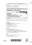 Please check the examination details below before entering your candidate information Candidate surname Centre Number Other names Candidate Number Pearson Edexcel International Advanced Level Wednesday 17 January 2024 Morning (Time: 1 hour 45 minutes) Paper reference Biology WBI15/01 International Advanced Level UNIT 5: Respiration, Internal Environment, Coordination and Gene Technology You must have: Scientific article (enclosed), scientific calculator, ruler, HB pencil Total Marks Instructions black ink or ball‑point pen. •• Use Fill in the boxes at the top of this page with your name, centre number and candidate number. all questions. •• Answer Answer the questions in the spaces provided – there may be more space than you need. Information total mark for this paper is 90. •• The The marks for each question are shown in brackets – use this as a guide as to how much time to spend on each question. In questions labelled with an asterisk (*) marks will be awarded for your ability to • structure your answer logically, showing how the points that you make are related or follow on from each other where appropriate. Advice each question carefully before you start to answer it. •• Read Try to answer every question. • Check your answers if you have time at the end. Turn over P73453A ©2024 Pearson Education Ltd. S:1/1/1/1/ *P73453A0132* Some questions must be answered with a cross in a box . If you change your mind about an answer, put a line through the box and then mark your new answer with a cross . 1 Aerobic respiration is made up of several stages. (a) Which is the correct order of the stages of respiration required for the complete oxidation of glucose? A glycolysis Krebs cycle link reaction B glycolysis link reaction Krebs cycle C link reaction Krebs cycle glycolysis D Krebs cycle glycolysis link reaction (b) Write a balanced equation for the complete oxidation of glucose in aerobic respiration. (1) (2) ................................ . . . . . . . . . . . . . . . . . . . . . . . . . . . . . . . . . . . . . . . . . . . . . . . . . . . . . . . . . . . . . . . . . . . . ............................................................................................................................................ . . . . . . . . . . . . . . . . . . . . . . . . . . . . . . . . . . . . (c) The equation shows the aerobic respiration of a lipid. 2 C18H34O2 + 51 O2 → 36 CO2 + 34 H2O (i) Which is the respiratory quotient when this lipid is used in aerobic respiration? A 0.67 (1) B 0.71 C 1.06 D 1.42 2 *P73453A0232* DO NOT WRITE IN THIS AREA DO NOT WRITE IN THIS AREADO NOT WRITE IN THIS AREA Write your answers in the spaces provided. DO NOT WRITE IN THIS AREA DO NOT WRITE IN THIS AREADO NOT WRITE IN THIS AREA Answer ALL questions. DO NOT WRITE IN THIS AREA DO NOT WRITE IN THIS AREADO NOT WRITE IN THIS AREA DO NOT WRITE IN THIS AREA DO NOT WRITE IN THIS AREADO NOT WRITE IN THIS AREA (ii) The complete oxidation of one molecule of this lipid produces 122 molecules of ATP. One molecule of this lipid contains 12 244 kJ of energy. One molecule of ATP yields 30.51 kJ of the energy. Calculate the percentage of energy in this lipid molecule that can be converted to energy in ATP. Give your answer to three significant figures. (2) Answer ............................... . . . . . . . . . . . . . . . . . . . . . . . . . . . . . . . % (Total for Question 1 = 6 marks) *P73453A0332* 3 Turn over • depolarisation • repolarisation • hyperpolarisation • resting state. (a) (i) Which row shows the events that happen during depolarisation of a neurone? Sodium channels Membrane potential A closed decreasing B closed increasing C open decreasing D open increasing (ii) Explain what happens during repolarisation in a neurone. (1) (3) ................................ . . . . . . . . . . . . . . . . . . . . . . . . . . . . . . . . . . . . . . . . . . . . . . . . . . . . . . . . . . . . . . . . . . . . ............................................................................................................................................ . . . . . . . . . . . . . . . . . . . . . . . . . . . . . . . . . . . . ................................ . . . . . . . . . . . . . . . . . . . . . . . . . . . . . . . . . . . . . . . . . . . . . . . . . . . . . . . . . . . . . . . . . . . . ............................................................................................................................................ . . . . . . . . . . . . . . . . . . . . . . . . . . . . . . . . . . . . ................................ . . . . . . . . . . . . . . . . . . . . . . . . . . . . . . . . . . . . . . . . . . . . . . . . . . . . . . . . . . . . . . . . . . . . ............................................................................................................................................ . . . . . . . . . . . . . . . . . . . . . . . . . . . . . . . . . . . . ................................ . . . . . . . . . . . . . . . . . . . . . . . . . . . . . . . . . . . . . . . . . . . . . . . . . . . . . . . . . . . . . . . . . . . . ............................................................................................................................................ . . . . . . . . . . . . . . . . . . . . . . . . . . . . . . . . . . . . ................................ . . . . . . . . . . . . . . . . . . . . . . . . . . . . . . . . . . . . . . . . . . . . . . . . . . . . . . . . . . . . . . . . . . . . ............................................................................................................................................ . . . . . . . . . . . . . . . . . . . . . . . . . . . . . . . . . . . . ................................ . . . . . . . . . . . . . . . . . . . . . . . . . . . . . . . . . . . . . . . . . . . . . . . . . . . . . . . . . . . . . . . . . . . . ........................................................................................................................