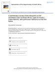 Transactions of the Royal Society of South Africa ISSN: 0035-919X (Print) 2154-0098 (Online) Journal homepage: www.tandfonline.com/journals/ttrs20 A preliminary survey of the estuaries on the southeast coast of South Africa, Cape St Francis – Cape Padrone, with particular reference to the fish fauna N.C. James & T.D. Harrison To cite this article: N.C. James & T.D. Harrison (2010) A preliminary survey of the estuaries on the southeast coast of South Africa, Cape St Francis – Cape Padrone, with particular reference to the fish fauna, Transactions of the Royal Society of South Africa, 65:1, 69-84, DOI: 10.1080/00359191003652116 To link to this article: https://doi.org/10.1080/00359191003652116 Published online: 23 Mar 2010. Submit your article to this journal Article views: 1106 View related articles Citing articles: 3 View citing articles Full Terms & Conditions of access and use can be found at https://www.tandfonline.com/action/journalInformation?journalCode=ttrs20 Transactions of the Royal Society of South Africa Vol. 65(1), February 2010, 69–84 A preliminary survey of the estuaries on the southeast coast of South Africa, Cape St Francis – Cape Padrone, with particular reference to the fish fauna 1 N.C. James & T.D. Harrison 1 2 South African Environmental Observation Network, Elwandle Node, Private Bag 1015, Grahamstown, 6140 South Africa e-mail: n.james@saiab.ac.za. 2 South African Institute for Aquatic Biodiversity, Private Bag 1015, Grahamstown, 6140 South Africa e-mail: tdharrison@eircom.net A basic ichthyofaunal and physico-chemical survey of the coastal outlets on the southeast coast of South Africa (Cape St Francis – Cape Padrone) was conducted during September and October 1995. Eleven systems have been identified along this stretch of coastline. Four systems (Kromme, Gamtoos, Swartkops and Sundays) are permanently open and provide important habitats for a number of estuarine-resident and marine fish species. Three systems (Seekoei, Kabeljous and Van Stadens) are moderately sized estuaries characterised by intermittently open mouths. The Seekoei Estuary has undergone extreme human disturbance, while the Kabeljous and Van Stadens are in a less disturbed state. All three systems provide nursery habitats for both estuarine-resident and estuarine-associated marine species. The Maitland is a small, shallow sandy system that is typically closed to the sea for extended periods; despite this it was still found to support estuarine-associated species particularly mugilids. The remaining three systems (Bakens, Papkuils and Coega) are all highly altered systems that provide little littoral habitat for either resident or migrant marine species. Keywords: ichthyofauna, estuarine survey, fish habitat, southeast coast, South Africa. INTRODUCTION The South African coastline extends approximately 3000 km from the Orange (Gariep) River (28°38’S, 16°28’E) on the west (Atlantic Ocean) coast to Kosi Bay (26°54’S, 32°53’E) on the east (Indian Ocean) coast. Some 300 coastal outlets have been identified along the coast of South Africa and these range from relatively large, permanently open estuaries to inlets of coastal streams and even dry river beds that only occasionally contain water. Estuaries are typically formed where freshwater from rivers and saltwater from the sea meet and, as such, are unique environments characterised by variations in environmental conditions. Estuaries are amongst the most variable aquatic environments on earth and are known to be more productive than adjacent freshwater and marine environments (Woodwell et al., 1973; Haedrich & Hall, 1976). Estuaries are also sheltered environments and often serve as important nursery areas for various fish species (Dando, 1984; Wallace et al., 1984). After reviewing the available scientific information on South African estuarine systems Whitfield (2000) found that, of the 258 systems included in the review, the state of information on 68% was either ‘nil’ or ‘poor ’; the state of information on 22% was classified as ‘moderate’, while only 10% were regarded as ‘good’ or ‘excellent’. This paper reports on ichthyofaunal surveys of estuaries between Cape St Francis and Cape Padrone on the southeast coast of South Africa conducted during 1995 and describes physico-chemical variables, presents basic fish community data, and provides an appraisal of the nursery potential ISSN 0035-919X print © 2010 Royal Society of South Africa DOI: 10.1080/00359191003652116 http://www.informaworld.com Published online 23 Mar 2010 of these systems for fishes. This paper is a continuation of the published series on the fish assemblages of South African estuaries (Harrison 1997a,b; 1998; 1999a,b; James & Harrison, 2008, 2009). STUDY AREA The coastline in the vicinity of Port Elizabeth is dominated by westerly and southwesterly winds throughout the year (Stone et al., 1998). This coastline borders the southwestern Indian Ocean and is influenced by the warm, south-flowing Agulhas Current (Heydorn, et al., 1978). Eleven river outlets intersect the coast in this geographical sector (Figure 1). Rainfall along the coastline west of Port Elizabeth occurs throughout the year with maximum falls usually experienced during spring and autumn (Kopke, 1988). The coastline that extends from Port Elizabeth to Port Alfred tends to receive most of its rain in winter (Kopke, 1988). MATERIALS AND METHODS The estuaries between Cape St Francis and Cape Padrone were sampled during September and October 1995. Each system was sampled once and took 1–3 days to survey, depending on the size of the system. Physico-chemical During each survey, selected physico-chemical parameters were measured at various sites within each system. Water depth and transparency were measured using a 20 cm diameter 70 Transactions of the Royal Society of South Africa Vol. 65(1): 69–84, 2010 Figure 1. The locality of study estuaries between Cape St Francis and Cape 