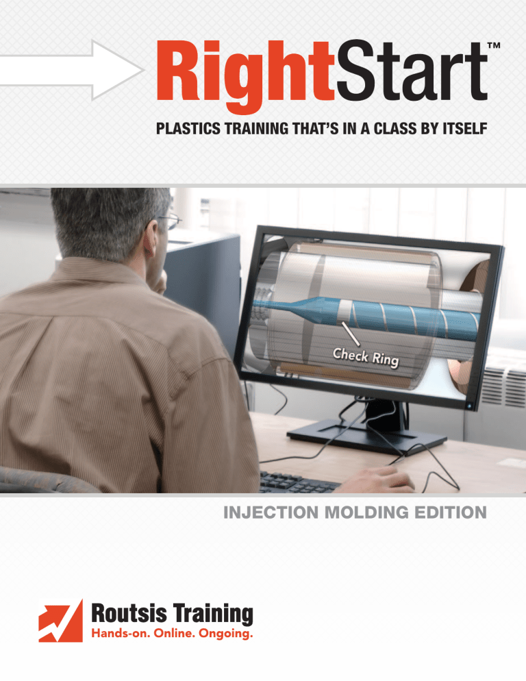 PLASTICS TRAINING THAT’S IN A CLASS BY ITSELF INJECTION MOLDING EDITION Contents Services................................................................................ 3 Routsis’s RightStart™ Process....................................... 3 Online Training Courses....................................................... 6 Basic ............................................................................. 6 Advanced...................................................................... 8 Production.................................................................. 14 Maintenance............................................................... 21 Design......................................................................... 23 Technical Skills............................................................. 26 Classroom & On-site Training............................................. 28 Fundamental............................................................... 28 Intermediate............................................................... 30 Advanced.................................................................... 33 Workshop.................................................................... 36 Critical Success Factors for Training................................... 37 Return on Investment........................................................ 38 Routsis Training 275 Donohue Rd., Suite 1 Dracut, MA 01826 (USA) TEL: (978) 957-0700 FAX: (978) 957-1860 info@traininteractive.com WEBSITE: www.traininteractive.com EMAIL: SERVICES RightStart™ Routsis’s RightStart™ Process (page 1 of 3) Would you like on-site implementation of the easiest and fastest way to effectively train your entire workforce? Turn to Routsis for our RightStart™ system, and we’ll get you started right away with a complete, custom program that delivers uniquely relevant training for your company and employees. Our Process for Tailoring and Launching Your Training Program Here’s a quick look at how the RightStart™ Process works: 1. 2. 3. 4. 5. We actually visit your plant and create a custom training plan specifically designed for each employee at your workplace. Based on your facility, we create job-specific tasks to develop and reinforce proper day-to-day work habits. We show you how to implement, track, and customize your training – so you can launch your new training initiative. Start training immediately with access to the world’s largest library of engaging, practical plastics training courses available. We provide ongoing support to ensure you get the most from your program. Benefits of RightStart™ · · · · · · The absolute fastest, most effective way to train your production workforce Your company’s own secure online training portal Complete onsite setup and implementation – everything you need to get going and succeed A full 30-day money back guarantee Continuous collaboration with the knowledgeable, committed and service-driven Routsis team In-depth training specially developed by plastics industry experts – and customized for your shop floor Best of all, it’s easy to get started with the Routsis RightStart™ process: Just contact us today. tel: (978) 957-0700 fax: (978) 957-1860 www.traininteractive.com 3 SERVICES RightStart™ Routsis’s RightStart™ Process (page 2 of 3) Routsis is the only plastics training provider that will conduct an onsite visit to assist you in establishing a specific training plan for your entire workforce. During the RightStart™ process, we’ll help you list the respective job responsibilities of every position in your operation. We’ll develop a unique plan with established goals and a timetable for completing the outlined training. By developing and enhancing the skills of each employee and job position at your facility, you’ll have a more versatile workforce and will never have to rely on one or two go-to production personnel. While we’re onsite, we help establish critical metrics that include; scrap rate, set-up times, troubleshooting times, accidents, mold and machine damage, and more. Continuous improvement is the objective of any training initiative and these key metrics are monitored throughout the training initiative and reported in dollars on a monthly basis so that your operation continuously strives to achieve its goals and, more importantly, will not lose sight of the goal of keeping on top of everything within the training plan – which serves as a the blueprint. 4 Questions Our Competitors Hope You Never Ask Will your plastics professionals come to my plant and help devise a structured training plan? Do you supply the necessary tools to customize my interactive training? Do you provide plant specific on-the-job training tasks? Will you teach me how to use, track, monitor, and customize my training? You’ll receive all of the necessary tools to make your training initiative succeed and the net result is a lean, versatile, well-skilled workforce that will keep you profitable and competitive for years to come. Typical payback on your training investment averages a mere 3.4 months. When we establish your company’s structured training plan, we integrate multiple forms of training designed to develop skills for your employees and include; computer-based interactive training (online), and plant-specific on the floor exercises created for each job position at your facility. The plan also includes training that we do not supply – such as machinespecific trade shows, outside seminars, and more. tel: (978) 957-0700 fax: (978) 957-1860 www.traininteractive.com 4 SERVICES RightStart™ Routsis’s RightStart™ Process (page 3 of 3) Routsis offers extensive implementation assistance and is second to none within the plastics industry. This includes facilitator instruction on how to use, customize, track and implement the online training. We ensure that your training gets up and running quickly. We’ll configure your training station(s) an
