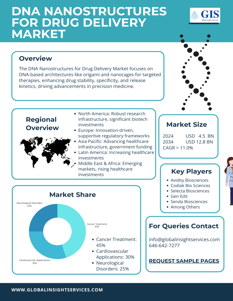 DNA NANOSTRUCTURES FOR DRUG DELIVERY MARKET Overview The DNA Nanostructures for Drug Delivery Market focuses on DNA-based architectures like origami and nanocages for targeted therapies, enhancing drug stability, specificity, and release kinetics, driving advancements in precision medicine. Regional Overview North America: Robust research infrastructure, significant biotech investments Europe: Innovation-driven, supportive regulatory frameworks Asia Pacific: Advancing healthcare infrastructure, government funding Latin America: Increasing healthcare investments Middle East & Africa: Emerging markets, rising healthcare investments Market Share Neurological Disorders 25% Cancer Treatment 45% Cardiovascular Applications 30% Cancer Treatment: 45% Cardiovascular Applications: 30% Neurological Disorders: 25% WWW.GLOBALINSIGHTSERVICES.COM Market Size 2024 USD 4.5 BN 2034 USD 12.8 BN CAGR > 11.0% Key Players Avidity Biosciences Codiak Bio Sciences Selecta Biosciences Gen Edit Senda Biosciences Among Others For Queries Contact info@globalinsightservices.com 646-642-7277 REQUEST SAMPLE PAGES