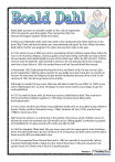 Roald Dahl was born in Llandaff, Cardiff, on the 13th of September, 1916. His parents were Norwegian. They named him after the famous Norwegian explorer Roald Amundsen. In February 1920 Dahl’s older sister Astri died. A few weeks later, his father died too. In his book “Boy” Dahl said that his father was “overwhelmed with grief” for Astri. When his father died, Dahl’s mother was pregnant. His sister Asta was born later in the year. In 1925, when he was 9, Dahl was sent to a boarding school in Weston-Super-Mare. When he was 13, he moved to Repton, a famous public school near Derby. Dahl did not enjoy it there. He was beaten and treated badly by some of the other boys. When he left school in 1934 he went to work for Shell Oil. Dahl wanted to travel, so he was pleased when the company sent him to East Africa in 1938. He worked there until the Second World War started. In November 1939, Dahl joined the Royal Air Force and learnt to fly. He was sent to Libya and in September 1940 his plane crashed. He was badly hurt and it took him six months to recover. He went back to flying but he got terrible headaches because of the crash. In the summer of 1941 he had to go home to his mother. Although he couldn’t fly any more, Dahl was still able to help the war effort. In 1942 he was sent to Washington D.C. to work. He began to write stories and he soon began to get his work published. In 1951 he met his future wife, an American actress called Patricia Neal. They married in 1953 and had five children together. In 1954 they moved to Great Missenden, Buckinghamshire. In 1961 James and the Giant Peach was published. Roald went on to publish many children’s books: Charlie and the Chocolate Factory (1964), Fantastic Mr Fox (1970), and the Twits (1980) to name but a few. Dahl wrote his stories in a writing hut in the garden of his house, which children were not allowed to enter! He invented over 500 words such as “biffsquiggled” (confused or puzzled) and “gobblefunk” (to play around with words, just like he did). In 1962 his daughter Olivia died. She was seven years old, the same age his sister had been when she died. Dahl kept a picture of Olivia in his writing hut and both James and the Giant Peach and the BFG are dedicated to her. In 1981 he separated from Patricia Neal and in 1983 he married his second wife, Felicity Crosland. Roald Dahl died in Oxford on the 23rd of November 1990 and is buried in the parish church of St Peter and St Paul in Great Missenden. Version 1 © www.teachingideas.co.uk Roald Dahl - Biography Questions 1) Where was Roald Dahl born? 2) Why was he called ‘Roald’? 3) Dahl said that his father was ‘overwhelmed with grief’. Which of these words has a similar meaning to ‘grief’? comfort heartache joy peace 4) Why didn’t Roald Dahl enjoy his time at boarding school? 5) Why was Dahl pleased with his new job at Shell Oil? 6) Where did Dahl write his stories? 7) How many children did Dahl have with Patricia Neal? 8) When was James and the Giant Peach first published? 9) Which two books are dedicated to Dahl’s daughter Olivia? 10) Where is Roald Dahl buried? 11) How would you describe Roald Dahl? Give reasons for your answer. 12) Which is your favourite Roald Dahl book and why? Version 1 © www.teachingideas.co.uk Roald Dahl - Biography Questions 1) Where was Roald Dahl born? Llandaff in Cardiff. 2) Why was he called ‘Roald’? He was named after the famous Norwegian explorer Roald Amundsen. 3) Dahl said that his father was ‘overwhelmed with grief’. Which of these words has a similar meaning to ‘grief’? comfort heartache joy peace 4) Why didn’t Roald Dahl enjoy his time at boarding school? He was beaten and treated badly by some of the other boys. 5) Why was Dahl pleased with his new job at Shell Oil? Because he wanted to travel and they sent him to East Africa. 6) Where did Dahl write his stories? In a writing hut in the garden of his house. 7) How many children did Dahl have with Patricia Neal? Five 8) When was James and the Giant Peach first published? 1961 9) Which two books are dedicated to Dahl’s daughter Olivia? James and the Giant Peach and the BFG. 10) Where is Roald Dahl buried? In the parish church of St Peter and St Paul in Great Missenden. 11) How would you describe Roald Dahl? Give reasons for your answer. Answers may include clever, talented, funny (with reasons to justify opinions). 12) Which is your favourite Roald Dahl book and why? Answers may vary. Version 1 © www.teachingideas.co.uk Roald Dahl was born in Llandaff, Cardiff, on the 13th of September, 1916. Both of his parents were Norwegian. As a boy Dahl spoke both Norwegian and English. He was named after Roald Amundsen, the famous Norwegian who was the first explorer to reach the South Pole. His father was a shipbroker, which means he sold all of the items that ships needed to take with them on voyages. Dahl had three older sisters and an older brother. In February 1920, Dahl’s older sister Astri died from a burst appendix. A few weeks later, his father also died (of pneumonia). In his autobiography “Boy” Dahl said that his father was “overwhelmed with grief” for Astri. When his father died, Dahl’s mother was pregnant. His sister Asta was born later in the year. This was a difficult time for Dahl’s mother, Sofie. She had a large family to look after on her own. When he was 9 years old, Dahl was sent to a boarding school; St Peter’s in Weston-Super-Mare. When he was 13, he moved to Repton, a famous public school near Derby. Dahl did not enjoy his time there. He was beaten and treated badly by some of the other boys. When he left school in 1934 he went on an expedition to Newfoundland and then went to work for Shell Oil. Dahl wanted to travel, so he was pleased when the company sent him to East Africa in 1938. He worked there until the outbreak of the Second World War. In November 1939, Dahl joined the Royal Air Force and learnt to fly. He was posted