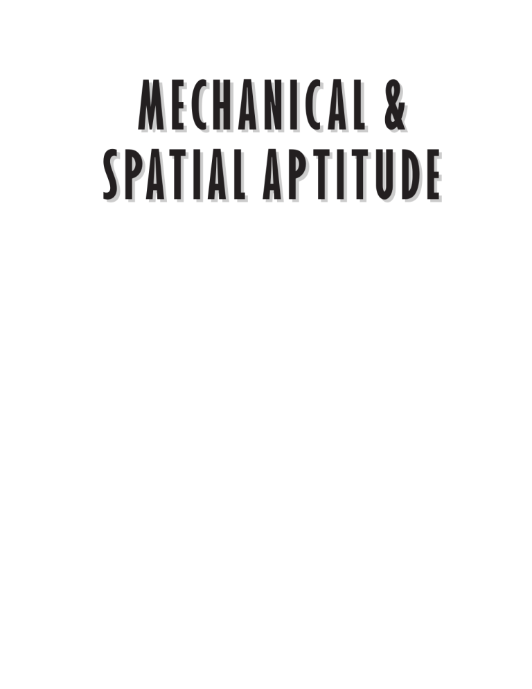 MEC HANIC AL & SP A TIAL APTITUDE MEC HANIC AL & SP A TIAL APTITUDE New York Copyright © 2001 LearningExpress, LLC. All rights reserved under International and Pan-American Copyright Conventions. Published in the United States by LearningExpress, LLC, New York. Library of Congress Cataloging-in-Publication Data: Mechanical and spatial aptitude. p. cm.—(Skill builders series) ISBN 1-57685-357-8 1. Mechanical Ability—Examinations, questions, etc. 2. Space perception— Examinations, questions, etc. 3. Reasoning (Psychology)—Examinations, questions, etc. I. LearningExpress (Organization) II. Skill builders series (New York, N.Y.) BF433.M4 M44 2001 153.9'462—dc21 2001016501 Printed in the United States of America 987654321 First Edition ISBN 1-57685-357-8 For Further Information For information or to place an order, contact LearningExpress at: 900 Broadway Suite 604 New York, NY 10003 Or visit our website at: www.learnatest.com CONTENTS 1 • GETTING READY FOR A MECHANICAL/SPATIAL APTITUDE TEST 2 • THE LEARNINGEXPRESS TEST PREPARATION SYSTEM 3 • MECHANICAL APTITUDE Shop Arithmetic Tool Knowledge Mechanical Insight Mechanical Knowledge 4 • SPATIAL CONCEPTS Hidden Figures Block Counting Rotated Blocks Matching Pieces and Parts Spatial Analysis Understanding Patterns Eye–hand Coordination Reading Maps 5 • INTERPRETING SYMBOLS Symbol Series Symbol Analogies Sorting and Classifying Figures Series Reasoning Test 6 • DIAGNOSTIC TEST—PRACTICE WHAT YOU HAVE LEARNED Practice Questions C • H • A • P • T • E • R GETTING READY FOR A MECHANICAL/SPATIAL APTITUDE TEST 1 CHAPTER SUMMARY If you’re the kind of person who has always been fascinated with gears and pulleys, nuts and bolts, and electrical mazes, this book is for you! In fact, you are probably the same person who can think in 3D and can use your natural mechanical/spatial abilities for your career. Chances are your abilities will put you in a good position to take any kind of exam that tests mechanical/spatial aptitude. Remember though, that practice makes perfect in the long run. That’s why you’re reading this book. T he ability to understand and use mechanical devices is critical for a job in many fields. Whether you decide to enter the military, apply for a government job, or take a job in private industry, you’ll have to take an entrance test that determines your skills and abilities. The military requires that all candidates take the ASVAB (Armed Services Vocational Aptitude Battery) test. Many government positions (local, state, and federal) require you to take an entrance level exam that measures your skills. If you want to be a police officer or firefighter, your ability to use mechanical devices and solve spatial concepts problems is very important and shows up on most every test. People who work in the professions that require mechanical/spatial ability use many different mechanical devices every day. Simple hand tools LearningExpress Mechanical & Spatial Aptitude • CHAPTER 1 1 –GETTING READY FOR A MECHANICAL/SPATIAL APTITUDE TEST– such as axes and wrenches, as well as more complex systems such as pumps and internal combustion engines are standard tools of the trade. Spatial concepts go handin-hand with mechanical ability. If the exam you have to take includes a section on mechanical aptitude, it may cover topics with which you are very familiar, as well as some that are new. If the exam covers spatial aptitude, you’ll get lots of practice solving that kind of problem as well. In this introductory chapter, you’ll find a few sample questions to try. Next, you’ll be given many practice questions designed to improve your mechanical, spatial, and symbol reasoning abilities. Last, you can take a diagnostic test to practice what you have learned. Regardless of your background, understanding the concepts in this book will benefit you on an exam designed to test your mechanical/spatial abilities. WHAT IS MECHANICAL ABILITY? Basically, mechanical ability means that you can understand mechanical principles, devices, and tools, and the everyday physics that make them work. You also have the ability to reason and understand the direction of movement of gears in a system of gears. In addition, you can see the patterns of moving parts in engines and machines. Mechanical devices are an integral part of everyday life. When you imagine the numbers of cars on the highways, offices with machines and computers that make routine office duties easier, and the recreational vehicles used for vacations, you can quickly calculate that a person with mechanical abilities will have lots of work to do in a lifetime. Mechanical aptitude questions tend to cover a wide range of topics. The questions will usually be multiple choice with four or five possible answers. Some 2 questions may require previous knowledge of the topic while other questions will include all of the information you need to choose an answer. A typical mechanical aptitude question will look something like this: Which of the following is a common component of an internal combustion engine? a. a piston b. a compass c. a hammer d. a hydraulic jack The answer is a, a piston. A compass is used to determine a direction on a map. A hammer is used to drive nails. A hydraulic jack is used to lift heavy items. Some exams may test your knowledge of various systems or combinations of mechanical devices. A common example of a mechanical system is the internal combustion engine of an automobile. Other questions will require the identification of various mechanical tools or devices like hand tools, gears, pulleys, levers, fasteners, springs, valves, gauges, and pumps. WHAT IS A MECHANICAL DEVICE? A mechanical device is a tool invented to make a given task easier. For example, you could drive a nail into a piece of wood with a rock. However, a long time ago, a woodworker must have decided that there had to be a better way. A long slender handle with a hard piece 