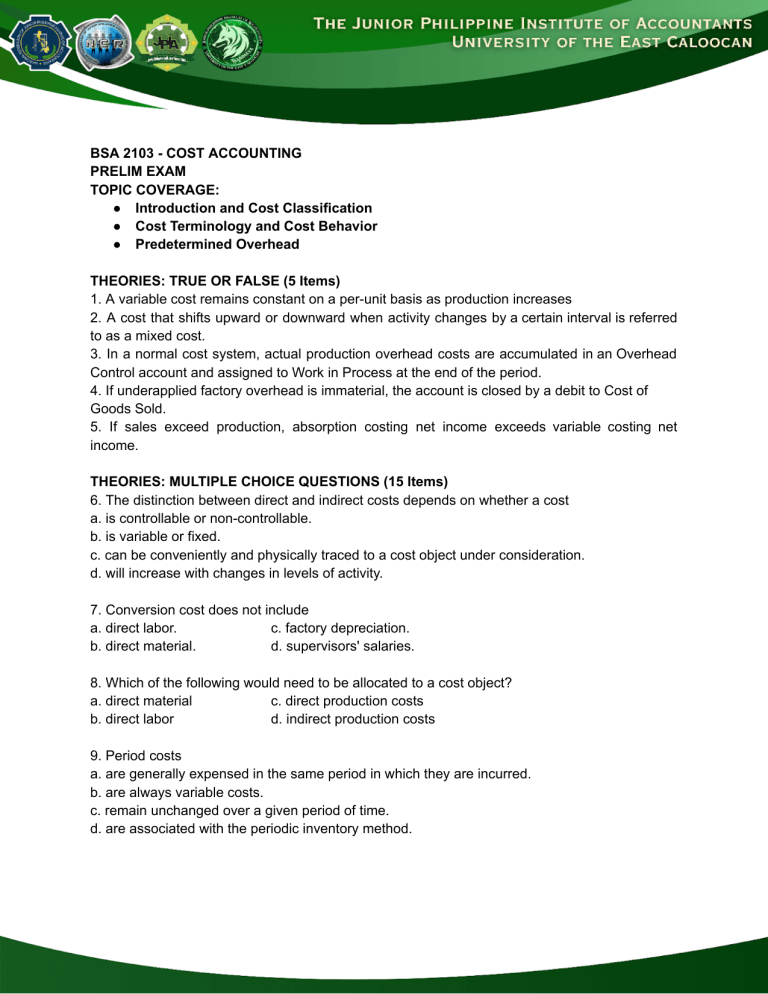 SA 2103 - COST ACCOUNTING B PRELIM EXAM TOPIC COVERAGE: ● Introduction and Cost Classification ● Cost Terminology and Cost Behavior ● Predetermined Overhead HEORIES: TRUE OR FALSE (5 Items) T 1. A variable cost remains constant on a per-unit basis as production increases 2.Acostthatshiftsupwardordownwardwhenactivitychangesbyacertainintervalisreferred to as a mixed cost. 3.Inanormalcostsystem,actualproductionoverheadcostsareaccumulatedinanOverhead Control account and assigned to Work in Process at the end of the period. 4. If underapplied factory overhead is immaterial, the account is closed by a debit to Cost of Goods Sold. 5. If sales exceed production, absorption costing net income exceeds variable costing net income. HEORIES: MULTIPLE CHOICE QUESTIONS (15 Items) T 6. The distinction between direct and indirect costs depends on whether a cost a. is controllable or non-controllable. b. is variable or fixed. c. can be conveniently and physically traced to a cost object under consideration. d. will increase with changes in levels of activity. . Conversion cost does not include 7 a. direct labor. c. factory depreciation. b. direct material. d. supervisors' salaries. . Which of the following would need to be allocated to a cost object? 8 a. direct material c. direct production costs b. direct labor d. indirect production costs . Period costs 9 a. are generally expensed in the same period in which they are incurred. b. are always variable costs. c. remain unchanged over a given period of time. d. are associated with the periodic inventory method. 0. The formula to compute cost of goods manufactured is 1 a. beginning Work in Process Inventory plus purchases of raw material minus ending Work in Process Inventory. b. beginning Work in Process Inventory plus direct labor plus direct material used plus overhead incurred minus ending Work in Process Inventory. c. direct material used plus direct labor plus overhead incurred. d. direct material used plus direct labor plus overhead incurred plus beginning Work in Process Inventory. 1. When the number of units manufactured increases, the most significant change in unit cost 1 will be reflected as a(n) a. increase in the fixed element. c. increase in the mixed element. b. decrease in the variable element. d. decrease in the fixed element. 2. Statement 1: A specific product cannot be a cost object 1 Statement 2: Fixed cost per unit varies directly with production. a. Statement 1 is True, Statement 2 is false b. Both statements are true c. Statement 2 is True, Statement 1 is false d. Both statements are false 3. Since overhead costs are indirect costs, 1 a. they require some process of allocation. b. they can be easily traced to production. c. a predetermined overhead rate is not advantageous. d. they cannot be allocated. 4. Statement 1: The portion of an asset that was consumed during a period is referred to an 1 expired cost. Statement 2: An indirect cost can be easily traced to a cost object. a. Statement 1 is True, Statement 2 is false b. Both statements are true c. Statement 2 is True, Statement 1 is false d. Both statements are false 5. An example of a fixed cost is 1 a. total indirect material cost. b. total hourly wages. . cost of electricity. c d. straight-line depreciation. 6. A cost driver 1 a. causes fixed costs to rise because of production changes. b. has a direct cause-effect relationship to a cost. . can predict the cost behavior of a variable, but not a fixed cost. c d. is an overhead cost that causes distribution costs to change in distinct increments with changes in production volume. 7. A cost driver 1 a. causes fixed costs to rise because of production changes. b. has a direct cause-effect relationship to a cost. c. can predict the cost behavior of a variable, but not a fixed cost. d. is an overhead cost that causes distribution costs to change in distinct increments with changes in production volume. 8. Product costs are deducted from revenue 1 a. as expenditures are made. c. as goods are sold. b. when production is completed. d. to minimize taxable income. 9. Which of the following is not a product cost component? 1 a. rent on a factory building b. indirect production labor wages c. janitorial supplies used in a factory d. commission on the sale of a product 0. Which of the following is not a reason to use predetermined overhead rates? 2 a. to overcome the problems of assigning overhead to diverse types of products b. to compensate for fluctuations in monthly overhead costs c. to provide a means for assigning overhead during the period rather than at the endofthe period d. to smooth out the amount of overhead costassignedtoproductswhenmonthlyproduction activity differs PROBLEM SOLVING (15 Items) he record of Base Corporation revealed the following date for the current year. T Work in Process P 73, 150 Finished Goods 115, 000 Cost of Goods Sold 133, 650 Direct Labor 111, 600 Direct Material 84, 200 1. Assume that Base has underapplied overhead of P10,000 and that this amount is 2 immaterial. What is the balance in Cost of Goods Sold after the underapplied overhead is closed? a. P 133,650 . P 123,650 b c. P 143,650 d. P 137,803 2. Refer to Base Corporation. Assume, for this question only, actual overhead is P98, 700 and 2 applied overhead is P 93, 250. Manufacturing overhead is: a. over applied by P12, 900 b. under applied by P18, 350 c. over applied by P5, 450 d. under applied by P5, 450 3. Assume that Base has overapplied overhead of P 25,000 and that this amount is material. 2 What is the balance in Cost of Goods Sold after the overapplied overhead is closed? a. P 123,267 b. P 144,033 c. P 158,650 d. P 108,650 4. Refer to Base Corporation. Assume that Base has under applied overhead of P37, 200 and 2 that this amount is material. What journal entry is needed to close the overhead account? (Round decimals to the nearest whole percent) a. Debit Work in Process P8,456; Finished Goods P13, 294; Cost of Good Sold P15, 450 and cr