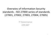 Overwiev of Information Security standards - ISO 27000 series of standards (27001, 27002, 27003, 27004, 27005) IT Governance CEN 667 1 Project proposal - week 2 • Goal of the projects are to find applicable measurement and metric methods to improve processes: – For 27000 series of standards 27001 and 27004 – – For ITIL – For Business Continuity and BS 25999 – For Disaster Recovery – – For Penetration testing – – For Operational and Security Incident management – For Risk Management – Secure method for visual authentication – – Mobile securty access with speach recognition – – Other agreed with lecturer • • Literature review on selected topic - between 500 and 1000 words Proposal / for improvements of choosen method, approach, techniqe, - up to 2000 words • List of references • Document prepared in two columns as it should Be prepared for the conference paper • Week report on updates 2 Lectures Schedule Week Topic Introduction to IT governance Week 1 Week 2 Week 3 Week 4 Week 5 Week 6 Week 7 Week 8 Week 9 Week 10 Week 11 Week 12 Week 13 Week 14 Week 15 Overwiev of Information Security standards - ISO 27000 series of standards (27001, 27002, 27003, 27004, 27005) Information Technology Service management ISO 20000-1 and ISO 20000-2 ITIL Business Continuity and BS 25999-1 and BS 25999-2 Disaster Recovery COBIT Project implementation (ISO 10006 and ISO 27003) Midterm Risk Managament (ISO 27005) Application and Network Security and security testing Specific Requirements and Controls Implementation (ISO 27002) Operational and Security Incident managament Perforamnce Measurement and Metrics (ISO 27004) Audit (ISO 19011) and Plan- Do-Check-Act impovement cyclus 3 Agenda – The ISO 27000 Framework • ISO/IEC 27001:2005 ISMS • ISO/IEC 27002:2005 Controls • ISO/IEC 27003:2010 implementation guidance • ISO/IEC 27004:2009 Measurement and Metrics • ISO/IEC 27005:2008 Risk Management – The ISMS Roadmap – A Controls Framework – Information Security Organization – Mission and Structure – Discussion/Questions/Lessons Learned 4 Information Security Governance – How can an organization make good decisions about information risk? – Risks identified, mitigated, accepted equals security – Information Security is a business requirement – CIA – Confidentiality, Integrity, Availability – PCI, HIPAA, SOX, State Privacy Regulations – Impact of loss of security on an organization is extreme • Damage to brand, share price • Direct costs • Unavailable critical business processes – Business awareness of impact is key 5 Cofidentality Integrity Availability C I A ensuring that information is accessible only to those authorized to have access Information integrity is the assurance that information is consistent, certified and can be reconciled. Ensuring that only authorized personel have access to information when they neede it Keep CIA, and this is a way 6 7 Mjerenje KPI 9 10 Other cases • Sources: • - Business continuity lessons from Buncefield, Continuity Central, Huddersfield, West Yorkshire, England, • - Jon William Toigo, Disater Recovery Planing: Preparing for Unthinkable, Third edition. Foreword xi 11 Buncefield fuel depot (Hemel Hempstead ) London, December 2005 1 2 3 5 4 12 Northgate Information Solutions Buncefield fuel depo 1 2 13 Next case... 14 2 1 3 Emergecny Response Team / Center for Port Authority Responsible for 3 airports, tunels, bridges, buses and trains meet at Marriot Hotel. 15 1 4 2 3 16 Planiranje i testiranje nastvka poslovanja Planiranje i testiranje nastvka poslovanja Leading data loss causes Hardware or System Malfunctions 44% Human Error 32% Software Corruption 14% Computer Viruses 7% Natural Disasters 3% Gartner 20 Sa BH informativnih portala Ljudi ne znaju šta im se dogodilo A policija traga Opet vijesti... Koliko je čest SPAM i koliko nas košta? Krađe lozinke i troškovi Velike štete Primjer iz telekomunikacijskog sektora Špijunjiranje – realna stvarnost Špijunjiranje – realna stvarnost Trend porasta Ove stvari se ne mogu desiti u BiH??? Ove stvari se ne mogu desiti u BiH??? Facts • Information security, is not Information Technology (IT) security. • It is security of information and informatio assets. • Information assets are: – Electronic Information – Non-electronic Information; – Environment / Infrastructure; – Hardware; Information security is to keep CIA – Software; Confidentiality, – Physical; Integrity, Availability – People; – Services. • Keep aseet CIA 47 Everyday media reports, reveal information of security Incidents As a result of unmanaged information security These cases leads to: •Resignations of important postions in institutions •Civil court cases •Assets lost •Reputation lost and public embarisment •End of business SUNDAY MORNING 10:00 O’clock You don’t want to be this guy: to read about information security incident in his organization on Sunday morning 48 What is the ISO 2700 Framework? • International Organization for Standardization • Governance - ISO 27001 – Establishing and Operating the ISMS – Plan, DO, Check, Act – Management commitment and involvement – Information Asset “Ownership” • Controls – ISO 27002 – Deterrent – Preventative – Detective – Corrective – Recovery – Compensating • Available for download as Intellectual Property 49 What is the ISO Framework cont. • • Implementation - ISO 27003 – – – – – – – Managament approval Defining scope Objective Scope Processes Assets Risk assesment Metrics – ISO 27004 – Key Performance Indicators – Chosing what to measure – Collecting data • Risk managament – ISO 27005 – – – – – – – – – – Risk analysis Risk identification Risk estmation Risk evaluation Risk reduction Risk retention Risk avoidance Risk transfer Risk acceptance Riks Communication 50 To keep direction of the business activities on the ri
