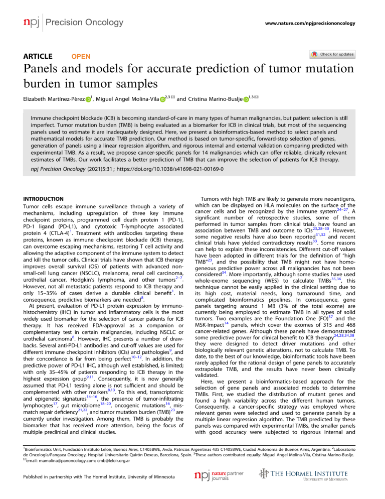 www.nature.com/npjprecisiononcology ARTICLE OPEN Panels and models for accurate prediction of tumor mutation burden in tumor samples Elizabeth Martínez-Pérez 1 , Miguel Angel Molina-Vila 2,3 ✉ and Cristina Marino-Buslje 1,3 ✉ Immune checkpoint blockade (ICB) is becoming standard-of-care in many types of human malignancies, but patient selection is still imperfect. Tumor mutation burden (TMB) is being evaluated as a biomarker for ICB in clinical trials, but most of the sequencing panels used to estimate it are inadequately designed. Here, we present a bioinformatics-based method to select panels and mathematical models for accurate TMB prediction. Our method is based on tumor-specific, forward-step selection of genes, generation of panels using a linear regression algorithm, and rigorous internal and external validation comparing predicted with experimental TMB. As a result, we propose cancer-specific panels for 14 malignancies which can offer reliable, clinically relevant estimates of TMBs. Our work facilitates a better prediction of TMB that can improve the selection of patients for ICB therapy. 1234567890():,; npj Precision Oncology (2021)5:31 ; https://doi.org/10.1038/s41698-021-00169-0 INTRODUCTION Tumor cells escape immune surveillance through a variety of mechanisms, including upregulation of three key immune checkpoint proteins, programmed cell death protein 1 (PD-1), PD-1 ligand (PD-L1), and cytotoxic T-lymphocyte associated protein 4 (CTLA-4)1. Treatment with antibodies targeting these proteins, known as immune checkpoint blockade (ICB) therapy, can overcome escaping mechanisms, restoring T cell activity and allowing the adaptive component of the immune system to detect and kill the tumor cells. Clinical trials have shown that ICB therapy improves overall survival (OS) of patients with advanced nonsmall-cell lung cancer (NSCLC), melanoma, renal cell carcinoma, urothelial cancer, Hodgkin’s lymphoma, and other tumors2–7. However, not all metastatic patients respond to ICB therapy and only 15–35% of cases derive a durable clinical benefit1. In consequence, predictive biomarkers are needed8. At present, evaluation of PD-L1 protein expression by immunohistochemistry (IHC) in tumor and inflammatory cells is the most widely used biomarker for the selection of cancer patients for ICB therapy. It has received FDA-approval as a companion or complementary test in certain malignancies, including NSCLC or urothelial carcinoma8. However, IHC presents a number of drawbacks. Several anti-PD-L1 antibodies and cut-off values are used for different immune checkpoint inhibitors (ICIs) and pathologies9, and their concordance is far from being perfect10–12. In addition, the predictive power of PD-L1 IHC, although well established, is limited; with only 35–45% of patients responding to ICB therapy in the highest expression group9,11. Consequently, it is now generally assumed that PD-L1 testing alone is not sufficient and should be complemented with other markers8,13. To this end, transcriptomic and epigenetic signatures14–16, the presence of tumor-infiltrating lymphocytes17, gut microbiome18–20, oncogenic mutations16, mismatch repair deficiency21,22, and tumor mutation burden (TMB)23 are currently under investigation. Among them, TMB is probably the biomarker that has received more attention, being the focus of multiple preclinical and clinical studies. Tumors with high TMB are likely to generate more neoantigens, which can be displayed on HLA molecules on the surface of the cancer cells and be recognized by the immune system24–27. A significant number of retrospective studies, some of them performed in tumor samples from clinical trials, have found an association between TMB and outcome to ICIs23,28–30. However, some negative results have also been reported31,32 and recent clinical trials have yielded contradictory results33. Some reasons can help to explain these inconsistencies. Different cut-off values have been adopted in different trials for the definition of “high TMB”23, and the possibility that TMB might not have homogeneous predictive power across all malignancies has not been considered34. More importantly, although some studies have used whole-exome sequencing (WES) to calculate TMBs35,36, this technique cannot be easily applied in the clinical setting due to its high cost, material needs, long turnaround time, and complicated bioinformatics pipelines. In consequence, gene panels targeting around 1 MB (3% of the total exome) are currently being employed to estimate TMB in all types of solid tumors. Two examples are the Foundation One (FO)37 and the MSK-Impact34 panels, which cover the exomes of 315 and 468 cancer-related genes. Although these panels have demonstrated some predictive power for clinical benefit to ICB therapy24,28,34,38, they were designed to detect driver mutations and other biologically relevant genetic alterations, not to calculate TMB. To date, to the best of our knowledge, bioinformatic tools have been rarely applied for the rational design of gene panels to accurately extrapolate TMB, and the results have never been clinically validated. Here, we present a bioinformatics-based approach for the selection of gene panels and associated models to determine TMBs. First, we studied the distribution of mutant genes and found a high variability across the different human tumors. Consequently, a cancer-specific strategy was employed where relevant genes were selected and used to generate panels by a multiple linear regression algorithm. The TMB predicted by these panels was compared with experimental TMBs, the smaller panels with good accuracy were subjected to rigorous internal and 1 Bioinformatics Unit, Fundación Instituto Leloir, Buenos Aires, C1405BWE, Avda. Patricias Argentinas 435 C1405BWE, Ciudad Autonoma de Buenos Aires, Argentina. 2Laboratorio de Oncología/Pangaea Oncology, Hospital Universitario Quirón Dexeus, Barcelona, Spain. 3These au