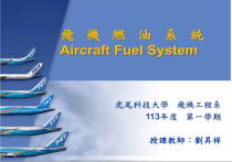 按一下以編輯母片標題樣式 飛 機 燃 油 系 統 Aircraft Fuel System 虎尾科技大學 飛機工程系 113年度 第一學期 授課教師:劉昇祥 FOR TRAINING PURPOSES ONLY 1 按一下以編輯母片標題樣式 Aircraft Fuel Systems FOR TRAINING PURPOSES ONLY 2 按一下以編輯母片標題樣式 Airframe Fuel Systems 機體燃油系統 Engine Fuel Systems 發動機燃油系統 FOR TRAINING PURPOSES ONLY 3 按一下以編輯母片標題樣式 Reference Training Material EASA Part-66 Cat. B1 – M11A 11.10 (Airframe fuel system) – M15A 15.11 (Engine fuel system) FAA Handbooks and Manuals – http://www.faa.gov/library/manuals/ aircraft/ • FAA-H-8083-31 AMT Airframe Vol.2 (CH.14) • FAA-H-8083-32 AMT Powerplant Vol.1 (CH.2) FOR TRAINING PURPOSES ONLY 4 按一下以編輯母片標題樣式 Class Disciplines 課堂規範 上課紀律: – 教師連續兩節授課,中途不休息。(提早10分鐘下課) – 學生於課堂進行期間,有任何離開教室需求時, 可逕自離席,不必請求授課教師許可。 – 學生於課堂進行期間,不可 • 趴桌面睡覺,或 從事與課堂無關之行為,影響旁人上課。 師生互動 – 本課程非常重視學生的學習態度: – 上課時常會提問,要求學生即席思索、回答相關問題。 – 除上課投影片大綱外,另外需要研讀四份輔助講義 (機體及發動機燃油系統)。 成績評量方式 – 筆試 (問答題) – 書面報告 – 課堂表現/出席狀況 FOR TRAINING PURPOSES ONLY 5 AMTC-B1.1-M11A 按一下以編輯母片標題樣式 Module 11A Licence Category B1 11.10 Fuel Systems (ATA 28) FOR TRAINING PURPOSES ONLY 6 按一下以編輯母片標題樣式 Reference Training Material Airframe fuel system – EASA Part-66 Cat.B1 – M11A (11.10 – Fuel Systems– ATA 28) – FAA-H-8083-31 AMT Airframe Vol.2 (CH.14) • http://www.faa.gov/library/manuals/aircraft/ Course lectures are uploaded from time to time to the NFU e-Campus platform. 上課講義將不定時上傳至本校數位學習網 站。 FOR TRAINING PURPOSES ONLY 7 按一下以編輯母片標題樣式 COURSE OUTLINES 課程綱要 Airframe Fuel Systems (ATA 28) (M11A) 機體燃油系統 – Lecture 01 • Basic Fuel System Requirements • General familiarization of Aviation Fuel – Lecture 02 • Aircraft Fuel Systems Overview – Lecture 03 • Construction and Components of Airframe Fuel System – Lecture 04 • Aircraft Fuel System Operations • FOR TRAINING PURPOSES ONLY 8 按一下以編輯母片標題樣式 Basic Fuel System Requirements FOR TRAINING PURPOSES ONLY 9 9 按一下以編輯母片標題樣式 Reciprocating engines vs. Turbine engines Reciprocating engines (used on propeller aircrafts) – Internal combustion engine ( 4-stroke / Otto cycle ) (gasoline) – Multiple ignitions / Intermittent combustions FOR TRAINING PURPOSES ONLY 10 按一下以編輯母片標題樣式 Reciprocating engines vs. Turbine engines Turbine engines (Jet engines) – External combustion engine (jet fuel / turbine fuel) – One-time ignition / Continuous combustions FOR TRAINING PURPOSES ONLY 11 Steady and safe supply of fuel 按一下以編輯母片標題樣式 under any likely operating conditions Each fuel system must be constructed and arranged to deliver fuel steadily and safely to the engine under each likely operating condition. 在飛機任何可能的操作模式及環境下,燃油系統都必須能安全而穩定的 傳送燃油至飛機引擎內部。 FOR TRAINING PURPOSES ONLY 12 Correct fuel flow and pressure 按一下以編輯母片標題樣式 under different operations Each fuel system must be constructed and arranged to ensure fuel flow at a designed rate and pressure for the engine under operation. 在不同操作模式下,都要能提供正確的燃油流量及燃油壓力 FOR TRAINING PURPOSES ONLY 13 按一下以編輯母片標題樣式 Elements of a Fuel System In order to fulfill the regulatory requirements to endure that fuel may be steadily and safely delivered to the engine, Fuel systems typically contain the following elements: – Fuel storage system (fuel tanks / refueling / defueling / fuel transfer) – Fuel feed system ( fuel selectors / pressurization pumps ) – Fuel metering/control systems – Fuel contaminant-avoiding system ( inlet screens / strainers / filters ) – Fuel indication systems FOR TRAINING PURPOSES ONLY 14 按一下以編輯母片標題樣式 Basic Fuel System Requirements 燃油系統在設計需要具備/達到以下基本功能及要求: – 飛機必須具備能夠安全儲存燃油的裝置 • 油箱 FOR TRAINING PURPOSES ONLY 15 Fuel System Independence 發動機供油系統的獨立性 按一下以編輯母片標題樣式 Regulatory requirement: EASA Certification Specification CS-25 ; EASA/FAR Part- 23 & 25 Each fuel system of a multi-engine aircraft must be arranged in such a way that the failure of any one component (except the fuel tank) will not cause more than one engine to lose power. 供應給每一具發動機的燃油,都必須經由其專屬的燃油系 統(包括附件及管路) ,不得與供應給其他發動機的燃油系 統共用一套設備(油箱除外). • 目的是為了確保 : 當某一個燃油系統附件故障時, 不致同時影響其它發動機的供油。 FOR TRAINING PURPOSES ONLY 16 Fuel 按一下以編輯母片標題樣式 System Independence 發動機供油系統的獨立性 FOR TRAINING PURPOSES ONLY 17 Air 按一下以編輯母片標題樣式 in the Fuel System Hot-Weather Performance【高溫操作特性】 – 當飛機場時間停放在地面,且週遭環境處於高溫狀態時,金屬管路 的溫度會更高,導致管路內部份的燃油可能揮發成氣體,聚集在管 路彎折處,形成所謂「氣鎖」 (vapor lock) 現象。 • Vapor lock 會降低fuel flow,甚至可能完全堵塞油路,造成引擎 供油中斷的嚴重後果。 – 為因應燃油系統可能產生的 vapor lock,法規要求: • 航空