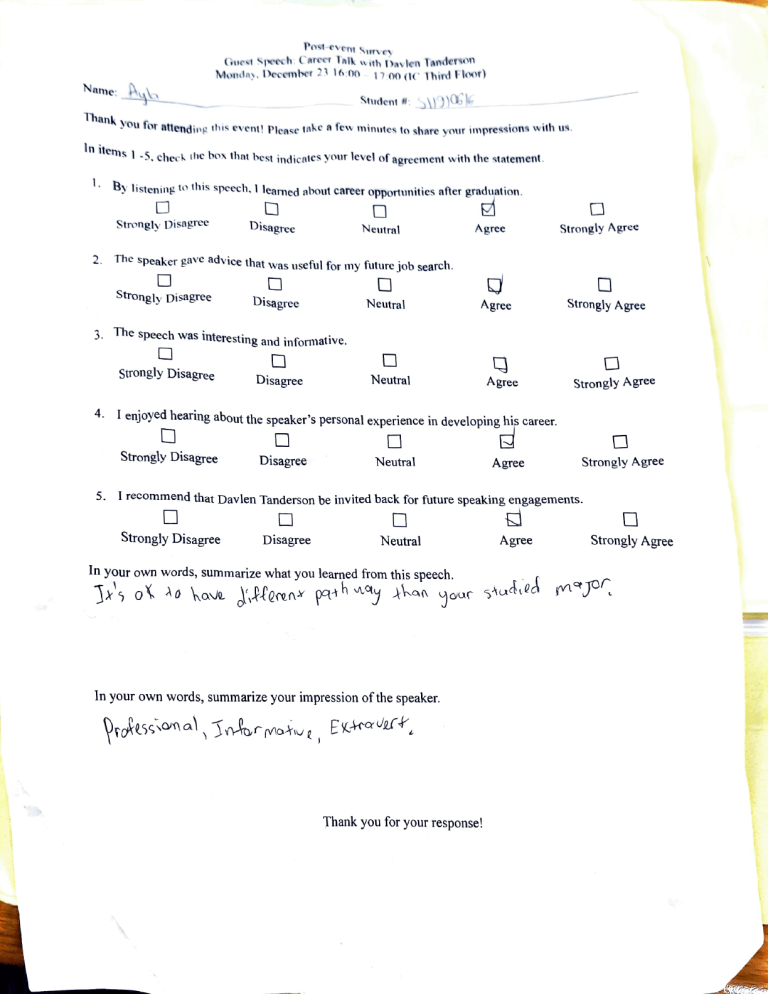 Post-cvent Survey Guest Spech: Career Taik with Davlen Tanderson Monday, December 23 16:00 Name: 17 00 ((C Ihird Floor) Student #: SU)®E Thank you attending this event! Please take afew minutes toshare vour impressions with us. In items l -S, check the box that best jndicates your level of agreement with the T: statement. By listening to this speech, Ilearmed about career opDortunities after graduation. Strongly Disagree Disagree Agree Strongly Agree Neutral Agree Strongly Agree Neutral Agree Strongly Agree Neutral 2. The speaker gave advice that was useful for my future job search. Strongly Disagree 3. The speech was interesting and informative. Strongly Disagree 4. Disagree I enjoyed hearing about the speaker's personal experience in developing his career. Strongly Disagree 5. Disagree Disagree Neutral Agree Strongly Agree Irecommend that Davlen Tanderson be invited back for future speaking engagements. Strongly Disagree Disagree Neutral Agree In your own words, summarize what you learned from this speech. Strongly Agree your studied mjor In your own words, summarize your impression of the speaker. Proessional, Jntbrmoiv, Exeavrt, Thank you for your response!