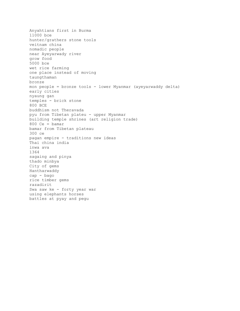 Anyahtians first in Burma 11000 bce hunter/grathers stone tools veitnam china nomadic people near Ayeyarwady river grow food 5000 bce wet rice farming one place instead of moving taungthaman bronze mon people = bronze tools - lower Myanmar (ayeyarwaddy delta) early cities nyaung gan temples - brick stone 800 BCE buddhism not Theravada pyu from Tibetan plateu - upper Myanmar building temple shrines (art religion trade) 800 Ce = bamar bamar from Tibetan plateau 300 ce pagan empire - traditions new ideas Thai china india inwa ava 1364 sagaing and pinya thado minbya City of gems Hantharwaddy cap - bago rice timber gems razadirit Swa saw ke - forty year war using elephants horses battles at pyay and pegu